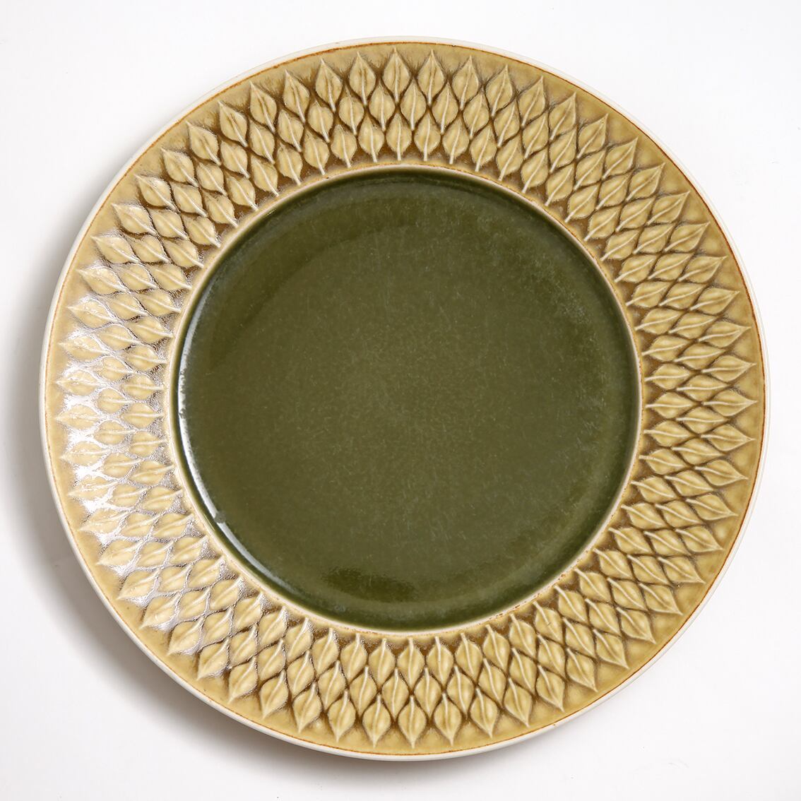 芥子色の地に葉のパターンが美しいRelief(レリーフ)シリーズの250mm皿です。辛子色の地に木の葉模様が並ぶデザイン。しっとりとした手ざわりと素朴な風合いのグラデーションが優しい人気のシリーズです。その製造は時を超え、Kronjyden(クロニーデン社)からNissen(ニッセン社)、B&G(ビングオーグレンダール社)へと引き継がれました。それぞれのロゴの入った個体とロゴのない(初期の品はシールのみ)個体があります。