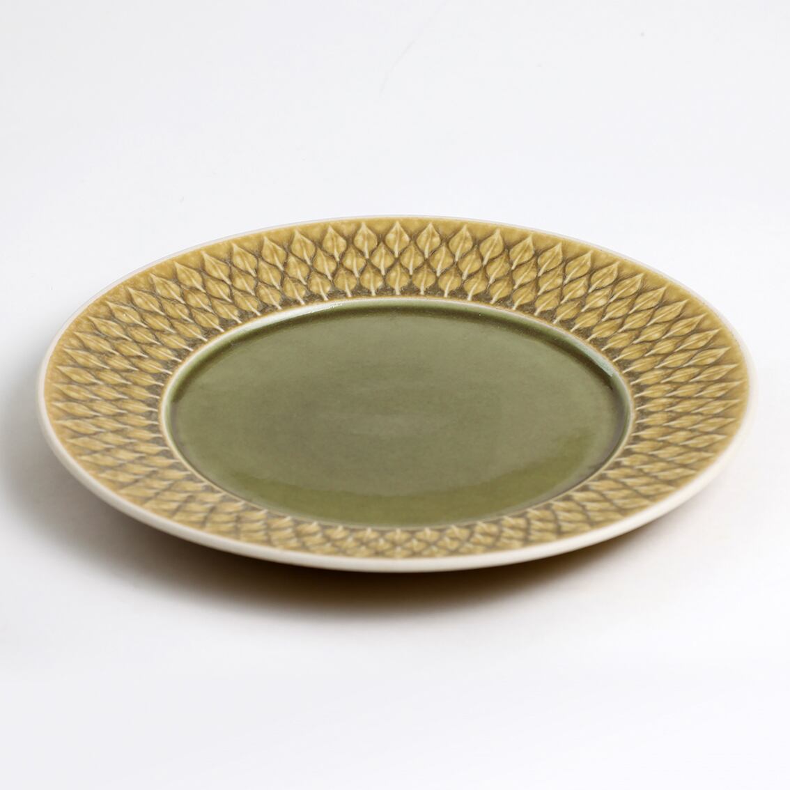 芥子色の地に葉のパターンが美しいRelief(レリーフ)シリーズの250mm皿です。辛子色の地に木の葉模様が並ぶデザイン。しっとりとした手ざわりと素朴な風合いのグラデーションが優しい人気のシリーズです。その製造は時を超え、Kronjyden(クロニーデン社)からNissen(ニッセン社)、B&G(ビングオーグレンダール社)へと引き継がれました。それぞれのロゴの入った個体とロゴのない(初期の品はシールのみ)個体があります。