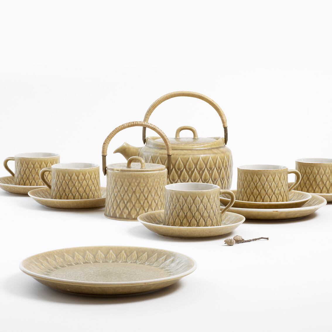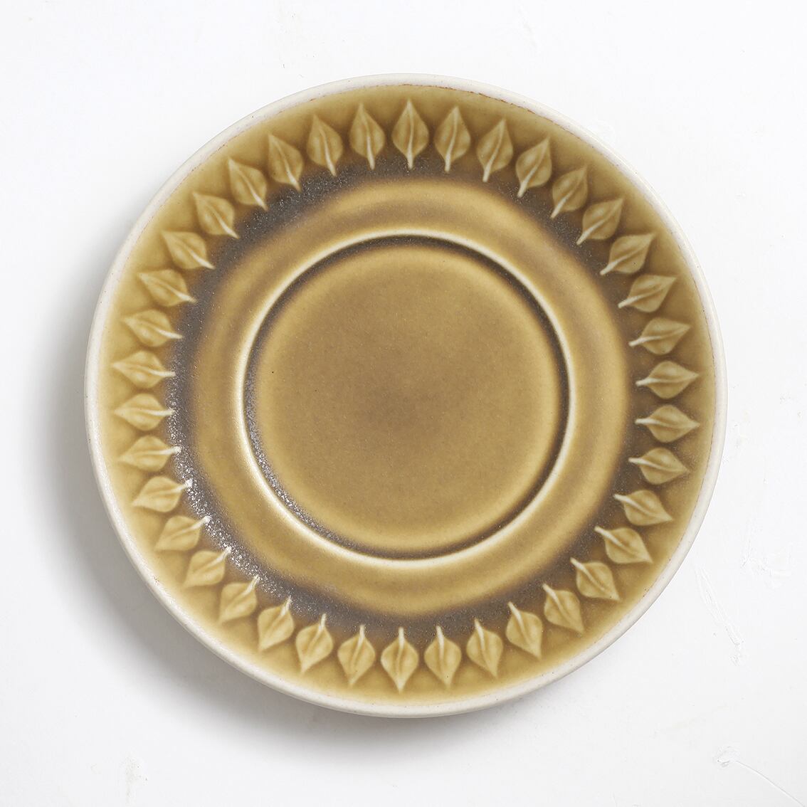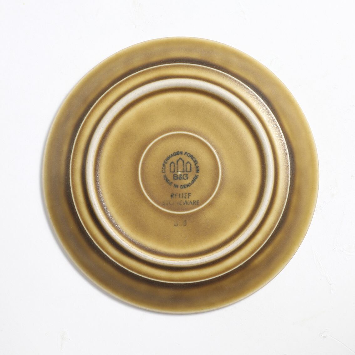 辛子色の地に木の葉模様が並ぶデザイン。しっとりとした手ざわりと素朴な風合いのグラデーションが優しい人気のシリーズです。その製造は時を超え、Kronjyden(クロニーデン社)からNissen(ニッセン社)、B&G(ビングオーグレンダール社)へと引き継がれました。それぞれのロゴの入った個体とロゴのない(初期の品はシールのみ)個体があります。こちらはB&G(ビングオーグレンダール社)の品です。