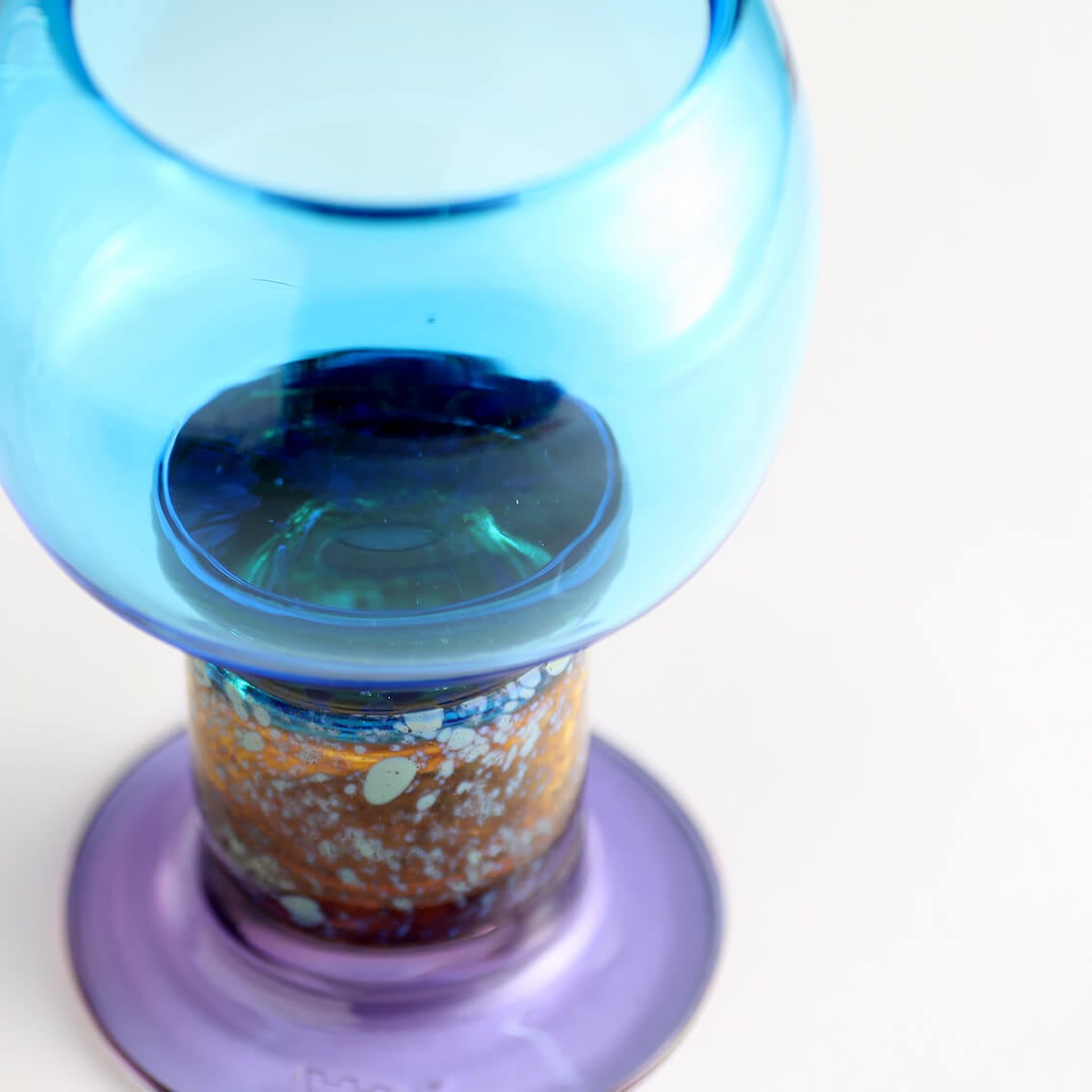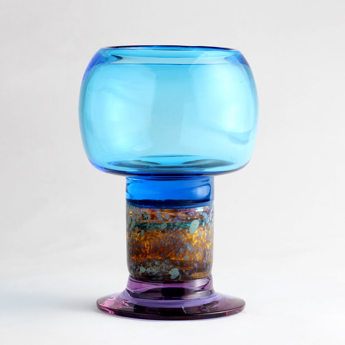 ポカーリはフィンランド語でトロフィーの意味。1点1点回転させながら作る型吹き(mold-blowing)技法で制作されており、太いステム(脚)は空洞になっています。3色のガラス(ボウル、ステム、フット)で構成されたカイ・フランクの名作は1972年から5年間のみ制作されました。シリーズにはさまざまな配色があり、こちらは青いボウル、琥珀色のステム、菫色のフットを組み合わせた美しい一品です。ステムには古代の青銅杯の緑青を思わせる模様があしらわれており、高貴なたたずまいを醸し出しています。