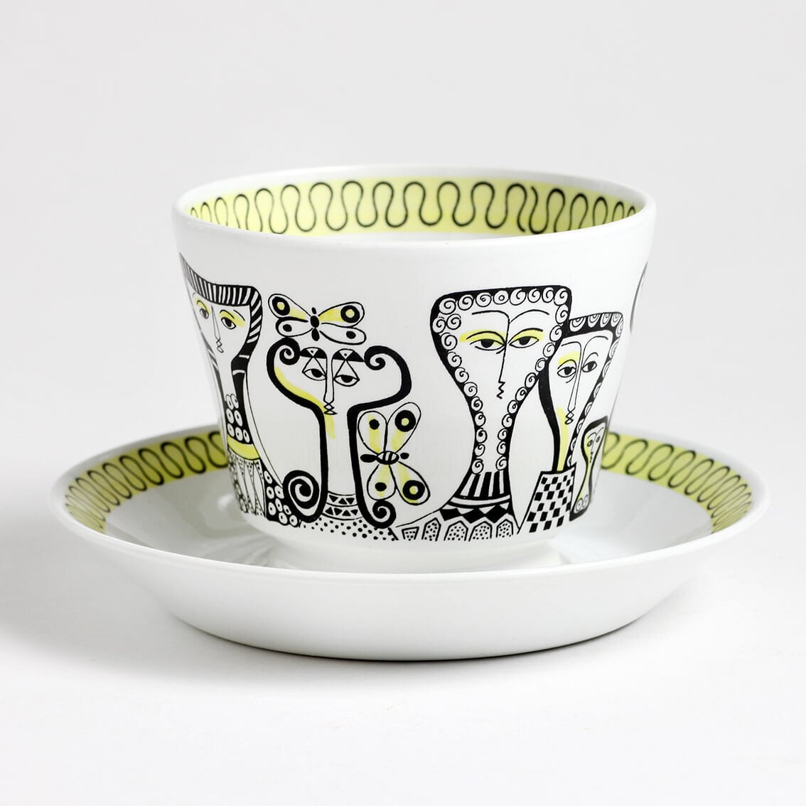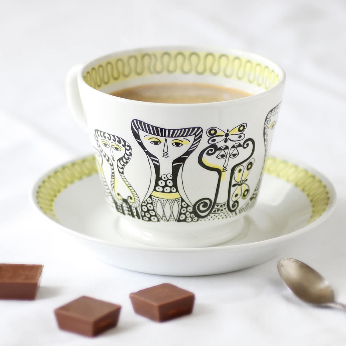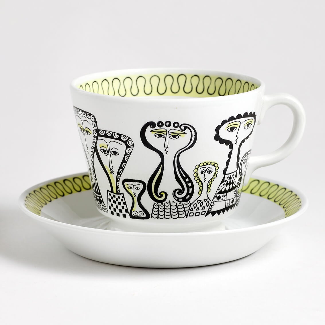 ラヴェンナはイタリアのアドリア海に臨むビザンツ帝国の都として栄えた街。カップに描かれているミッドセンチュリーなイラストは、今もラヴェンナの街中でよく見かけるビザンチン時代のモザイク画の人々を大胆にアレンジしたものでしょう。顔立ちやファッションが一人一人異なり、眺めているだけで朝から楽しい気分になれそう。ほんのり着彩されたレモン色は街に降り注ぐ陽光を感じさせます。