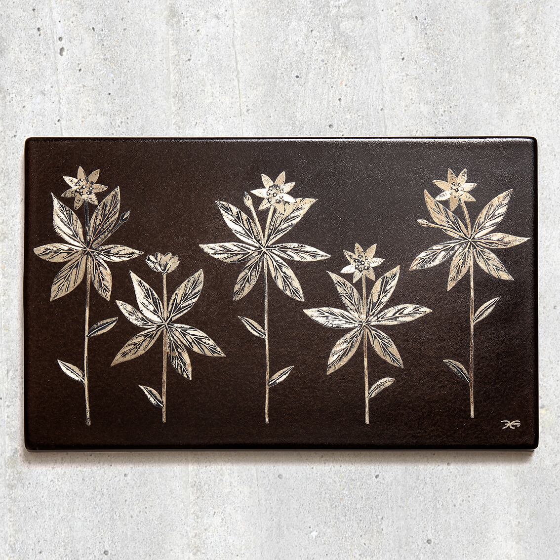 Heinz Erret(ハインツ・エレット)が1972年に制作した壁掛けシリーズProvincial Flowers(各地の花)には、スウェーデンの25の地域(Landsting/ランスティング)を代表する花がそれぞれ銀色に描かれています。こちらはVärmland(ヴェルムランド)県の花、ツマトリソウ(Skogsstjärna)で直訳すると「森の星」。木陰にきらめく星のような白い花は、その可憐さから純真という花言葉を授けられました。こちらの陶板のようにすべて銀色で描かれていると、花の下の葉も星のように広がっているのが分かります。5本のツマトリソウのリズミカルな並び方も楽しい作品です。