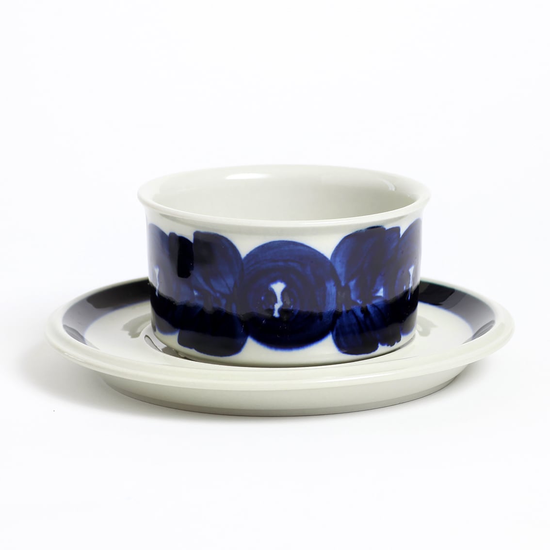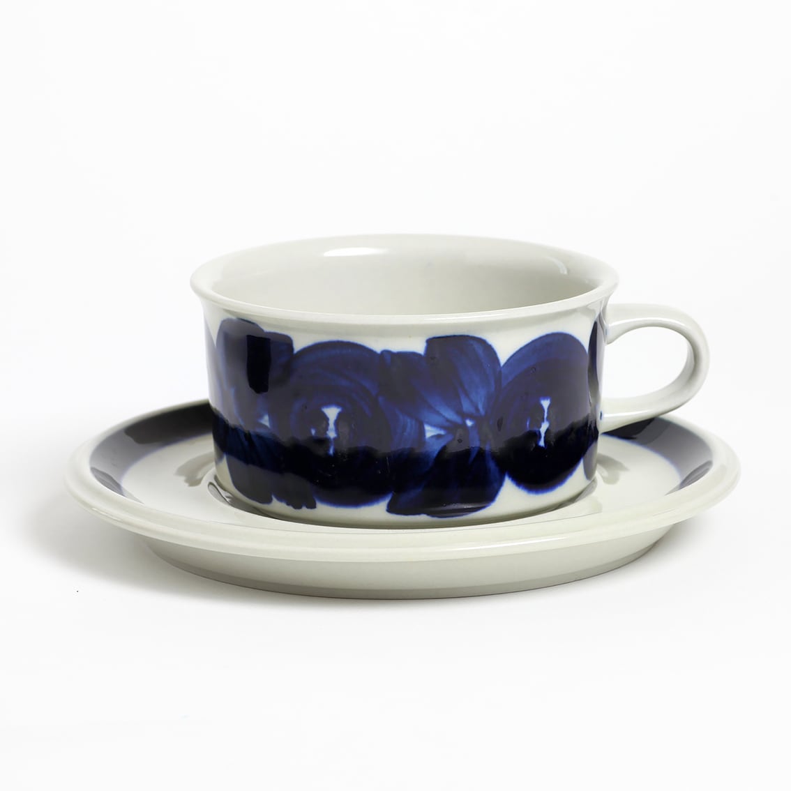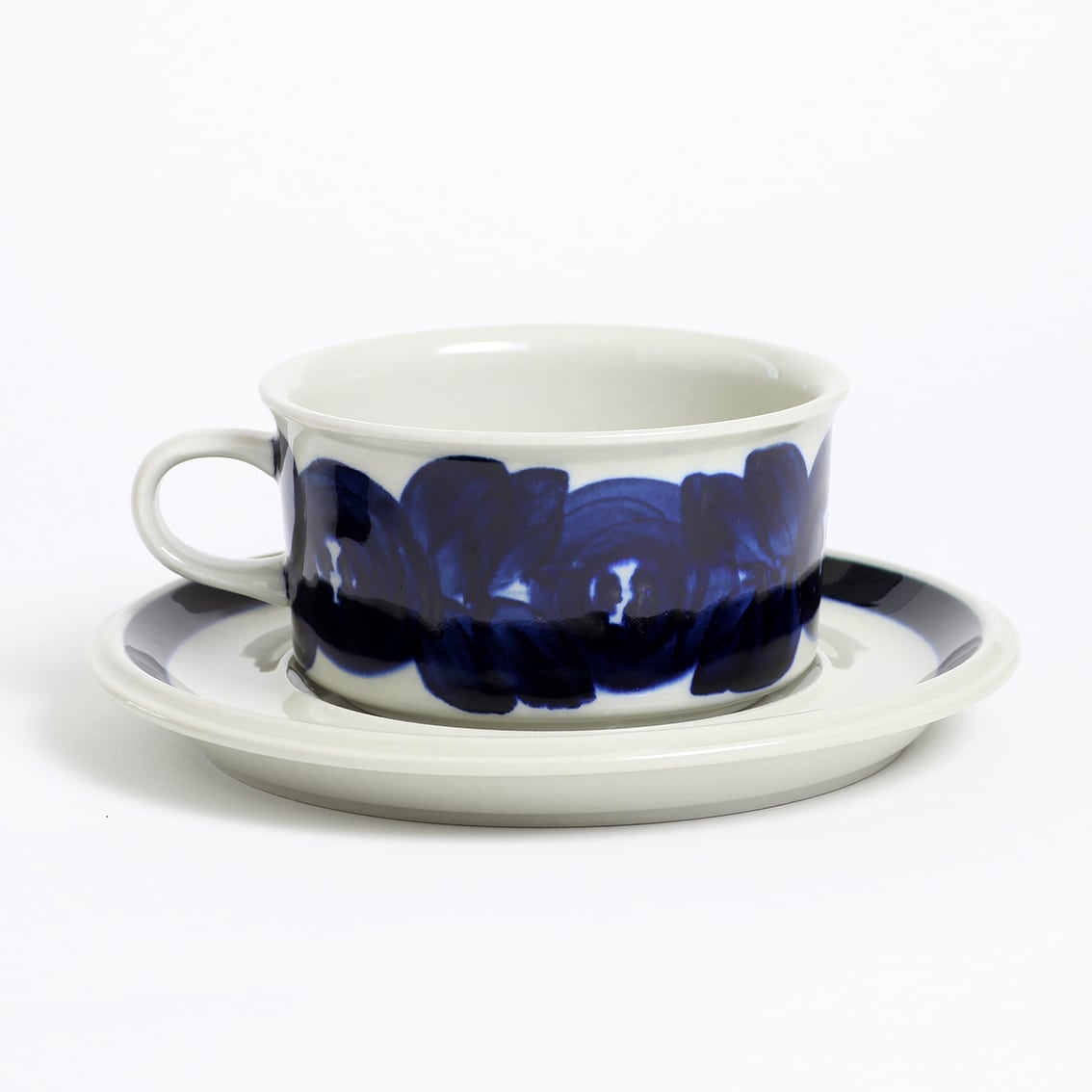 アラビアの代表的なデザイナーUlla Procope(ウラ・プロコペ)がデザインしたAnemone(アネモネ)シリーズのティーカップ&ソーサーです。ブルーベリーのような深みのある青が大変美しく、一点一点手描きされた丸い花柄は大胆で伸びやか。絵筆の余韻を感じさせるやわらかな絵柄をソーサーの太いストライプがきりりと引き締めています。スープやデザートにも活躍してくれそうなフォルムです。