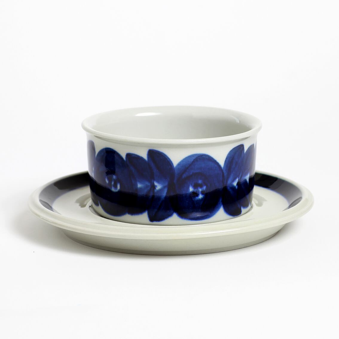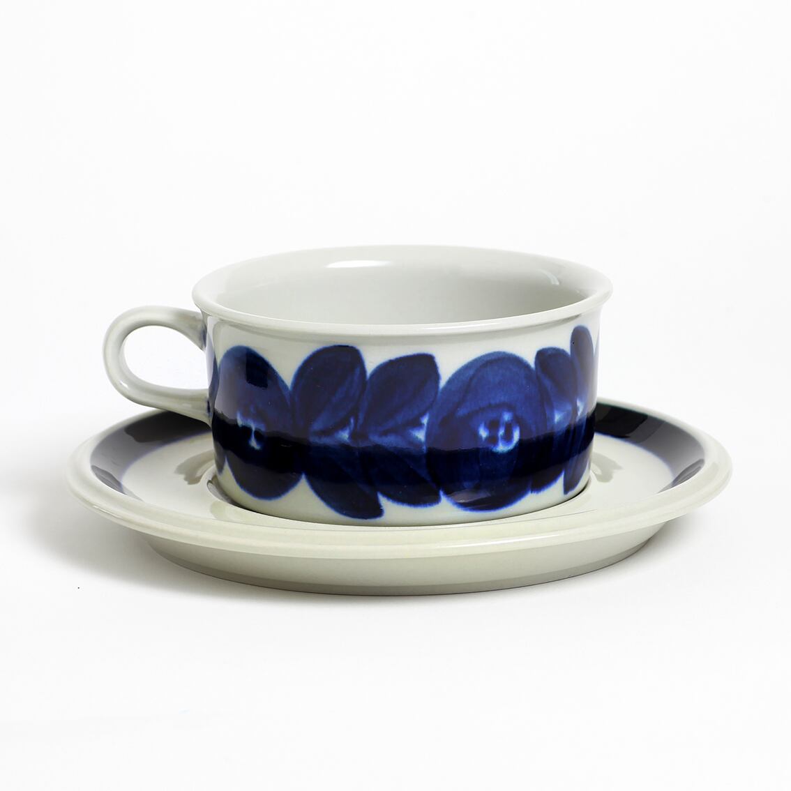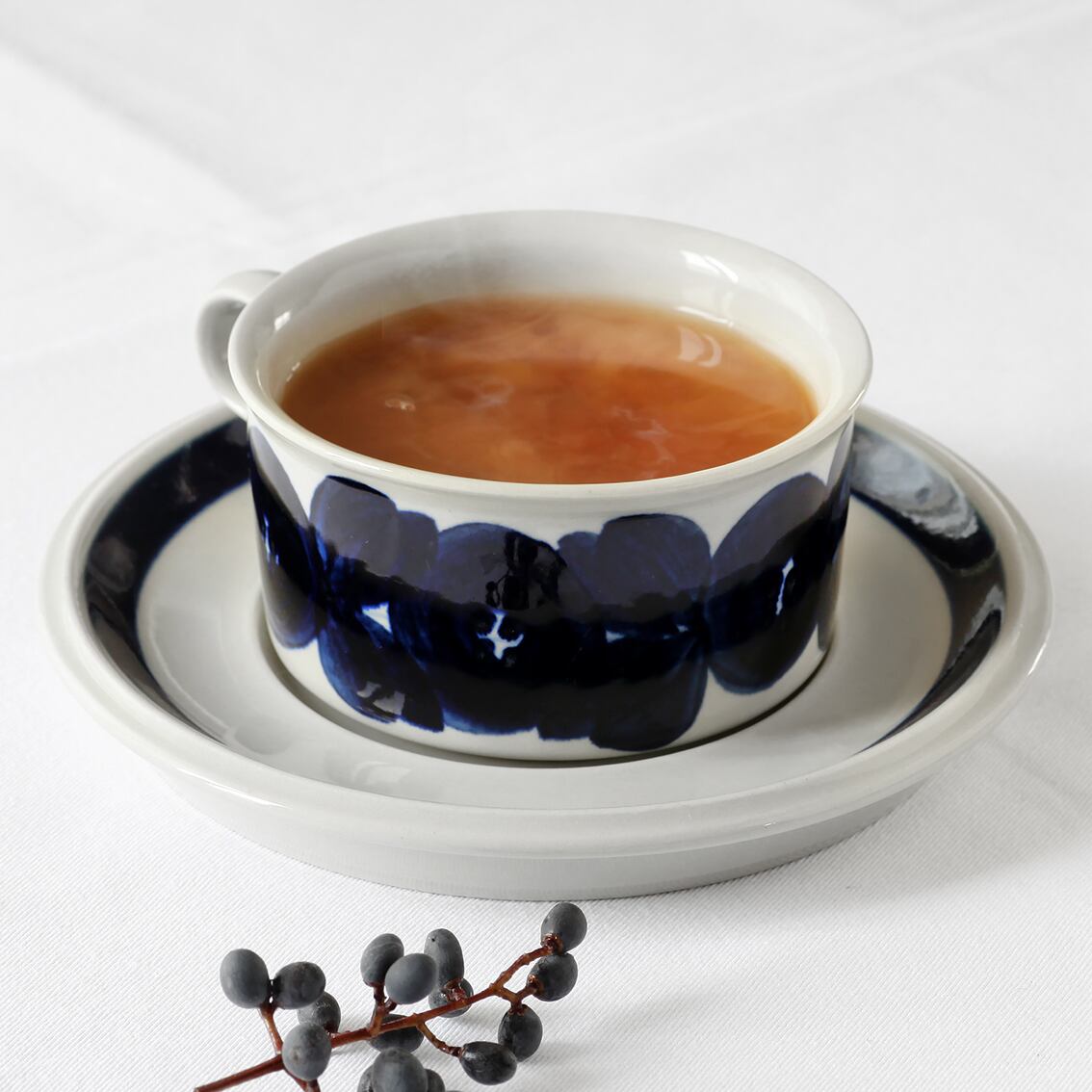 アラビアの代表的なデザイナーUlla Procope(ウラ・プロコペ)がデザインしたAnemone(アネモネ)シリーズのティーカップ&ソーサーです。ブルーベリーのような深みのある青が大変美しく、一点一点手描きされた丸い花柄は大胆で伸びやか。絵筆の余韻を感じさせるやわらかな絵柄をソーサーの太いストライプがきりりと引き締めています。スープやデザートにも活躍してくれそうなフォルムです。