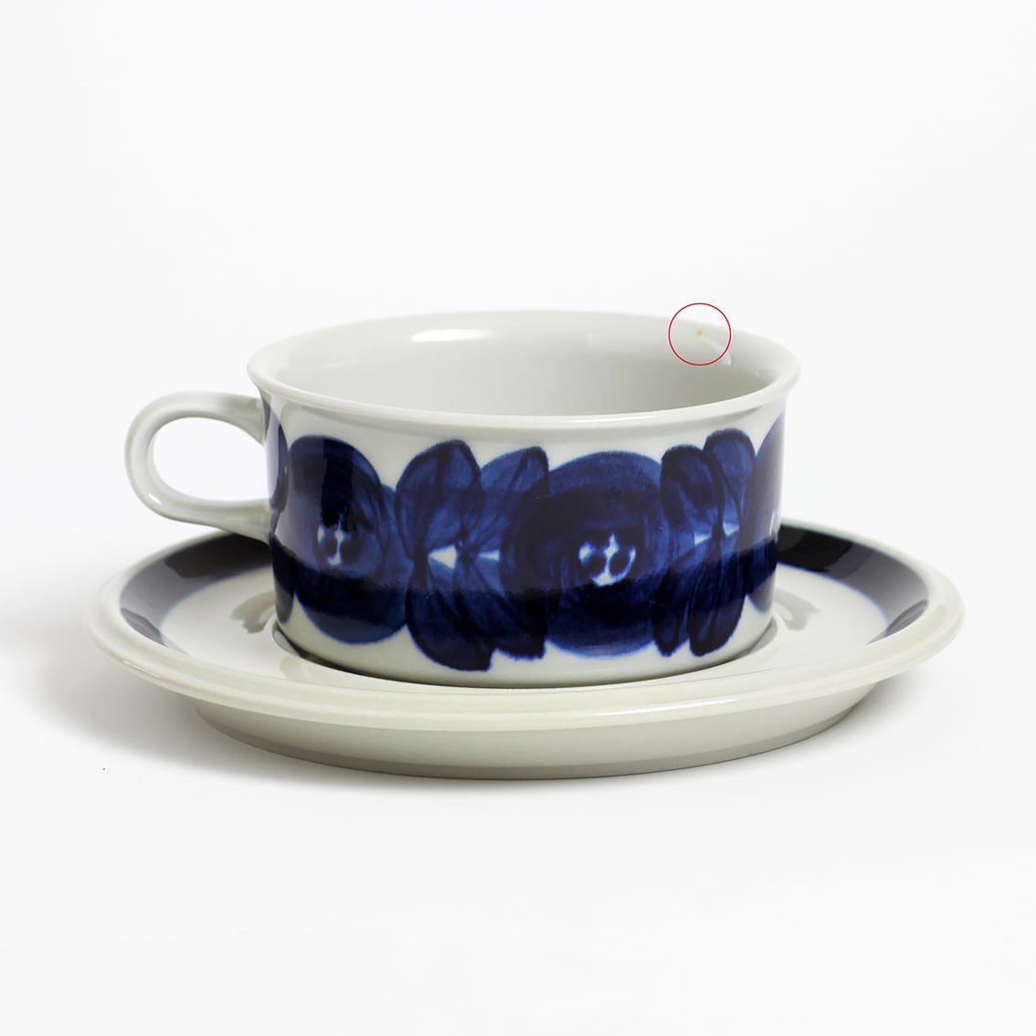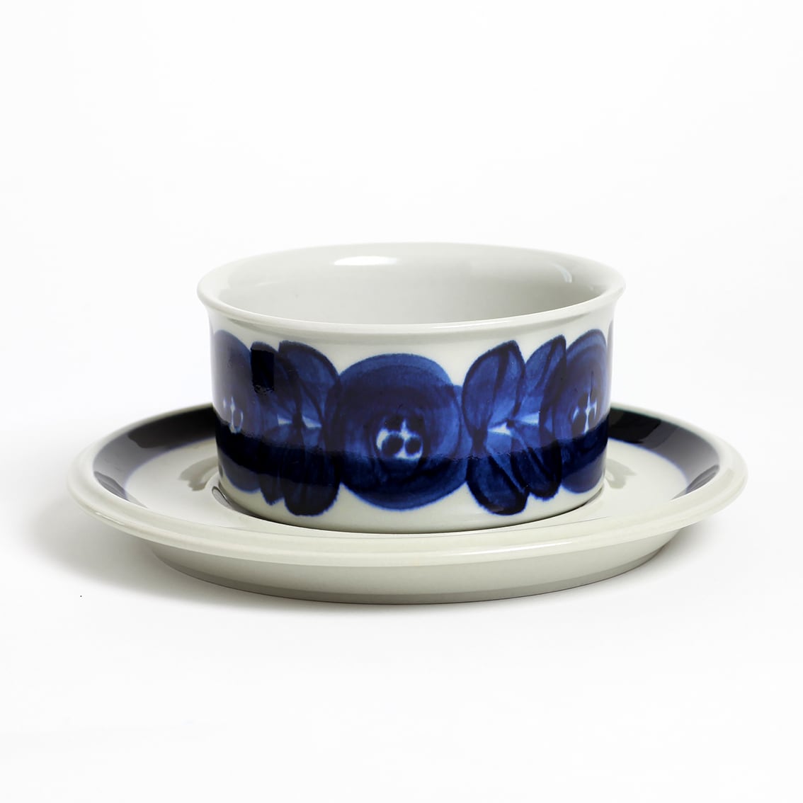 アラビアの代表的なデザイナーUlla Procope(ウラ・プロコペ)がデザインしたAnemone(アネモネ)シリーズのティーカップ&ソーサーです。ブルーベリーのような深みのある青が大変美しく、一点一点手描きされた丸い花柄は大胆で伸びやか。絵筆の余韻を感じさせるやわらかな絵柄をソーサーの太いストライプがきりりと引き締めています。スープやデザートにも活躍してくれそうなフォルムです。