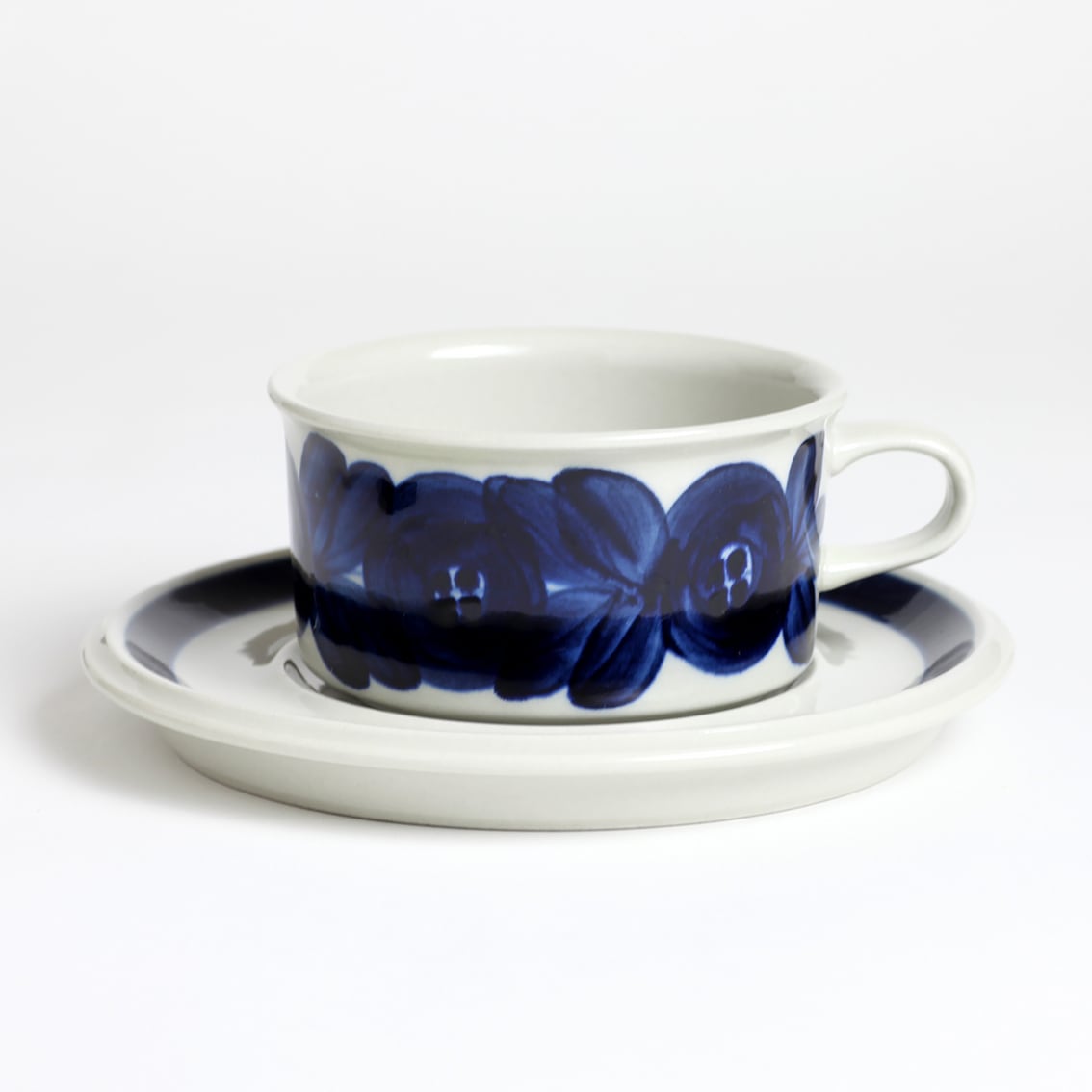 アラビアの代表的なデザイナーUlla Procope(ウラ・プロコペ)がデザインしたAnemone(アネモネ)シリーズのティーカップ&ソーサーです。ブルーベリーのような深みのある青が大変美しく、一点一点手描きされた丸い花柄は大胆で伸びやか。絵筆の余韻を感じさせるやわらかな絵柄をソーサーの太いストライプがきりりと引き締めています。スープやデザートにも活躍してくれそうなフォルムです。