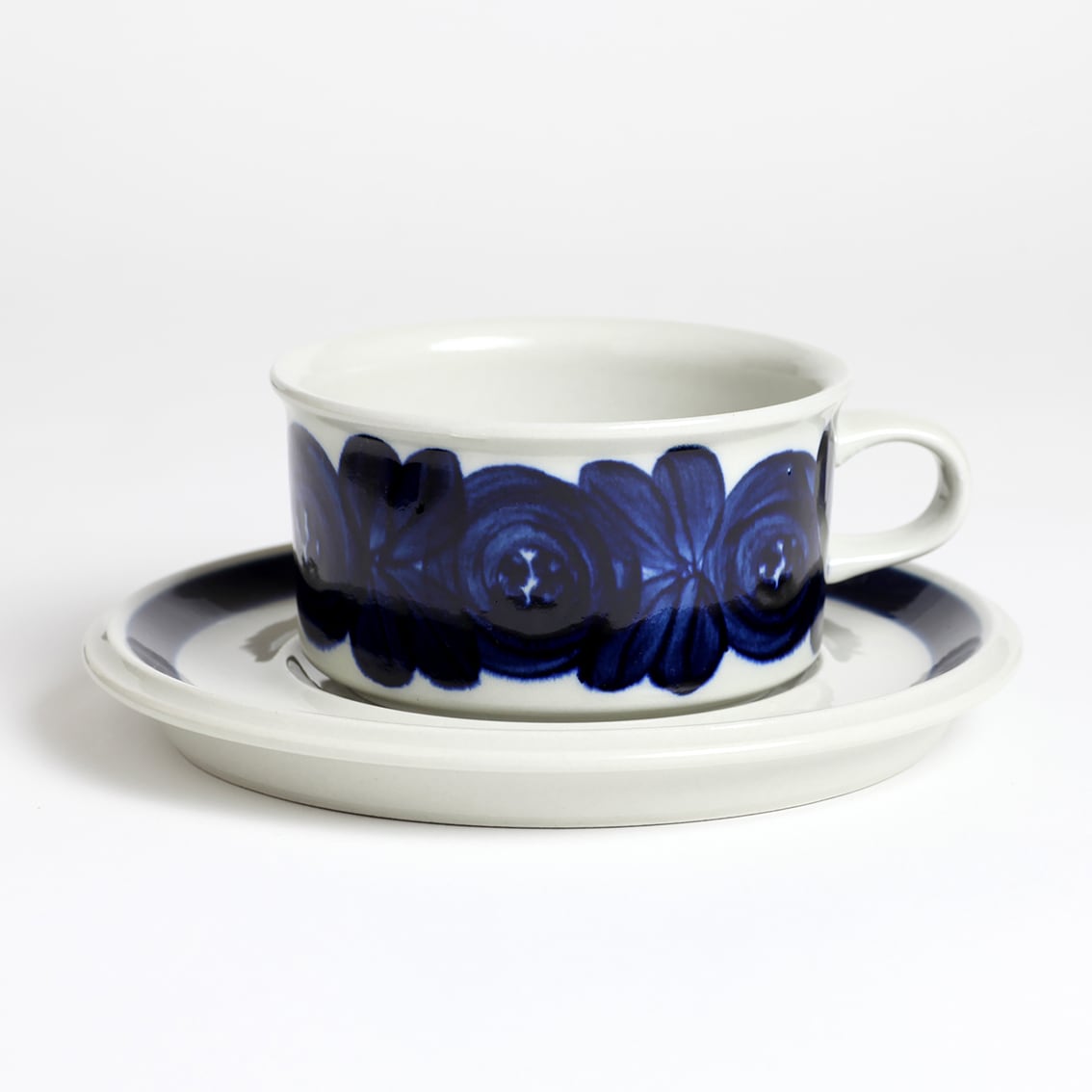 アラビアの代表的なデザイナーUlla Procope(ウラ・プロコペ)がデザインしたAnemone(アネモネ)シリーズのティーカップ&ソーサーです。ブルーベリーのような深みのある青が大変美しく、一点一点手描きされた丸い花柄は大胆で伸びやか。絵筆の余韻を感じさせるやわらかな絵柄をソーサーの太いストライプがきりりと引き締めています。スープやデザートにも活躍してくれそうなフォルムです。