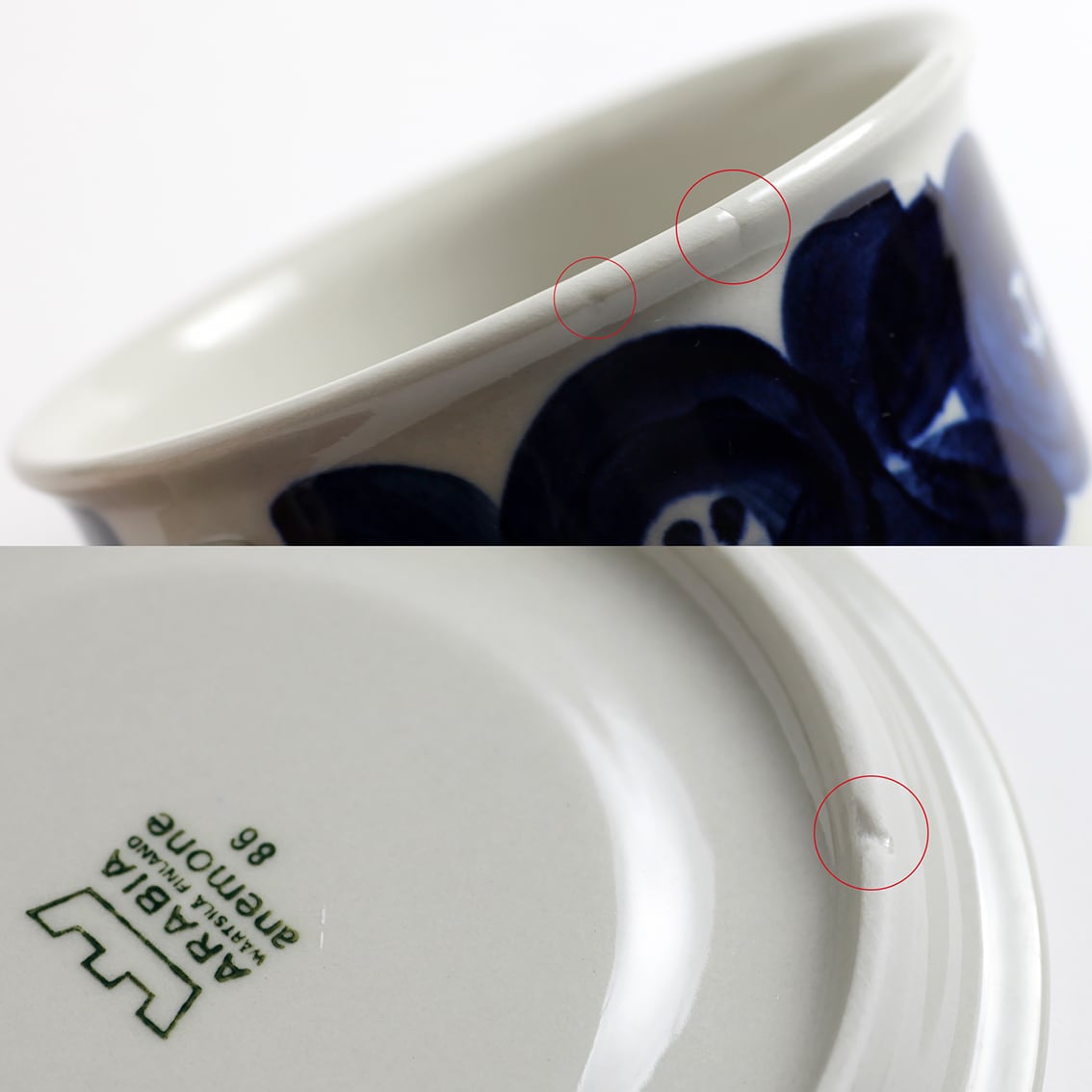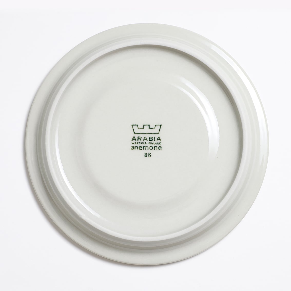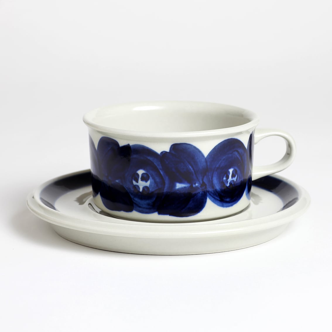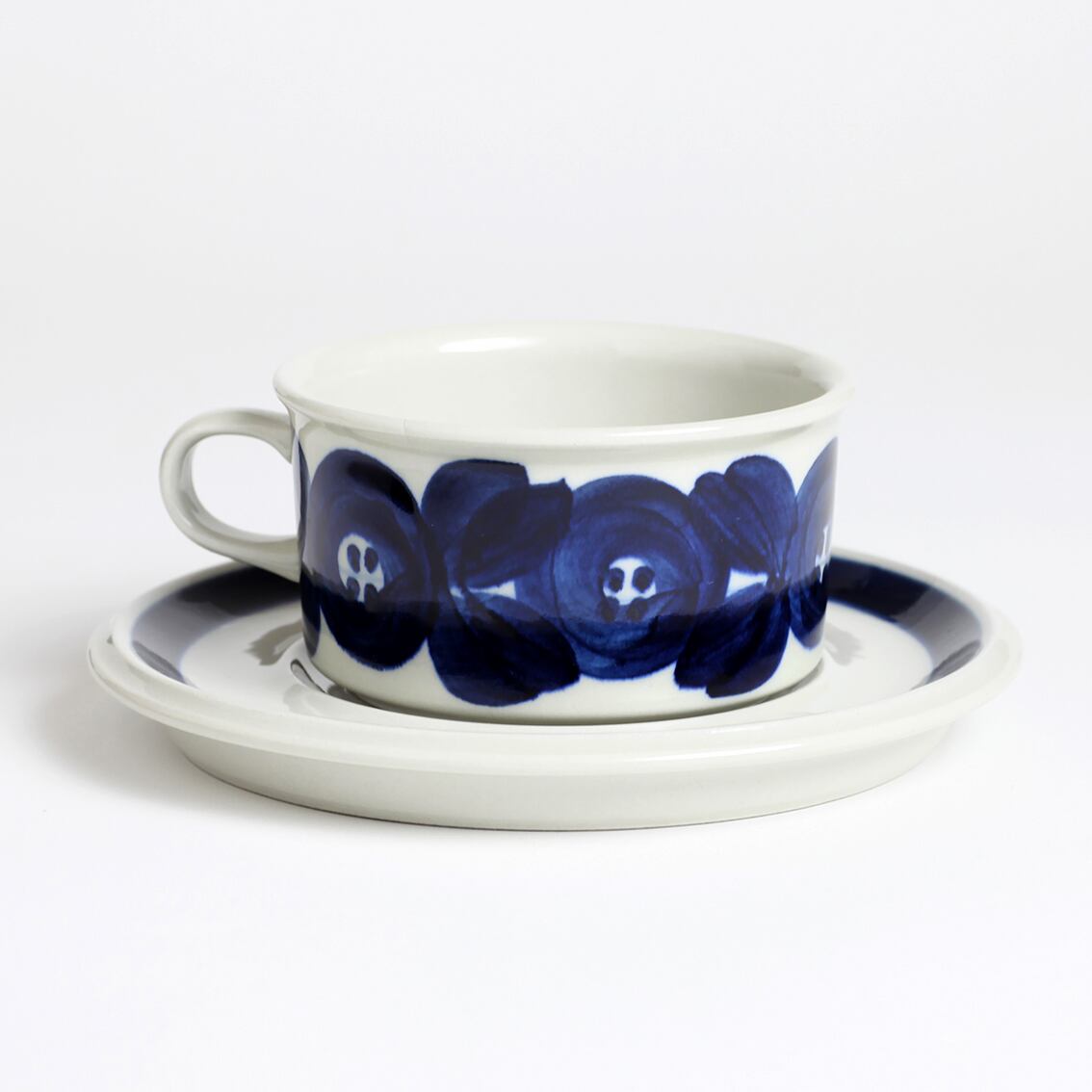 アラビアの代表的なデザイナーUlla Procope(ウラ・プロコペ)がデザインしたAnemone(アネモネ)シリーズのティーカップ&ソーサーです。ブルーベリーのような深みのある青が大変美しく、一点一点手描きされた丸い花柄は大胆で伸びやか。絵筆の余韻を感じさせるやわらかな絵柄をソーサーの太いストライプがきりりと引き締めています。スープやデザートにも活躍してくれそうなフォルムです。