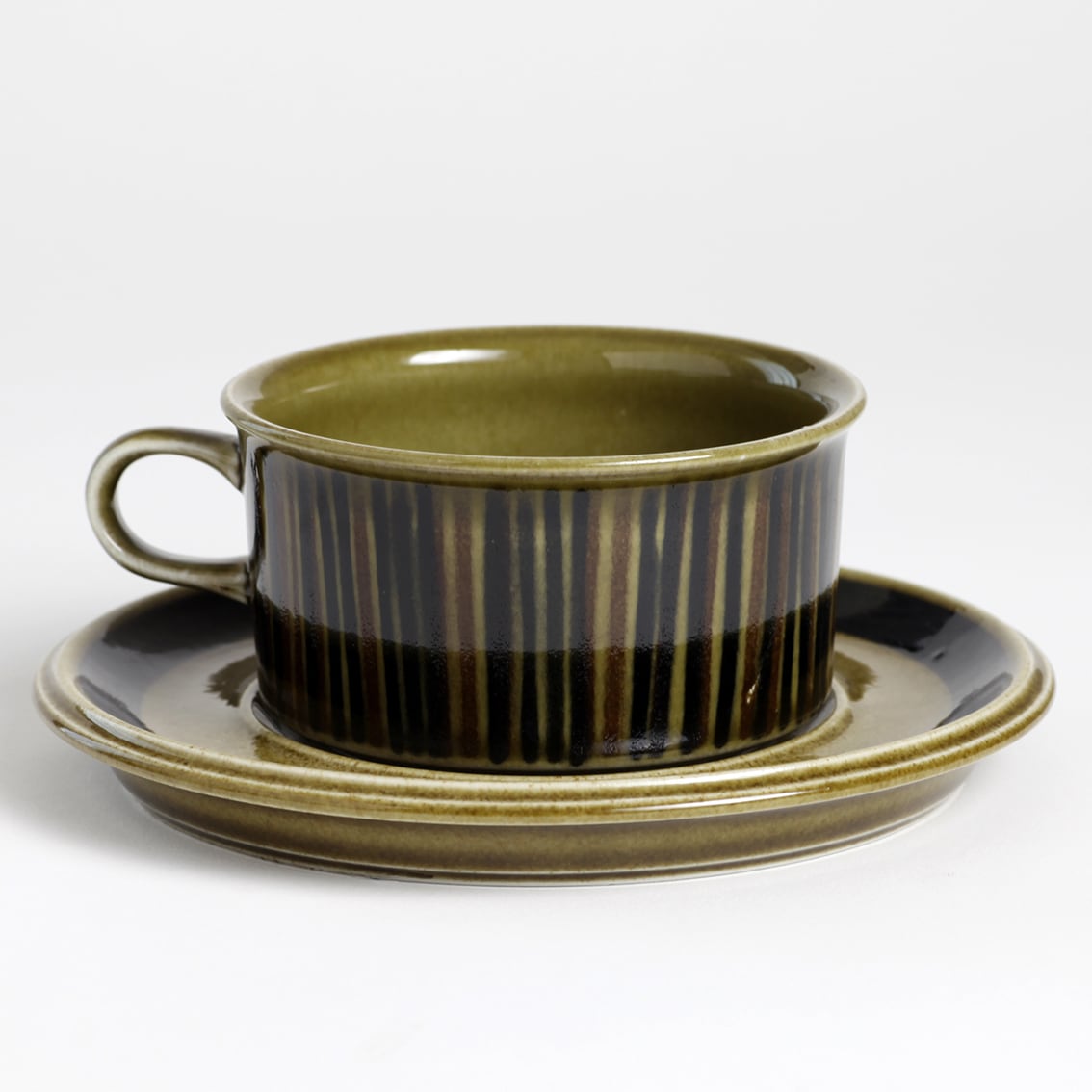 デザインはグンヴァル・オリン・グラングヴィスト。オリーブブラウンの地にランダムな縦のストライプが手描きされており、ソーサーは花のように見えます。フォルムデザインはウラ・プロコペ。コスモスシリーズは2色展開で青も作られました。こちらは落ち着いた色調で温かみのあるブラウン系です。
