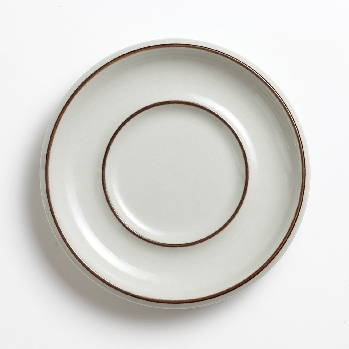 淡くくすんだベージュのカップとソーサーの縁に濃いブラウンのラインが入っただけのシンプルなデコレーション。究極のふだん使いと呼びたいデザインです。やや肉厚なフォルムはやルスカなどでおなじみのSモデル。フォルム、デコレーション共にUlla Procope(ウラ・プロコペ)の作品です。