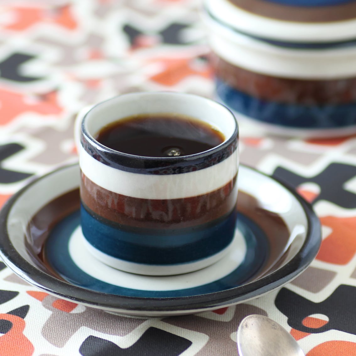 デザインはカレリアやサーラなどのシリーズで知られるAnja Jaatinen Winqvist(アンヤ・ヤーティネン・ウィンクヴィスト)。手書きされた紺と茶の太い帯と、黒い帯。シンプルな構成でありながら、どこか極北の風景のような趣も感じられ、安らぎのひとときになじみます。