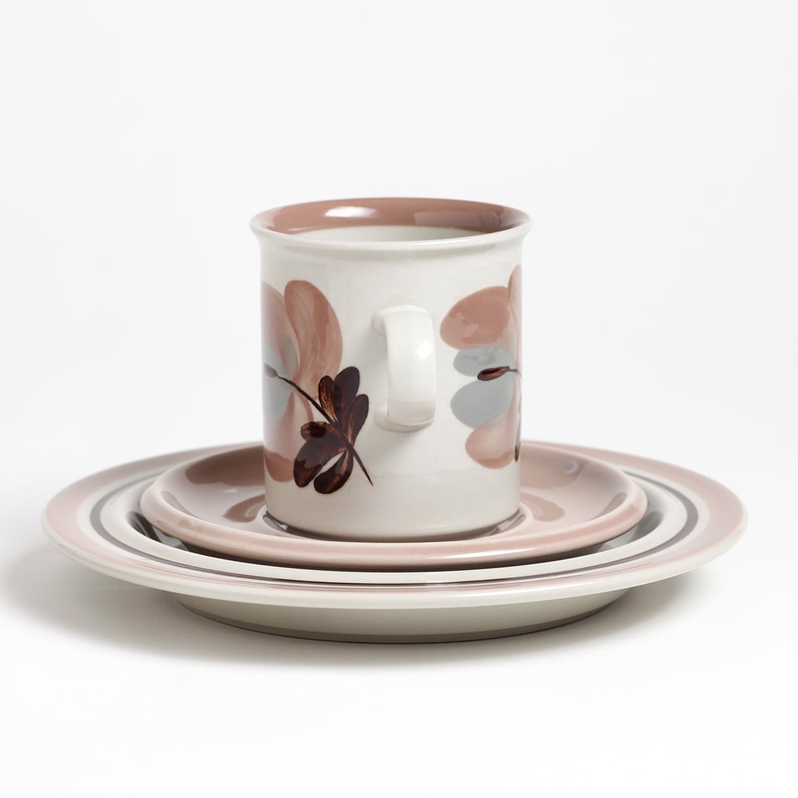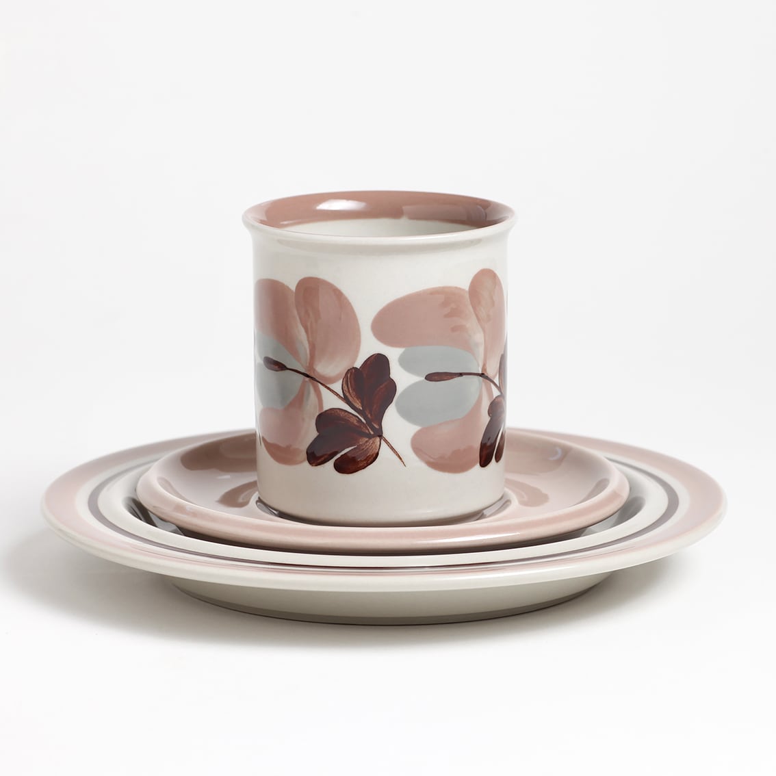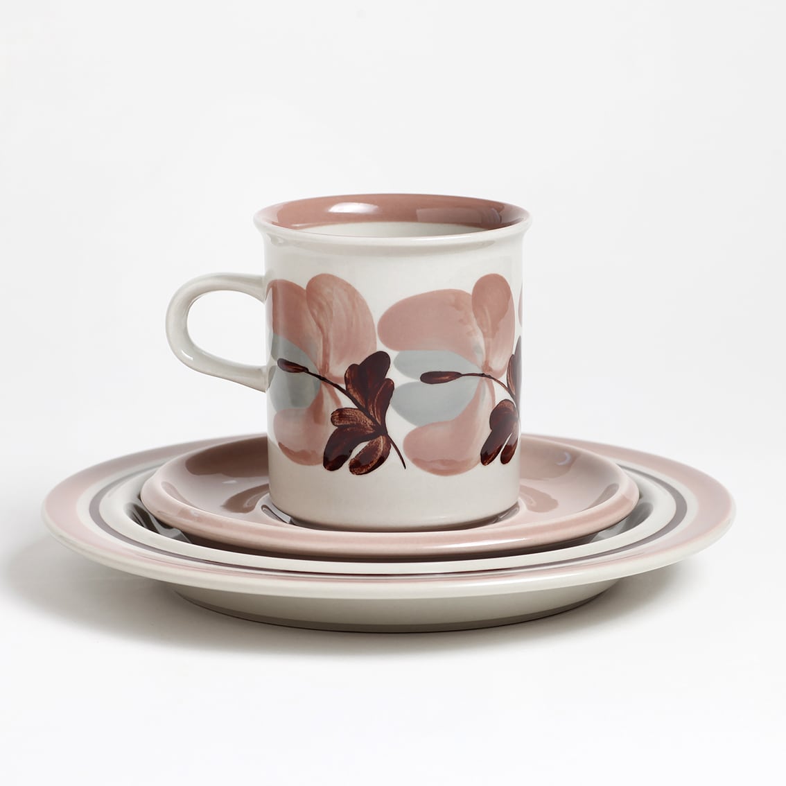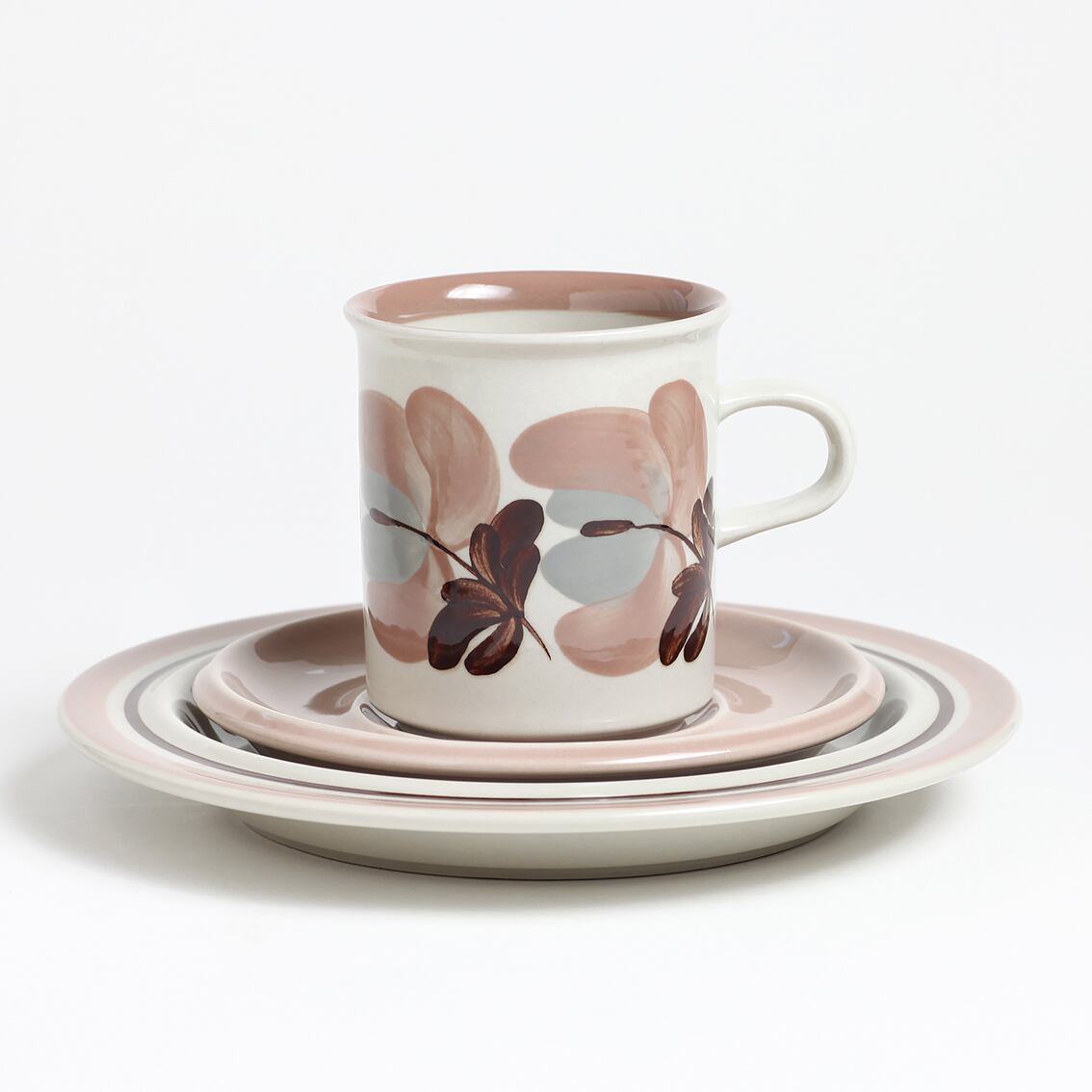 上品な色づかいが美しいKoralli(コラーリ)シリーズのコーヒーカップ&ソーサー、プレートの3点セットです。Koralliはフィンランド語で珊瑚(Coral)ですが、花の色はコーラルピンクというよりも淡いピンクベージュやスモーキーピンクに近い印象。そよ風にゆれる花をRaija Uosikkinen(ライヤ・ウオシッキネン)がぽってりと優しく描きました。フォルムデザインはUlla Procope(ウラ・プロコペ)。製造数の少なさに加え、ここ数年の世界的な人気の高まりで入手が難しくなっているシリーズです。