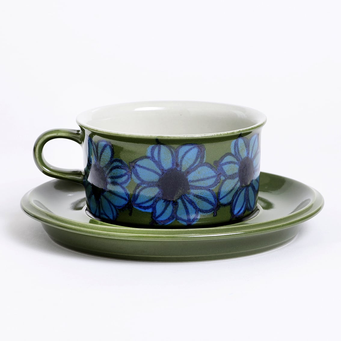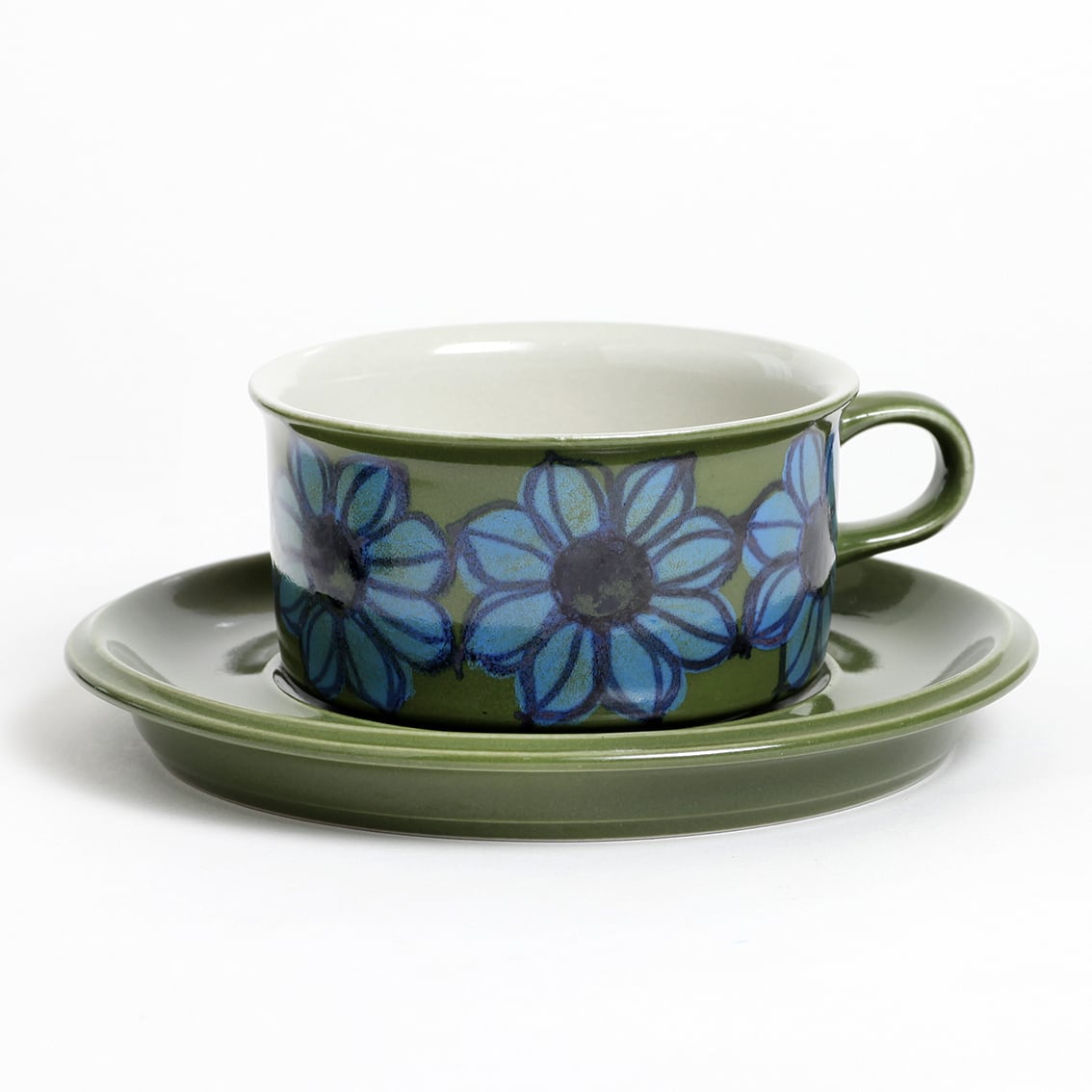 アラビア社(ARABIA)アート部門の Hilkka-Lisa Ahola(ヒルッカ・リーサ・アホラ)が1960年代にデザインしたティーカップ&ソーサーです。1点1点職人が手描きしているため同じものがありません。オリーブグリーンの地に紺色と水色の大胆な色づかいで大きな花が伸び伸びと描かれています。同社のアート部門を代表するデザイナー、ヒルッカ・リーサ・アホラならではの自由な色彩感覚が美しく花ひらいた逸品です。