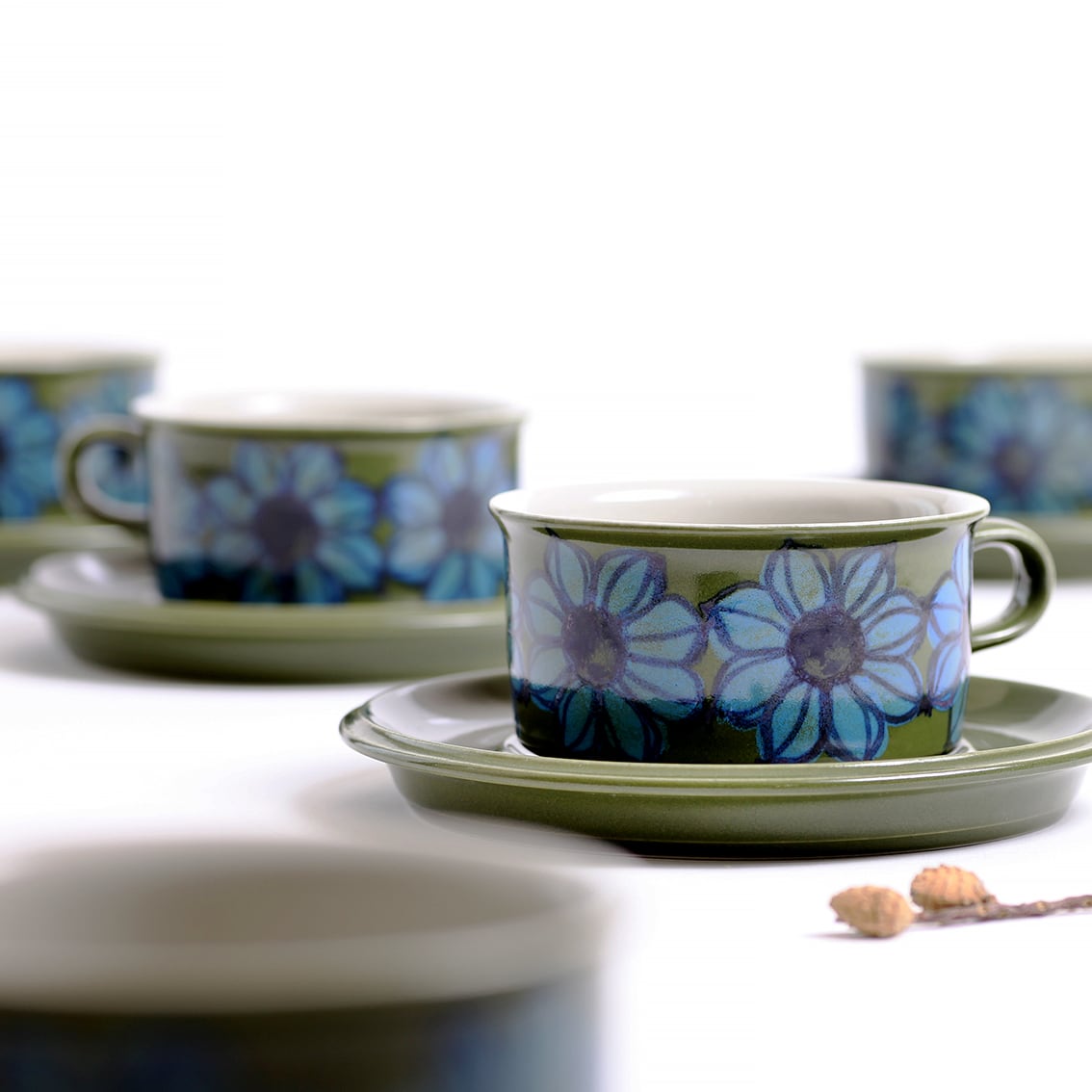 アラビア社(ARABIA)アート部門の Hilkka-Lisa Ahola(ヒルッカ・リーサ・アホラ)が1960年代にデザインしたティーカップ&ソーサーです。1点1点職人が手描きしているため同じものがありません。オリーブグリーンの地に紺色と水色の大胆な色づかいで大きな花が伸び伸びと描かれています。同社のアート部門を代表するデザイナー、ヒルッカ・リーサ・アホラならではの自由な色彩感覚が美しく花ひらいた逸品です。