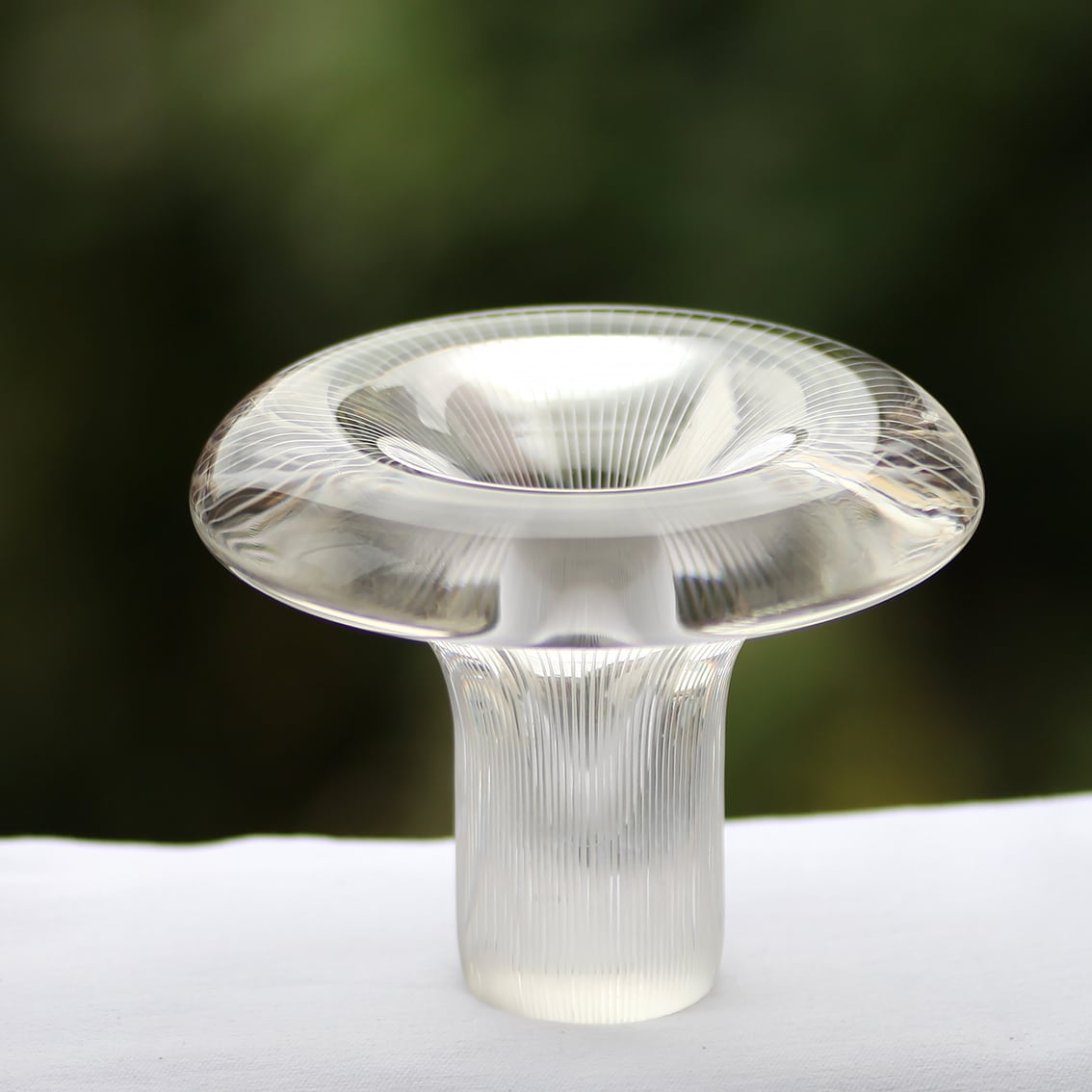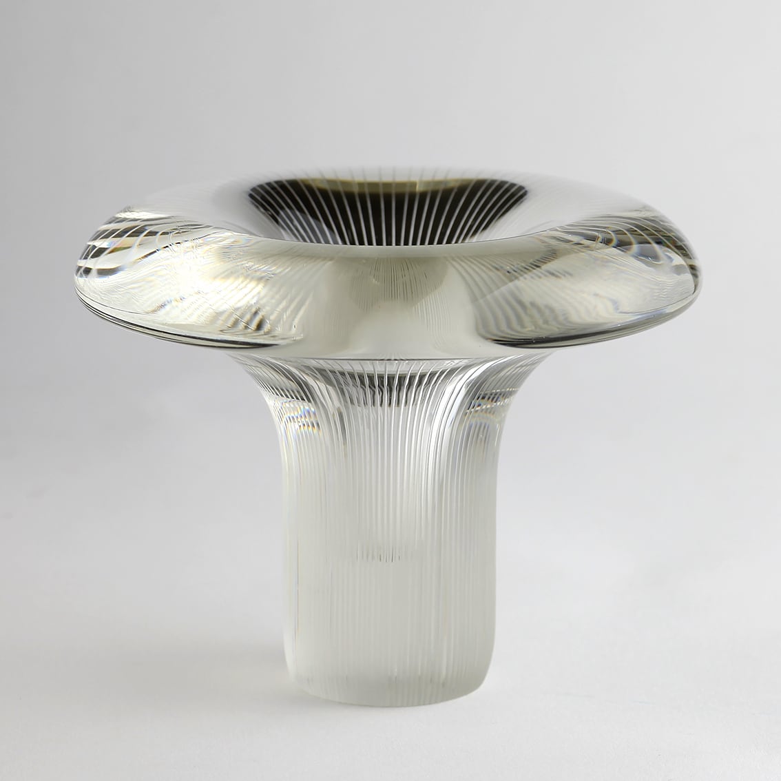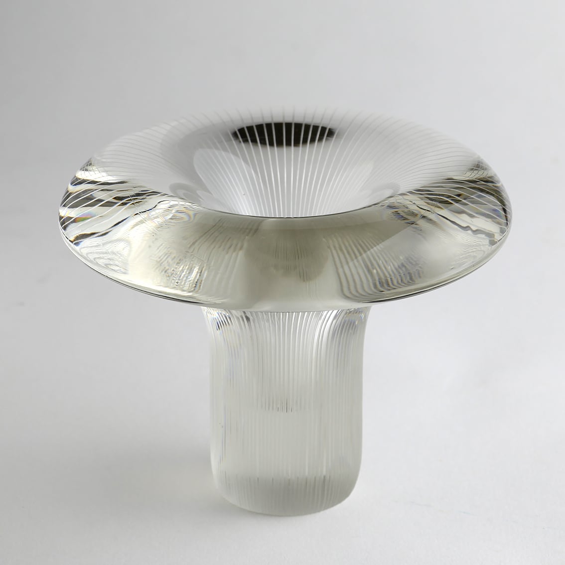 タッティはフィンランド語でキノコ(とくにポルチーニ茸)。3つのサイズが作られたアートガラスのシリーズで、こちらは中間のサイズです。安定感のある太い柄。その周囲に刻まれた繊細なラインカットは傘の裏側まで伸びやかに続いています。傘の上から見える放射状の光の筋はこのひだが透けて見えているのです。