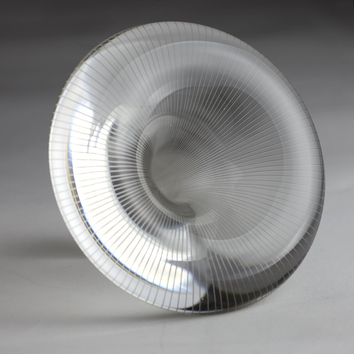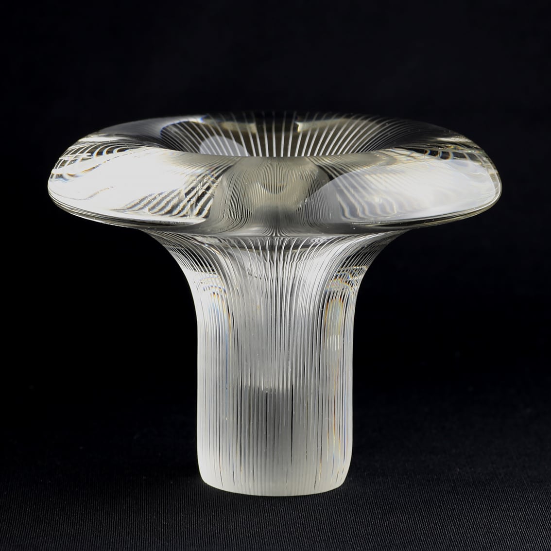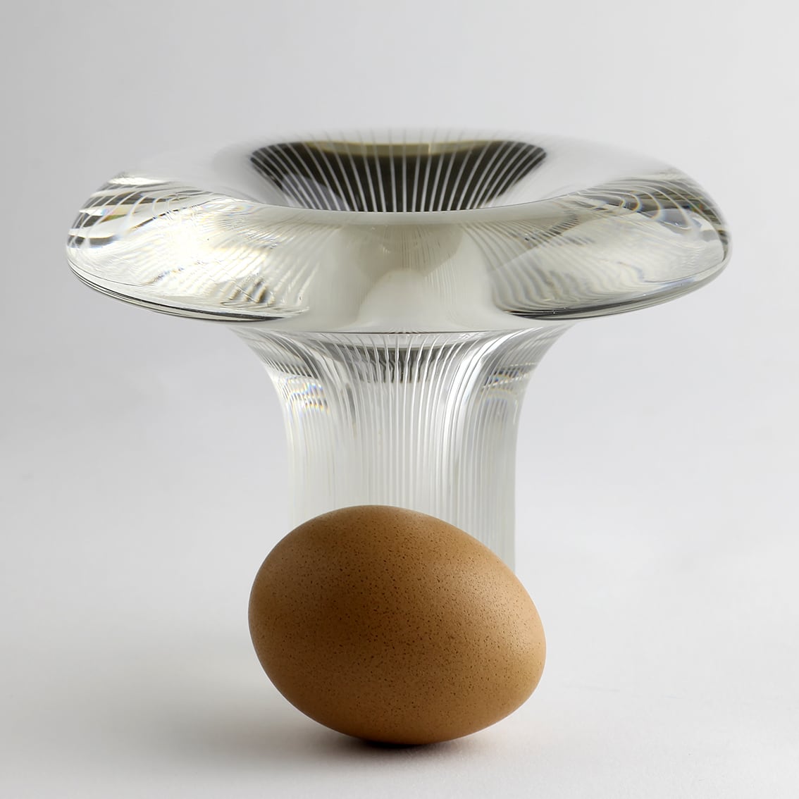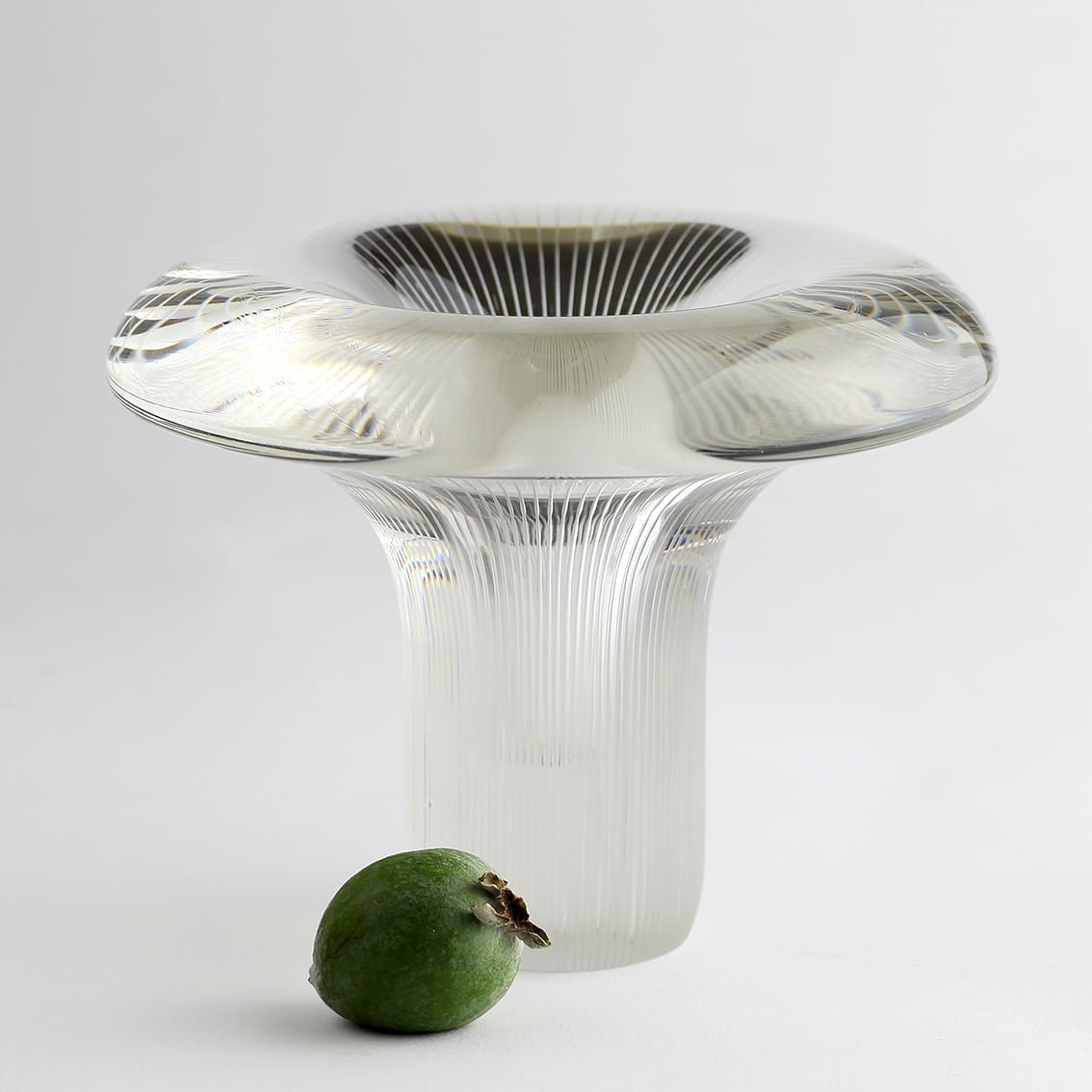 タッティはフィンランド語でキノコ(とくにポルチーニ茸)。3つのサイズが作られたアートガラスのシリーズで、こちらは中間のサイズです。安定感のある太い柄。その周囲に刻まれた繊細なラインカットは傘の裏側まで伸びやかに続いています。傘の上から見える放射状の光の筋はこのひだが透けて見えているのです。