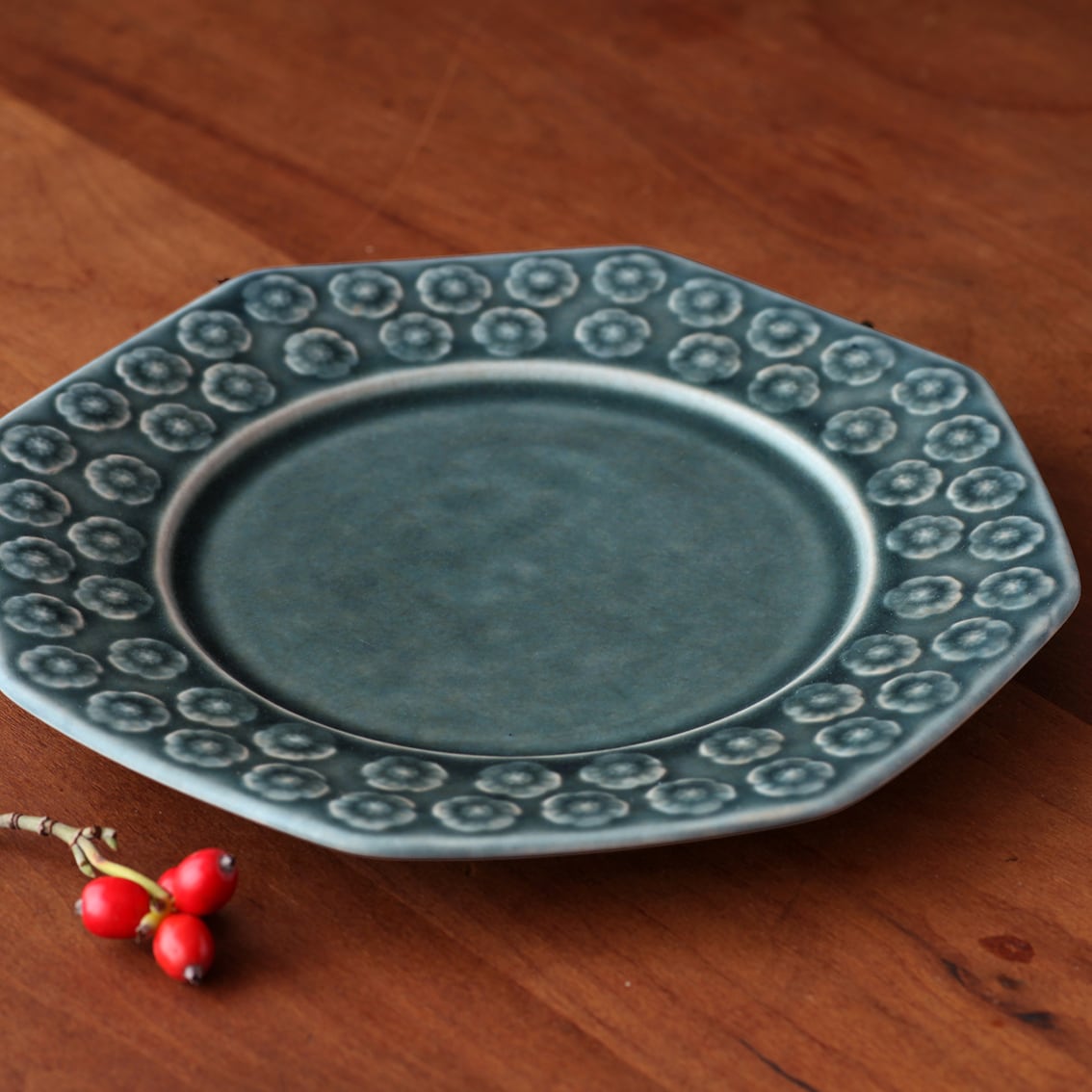 Jens H. Quistgaard(イェンス・クィストゴー)デザインによるPlum / Azur(プラム / アズール)シリーズの175mm八角皿(ケーキ・プレート)です。Plumシリーズは青いAzur(アズール)と褐色のUmbra(ウンブラ)がつくられましたが、こちらは落ち着きのあるクールなアズール。スモモの小花がちりばめられた静かなデザインはどこか和のエッセンスも感じさせ、自然な色合いは日本の生活空間にしっくりなじみます。