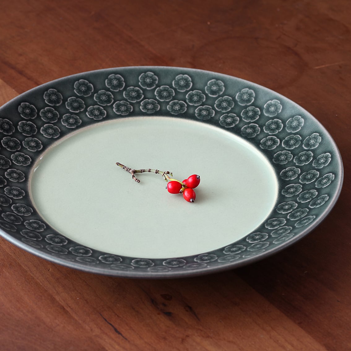 Jens H. Quistgaard(イェンス・クィストゴー)デザインによるPlum / Azur(プラム / アズール)シリーズの250mm皿(ディナー・プレート)です。Plumシリーズは青いAzur(アズール)と褐色のUmbra(ウンブラ)がつくられましたが、こちらは落ち着きのあるクールなアズール。スモモの小花がちりばめられた静かなデザインはどこか和のエッセンスも感じさせ、自然な色合いは日本の生活空間にしっくりなじみます。