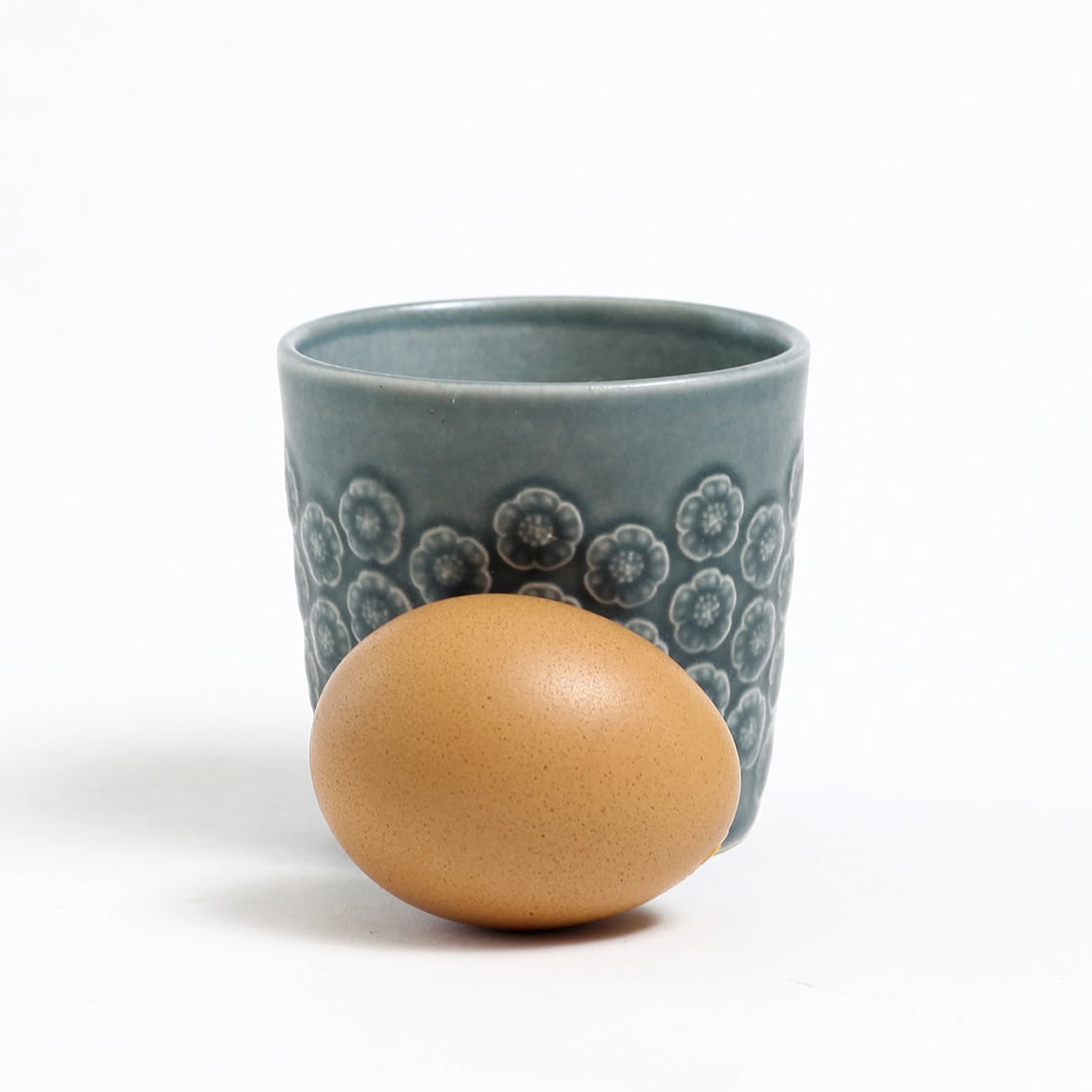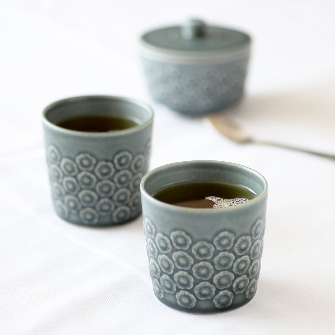 Plumシリーズは青いAzur(アズール)と褐色のUmbra(ウンブラ)がつくられましたが、こちらは落ち着きのあるクールなアズール。スモモの小花がちりばめられた静かなデザインはどこか和のエッセンスも感じさせ、自然な色合いは日本の生活空間にしっくりなじみます。蕎麦猪口のような安定感のあるフォルムですので、ティータイムからお料理、インテリアまで自由に応用できそうです。