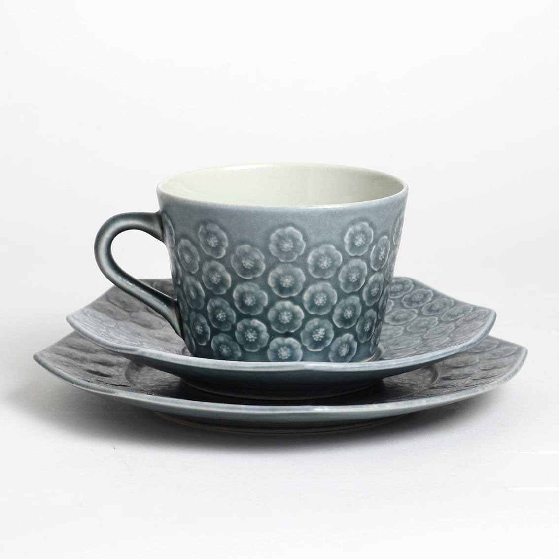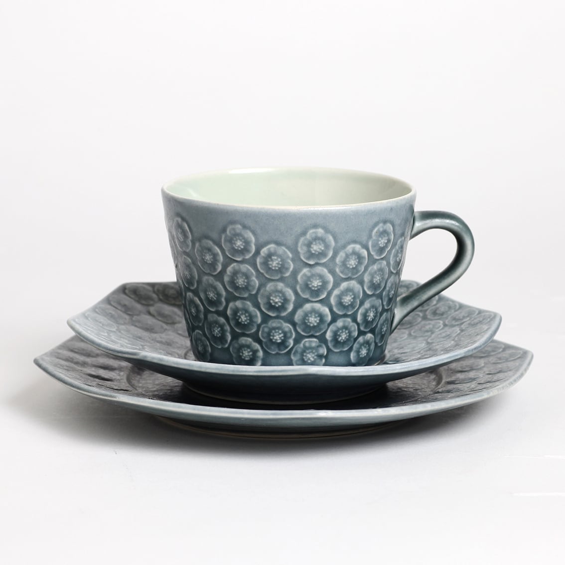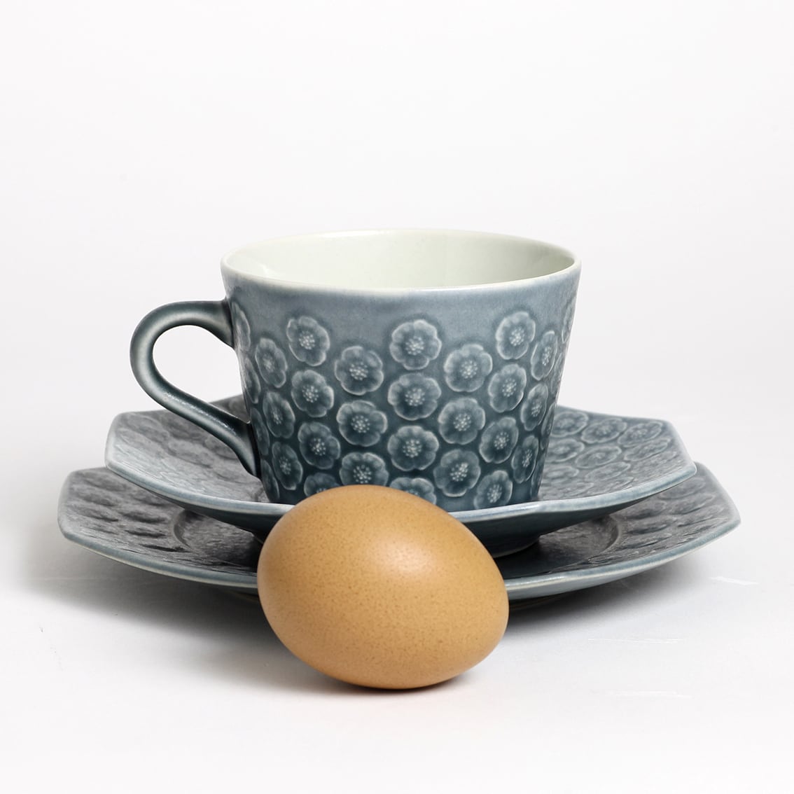 Jens H. Quistgaard(イェンス・クィストゴー)デザインによるPlum / Azur(プラム / アズール)シリーズのカップ&八角ソーサー、八角プレート3点セットです。Plumシリーズは青いAzur(アズール)と褐色のUmbra(ウンブラ)がつくられましたが、こちらは落ち着きのあるクールなアズール。スモモの小花がちりばめられた静かなデザインはどこか和のエッセンスも感じさせ、自然な色合いは日本の生活空間にしっくりなじみます。