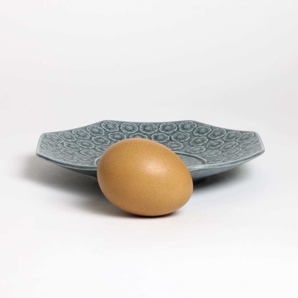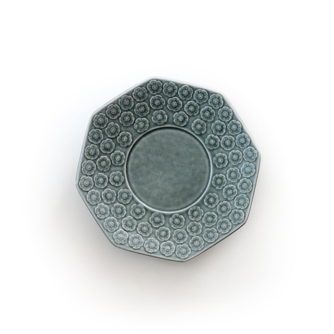 Jens H. Quistgaard(イェンス・クィストゴー)デザインによるPlum / Azur(プラム / アズール)シリーズの150mm八角ソーサーです。Plumシリーズは青いAzur(アズール)と褐色のUmbra(ウンブラ)がつくられましたが、こちらは落ち着きのあるクールなアズール。スモモの小花がちりばめられた静かなデザインはどこか和のエッセンスも感じさせ、自然な色合いは日本の生活空間にしっくりなじみます。