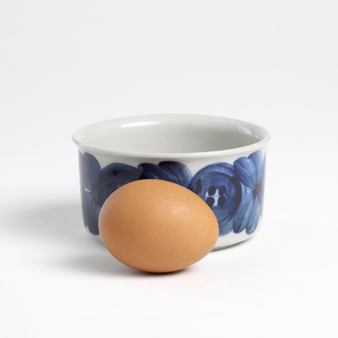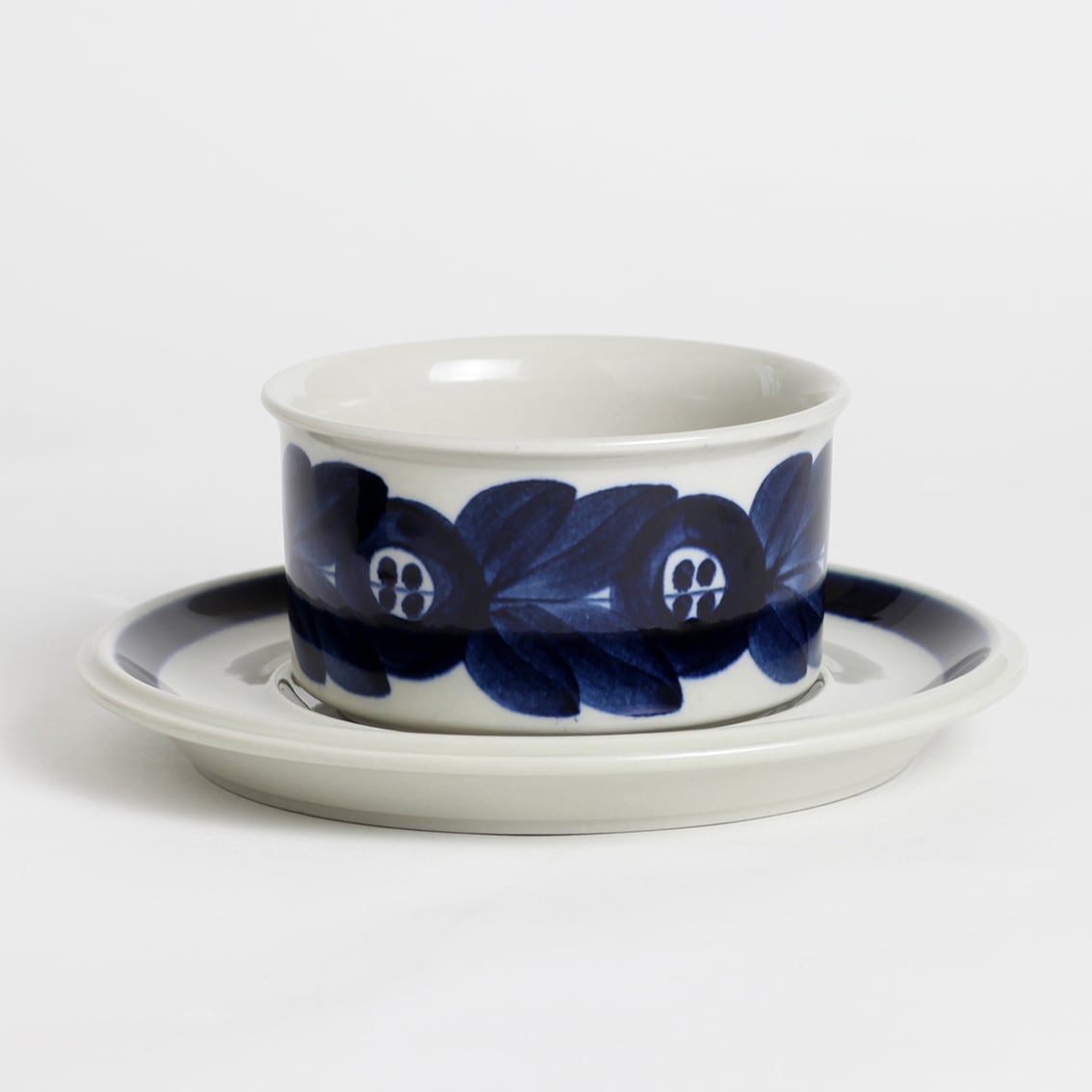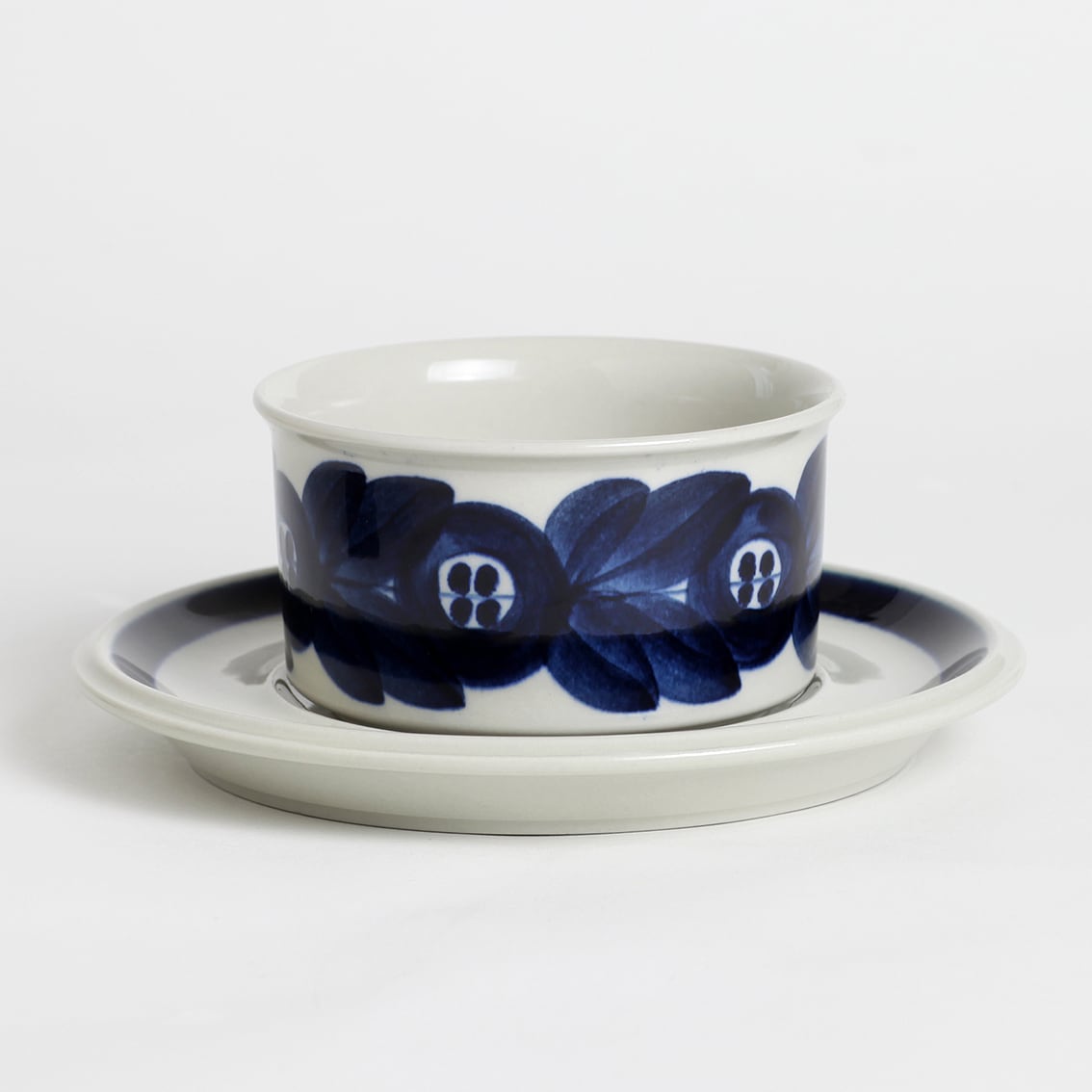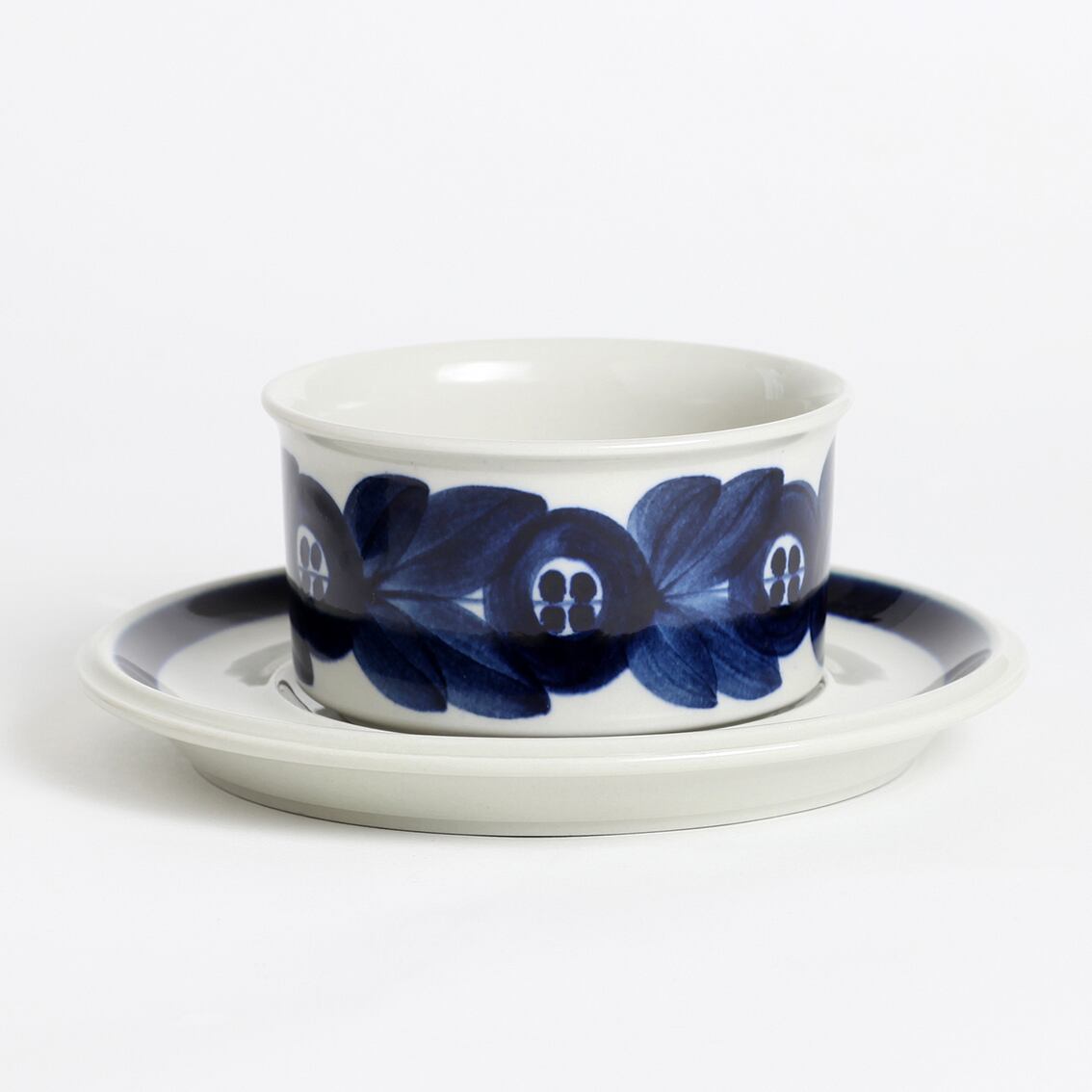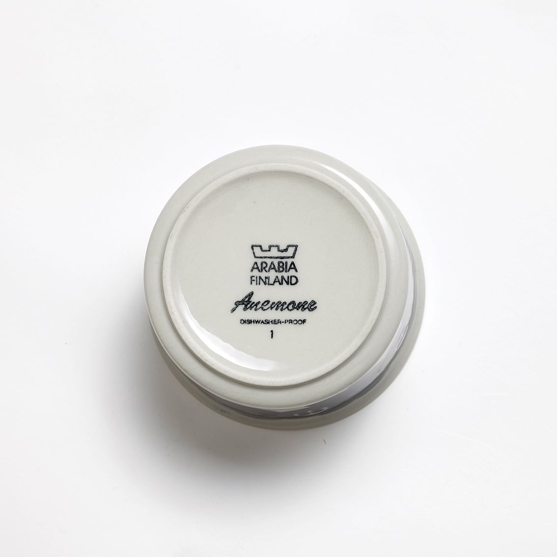 アラビアの代表的なデザイナーUlla Procope(ウラ・プロコペ)がデザインしたAnemone(アネモネ)シリーズのソーサー付きシュガーボウルです。ブルーベリーのような深みのある青が大変美しく、一点一点手描きされた丸い花柄は大胆で伸びやか。絵筆の余韻を感じさせるやわらかな絵柄を蓋の太いストライプがきりりと引き締めています。