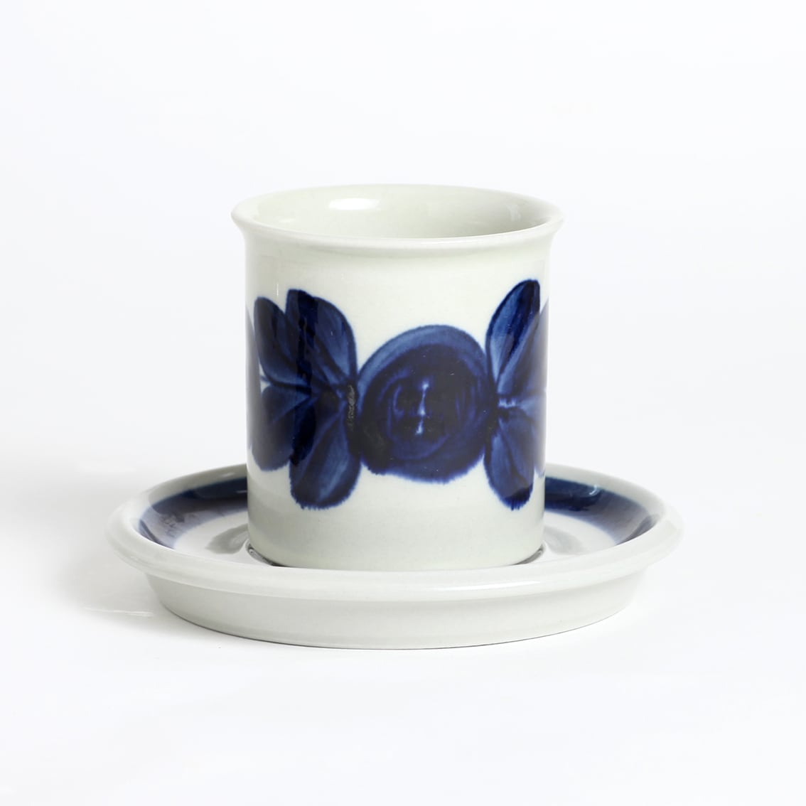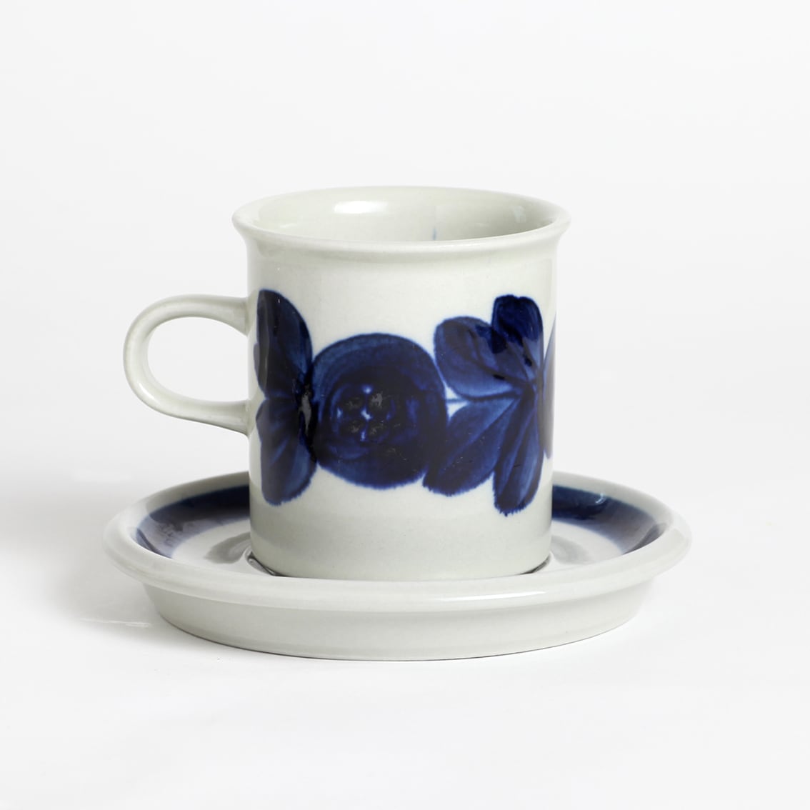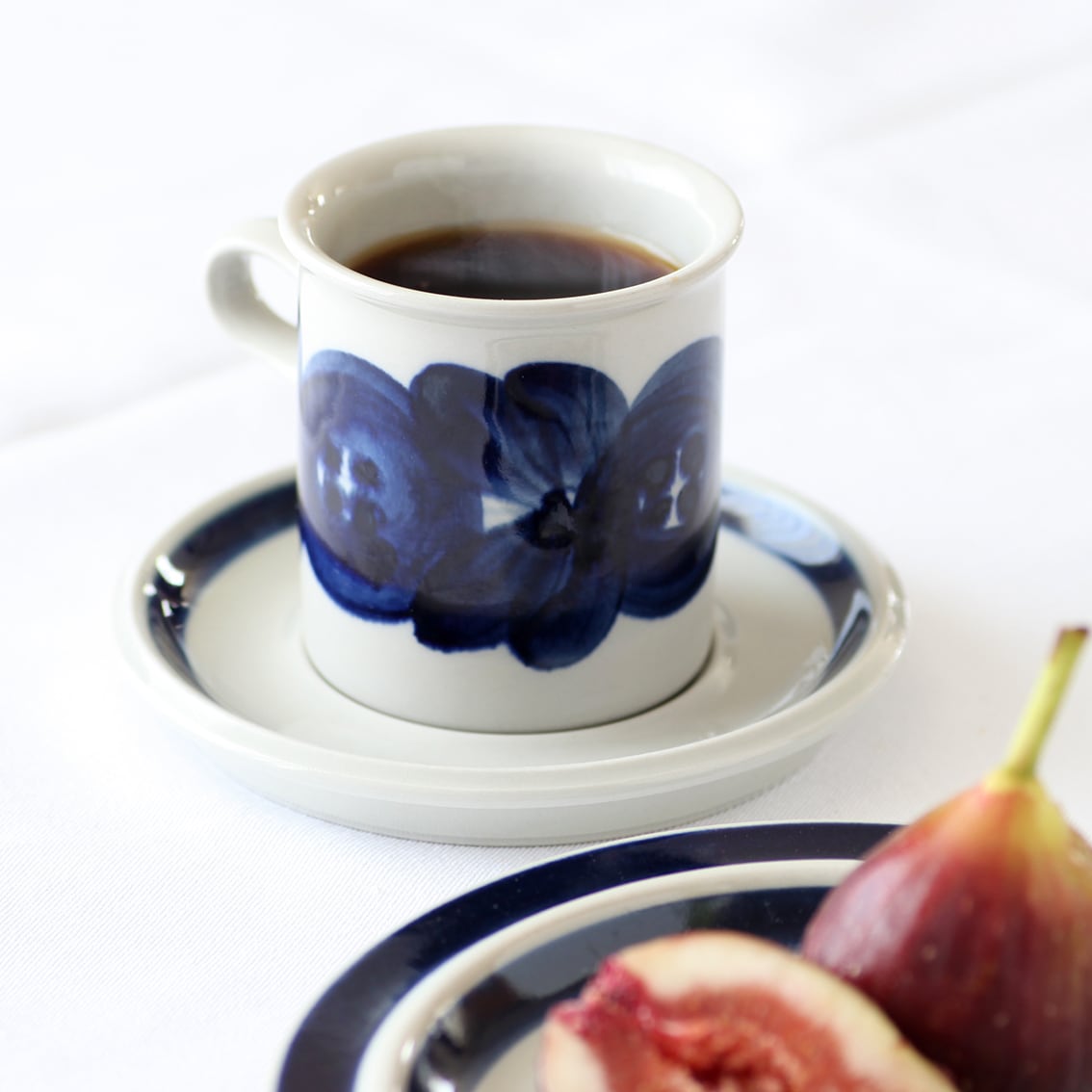 アラビアの代表的なデザイナーUlla Procope(ウラ・プロコペ)がデザインしたAnemone(アネモネ)シリーズの70mm コーヒー カップ&ソーサーです。ブルーベリーのような深みのある青が大変美しく、一点一点手描きされた丸い花柄は大胆で伸びやか。絵筆の余韻を感じさせるやわらかな絵柄をソーサーの太いストライプがきりりと引き締めています。