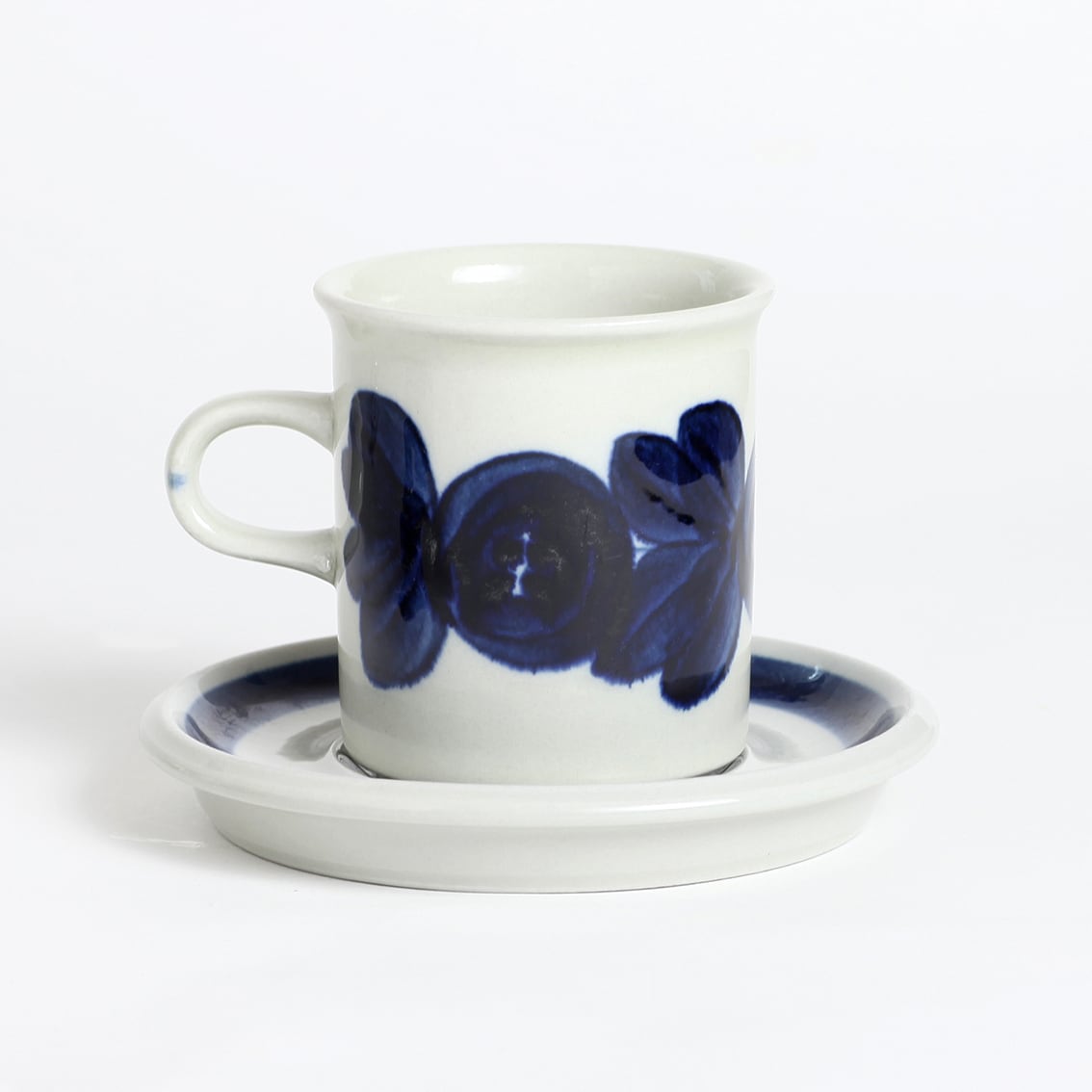 アラビアの代表的なデザイナーUlla Procope(ウラ・プロコペ)がデザインしたAnemone(アネモネ)シリーズの70mm コーヒー カップ&ソーサーです。ブルーベリーのような深みのある青が大変美しく、一点一点手描きされた丸い花柄は大胆で伸びやか。絵筆の余韻を感じさせるやわらかな絵柄をソーサーの太いストライプがきりりと引き締めています。