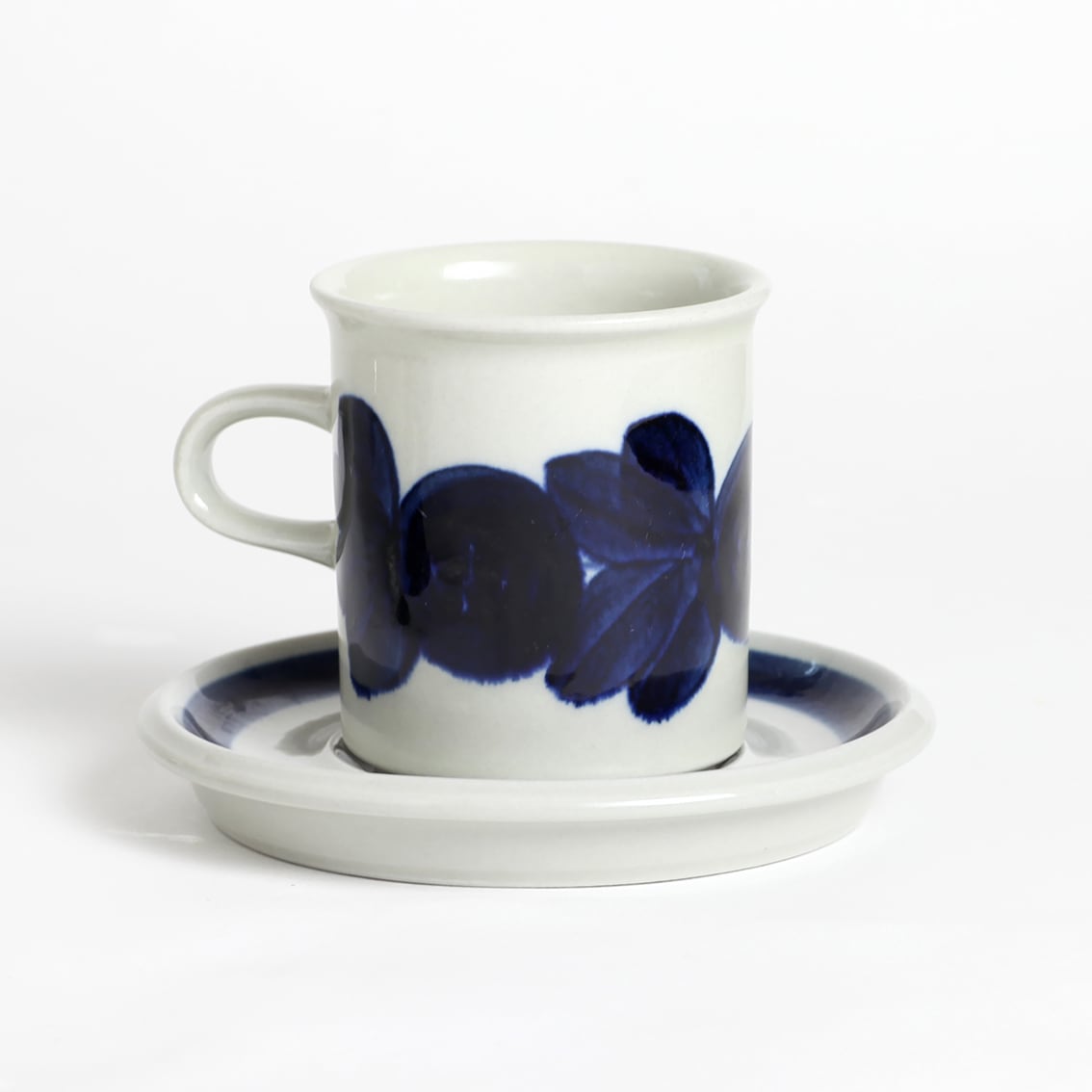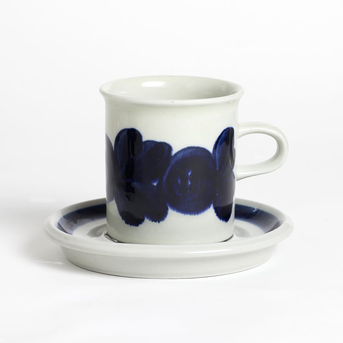 アラビアの代表的なデザイナーUlla Procope(ウラ・プロコペ)がデザインしたAnemone(アネモネ)シリーズの70mm コーヒー カップ&ソーサーです。ブルーベリーのような深みのある青が大変美しく、一点一点手描きされた丸い花柄は大胆で伸びやか。絵筆の余韻を感じさせるやわらかな絵柄をソーサーの太いストライプがきりりと引き締めています。