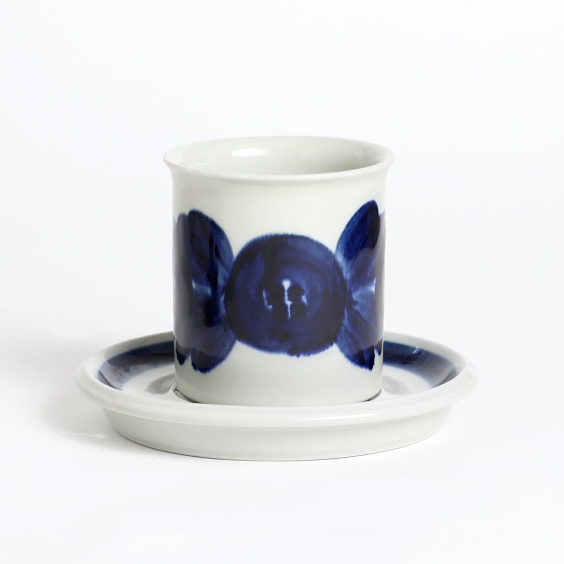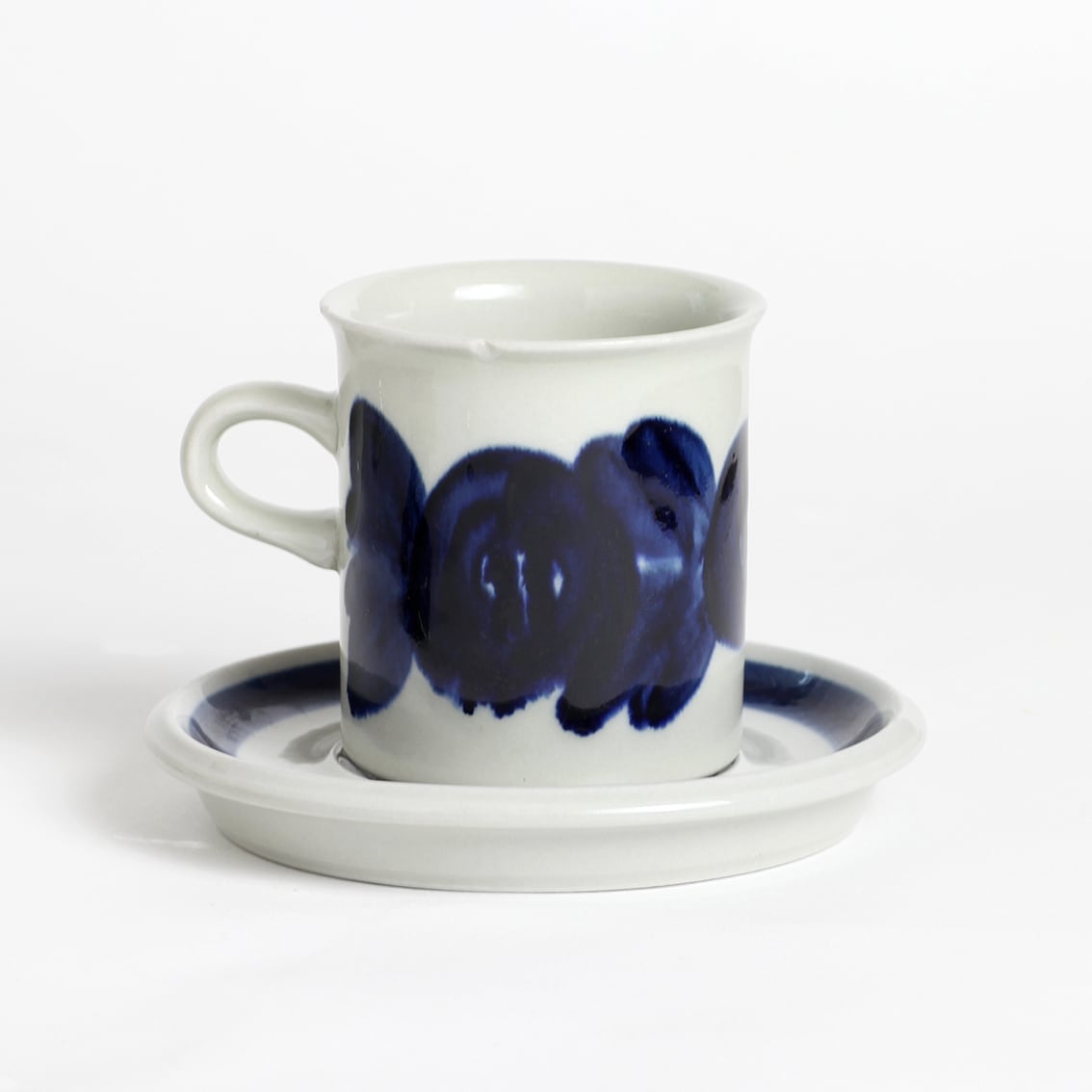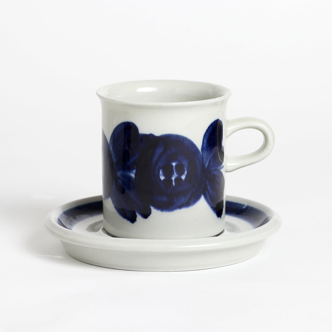 アラビアの代表的なデザイナーUlla Procope(ウラ・プロコペ)がデザインしたAnemone(アネモネ)シリーズの70mm コーヒー カップ&ソーサーです。ブルーベリーのような深みのある青が大変美しく、一点一点手描きされた丸い花柄は大胆で伸びやか。絵筆の余韻を感じさせるやわらかな絵柄をソーサーの太いストライプがきりりと引き締めています。