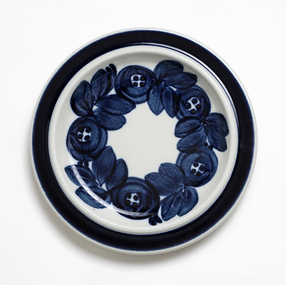 同シリーズのプレートには帯だけが描かれたタイプもありますが、こちらは花柄も描かれているデザイン。5輪の花と葉がリースのように連なっていて、ブルーベリー色の濃淡とにじみが優しさを醸し出しています。