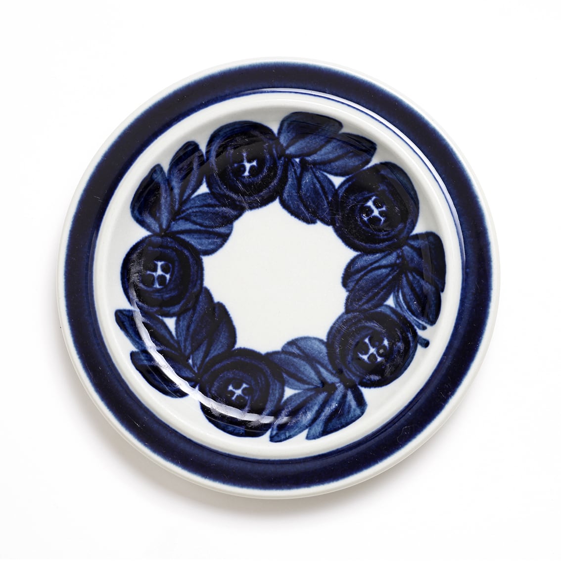 同シリーズのプレートには帯だけが描かれたタイプもありますが、こちらは花柄も描かれているデザイン。5輪の花と葉がリースのように連なっていて、ブルーベリー色の濃淡とにじみが優しさを醸し出しています。