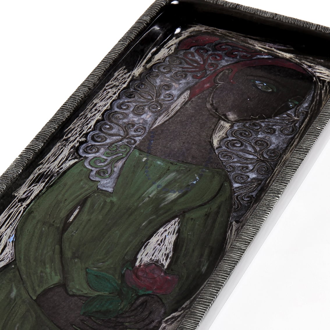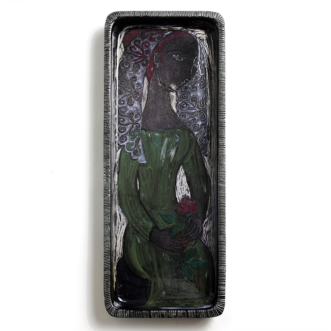 アラビア社(ARABIA)アート部門の Hilkka-Lisa Ahola(ヒルッカ・リーサ・アホラ)が制作した、赤い薔薇をもつ婦人の陶板です。