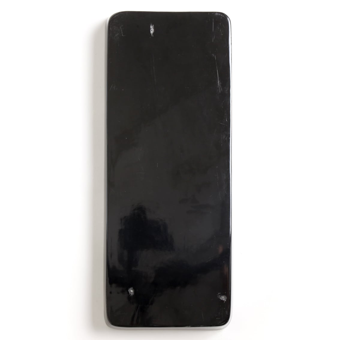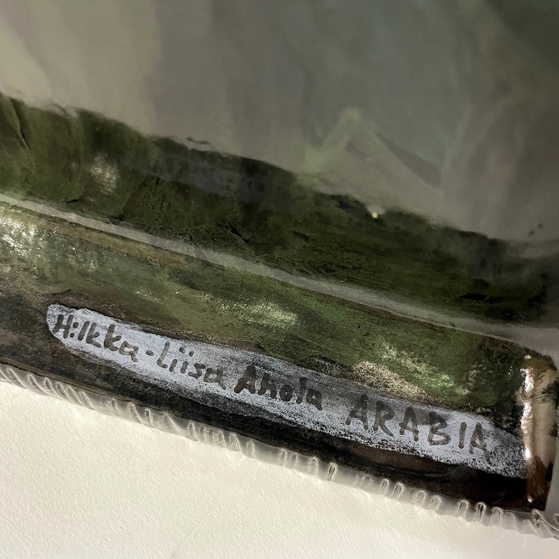テーブルやキャビネットに置いて楽しむ、長さ45cmのアート。サービングプレートやセンターピースとして使っても楽しそうです。女性の陶板の多くはパステル調の明るい色で描かれましたが、落ち着いた内省的な色調の作品も数点あることが知られていました。こちらの陶板はその1つと思われ、日本の住空間にもしっとりとなじむ静けさをたたえています。陶板の内側のへりに署名「Hilkka-Liisa Ahola ARABIA」が記されています。