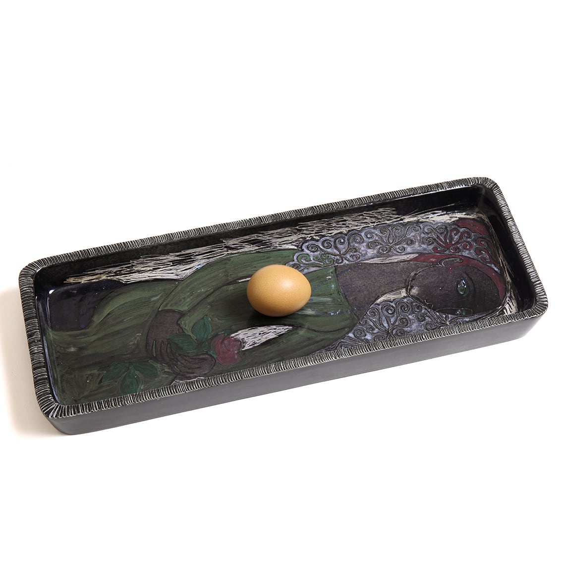 ひまわりなど花の絵柄で人気の高いアホラは、1940年代から1950年代にかけて女性をテーマにした陶板も手がけていました。こちらは一輪の薔薇を手に座る女性。緑のワンピースをまとい、髪に白いレースのヴェール、首には白いネックレスを着けています。アホラ作品に登場する他の女性同様、美しい切れ長の目、細い鼻、小さな口が特徴です。