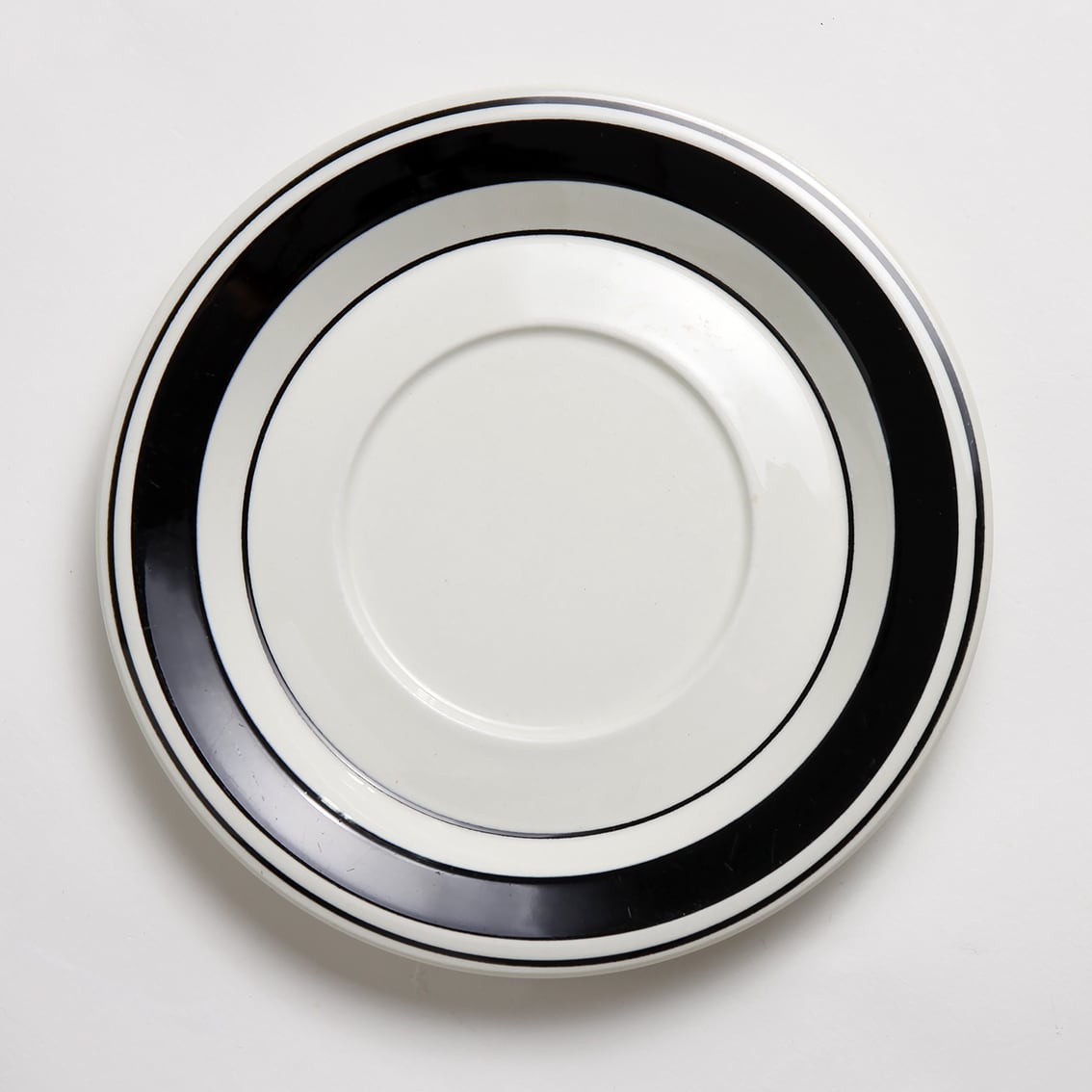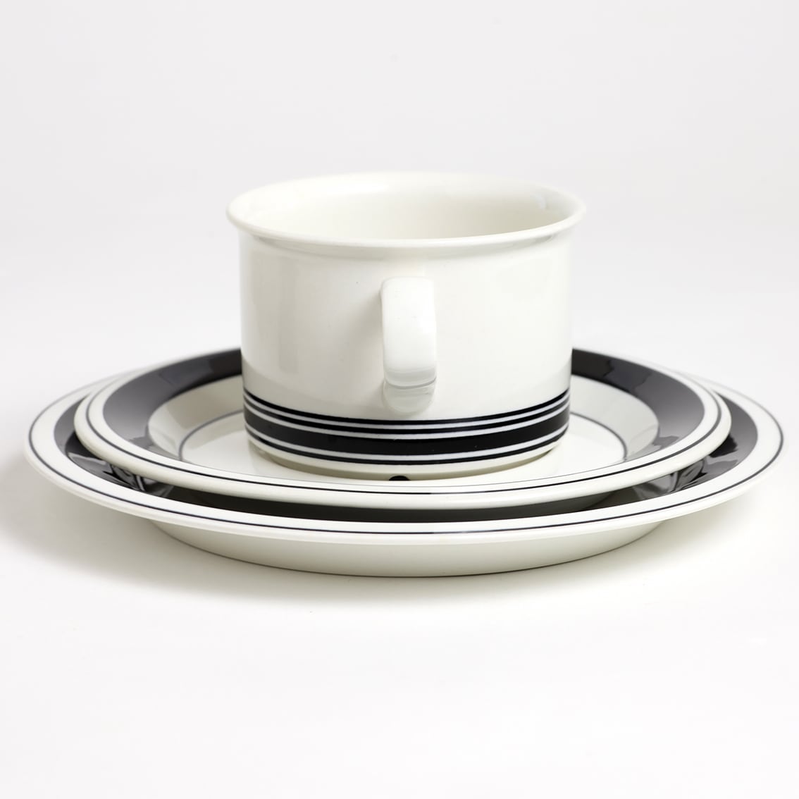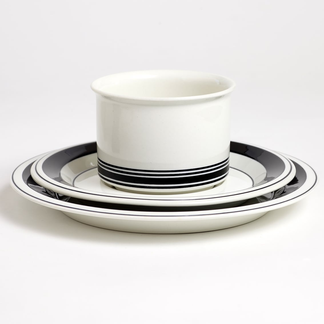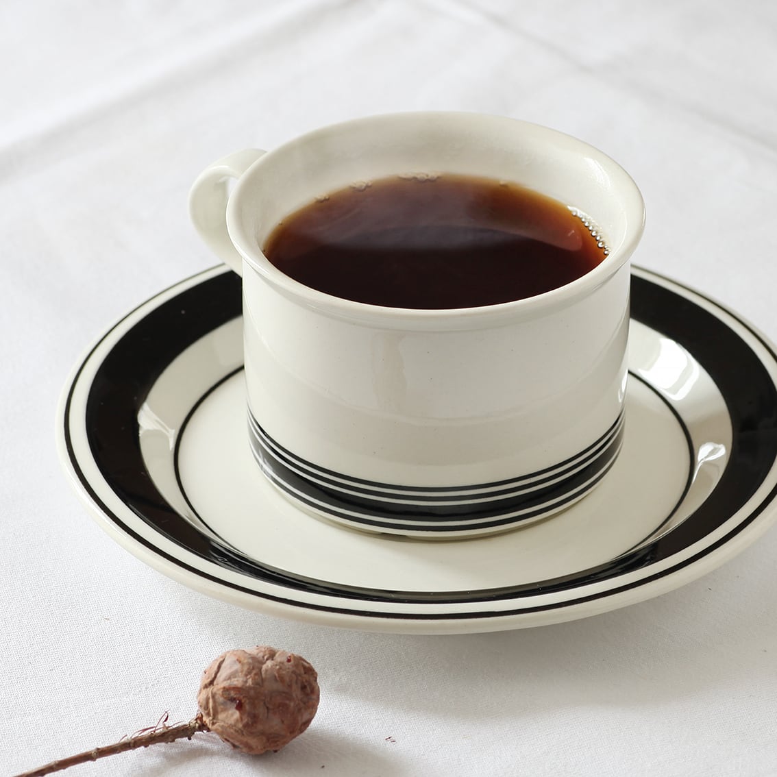 1971年イタリアで開催されたファエンツァ・セラミック・ビエンナーレに於いて金賞を受賞したこのシリーズは、4種類のデザインが作られました。青または臙脂の小さな花がカップ側面いっぱいに描かれたタイプと、黄色と黒または黒のみのストライプを大胆にあしらったタイプ。こちらは黒のみの作品です。カップの下に黒を集中させた大胆なデザインが楽しく、眺めるほどに愛着が湧いてきます。