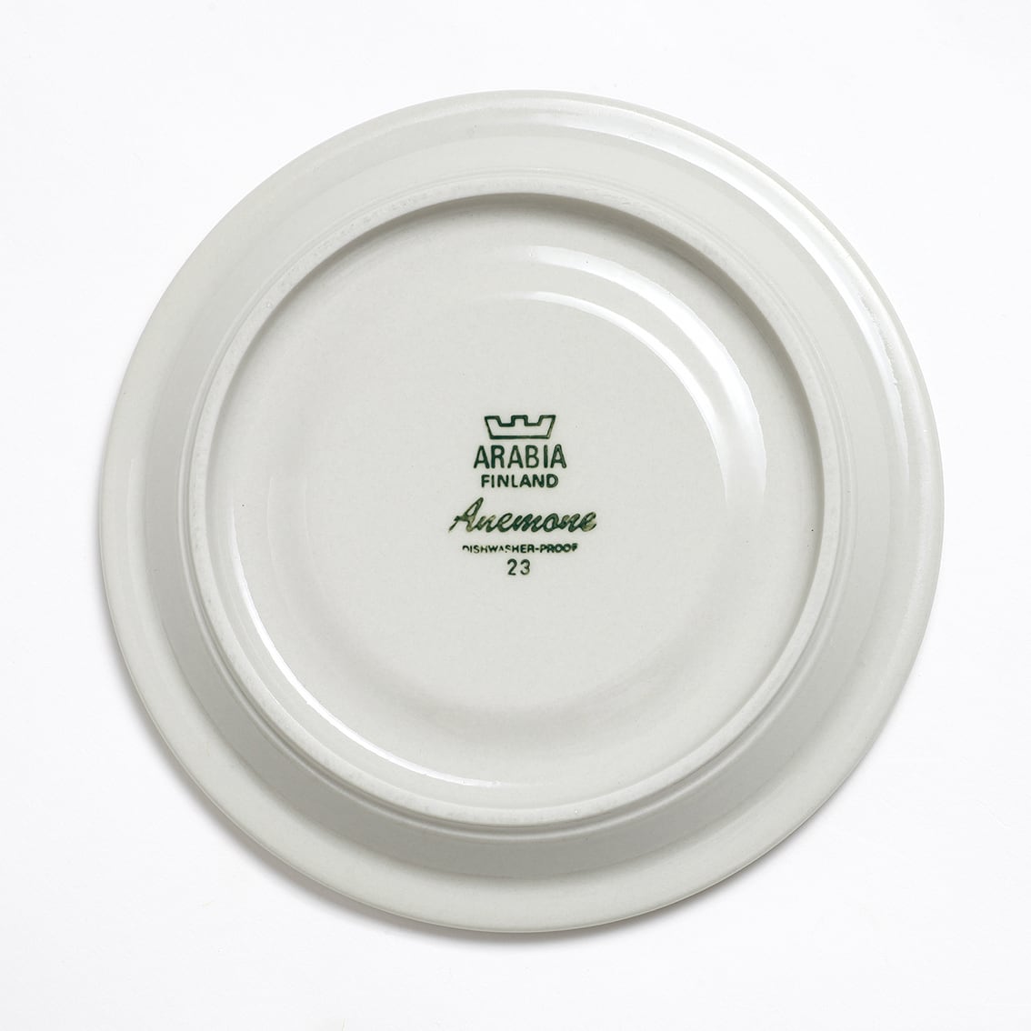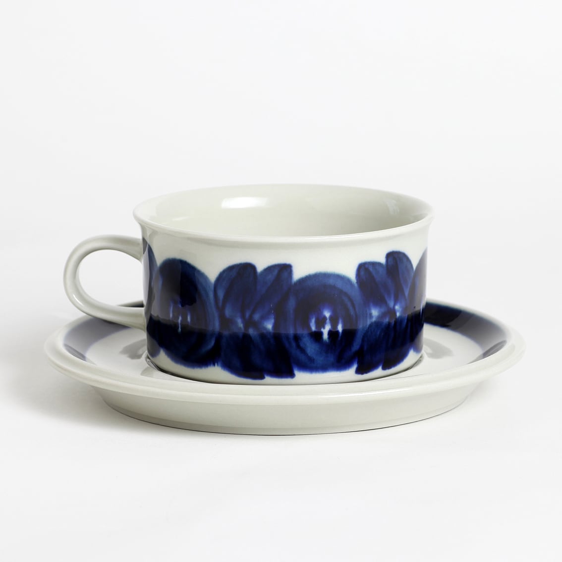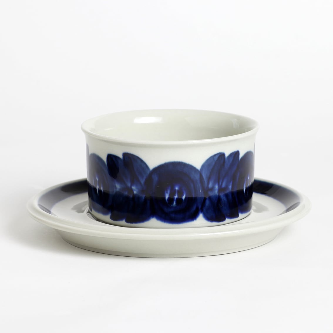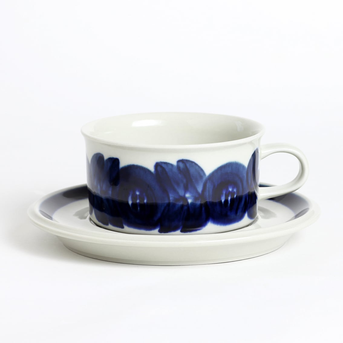 アラビアの代表的なデザイナーUlla Procope(ウラ・プロコペ)がデザインしたAnemone(アネモネ)シリーズのティーカップ&ソーサーです。ブルーベリーのような深みのある青が大変美しく、一点一点手描きされた丸い花柄は大胆で伸びやか。絵筆の余韻を感じさせるやわらかな絵柄をソーサーの太いストライプがきりりと引き締めています。スープやデザートにも活躍してくれそうなフォルムです。