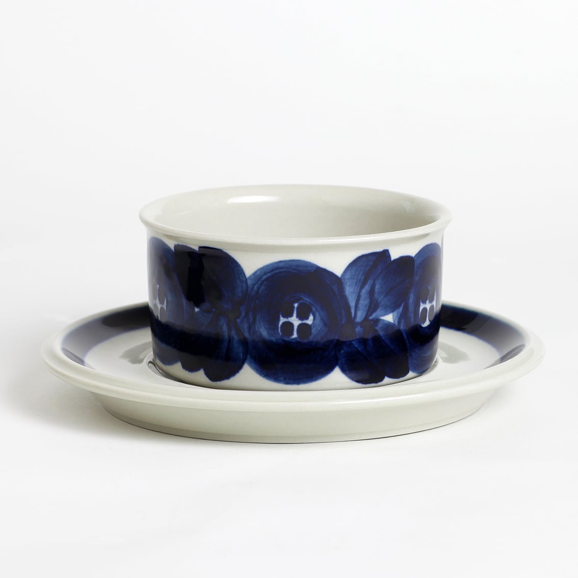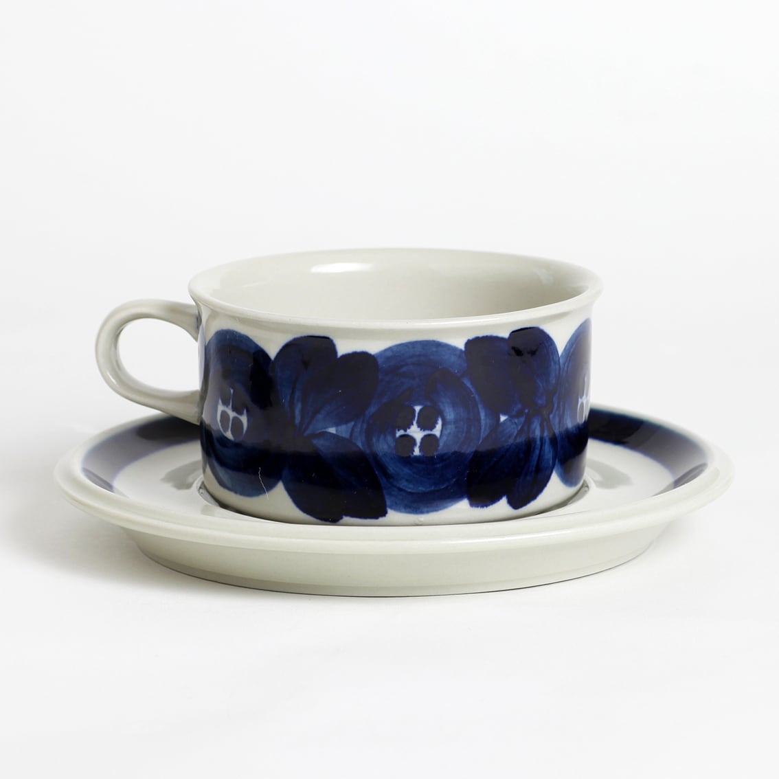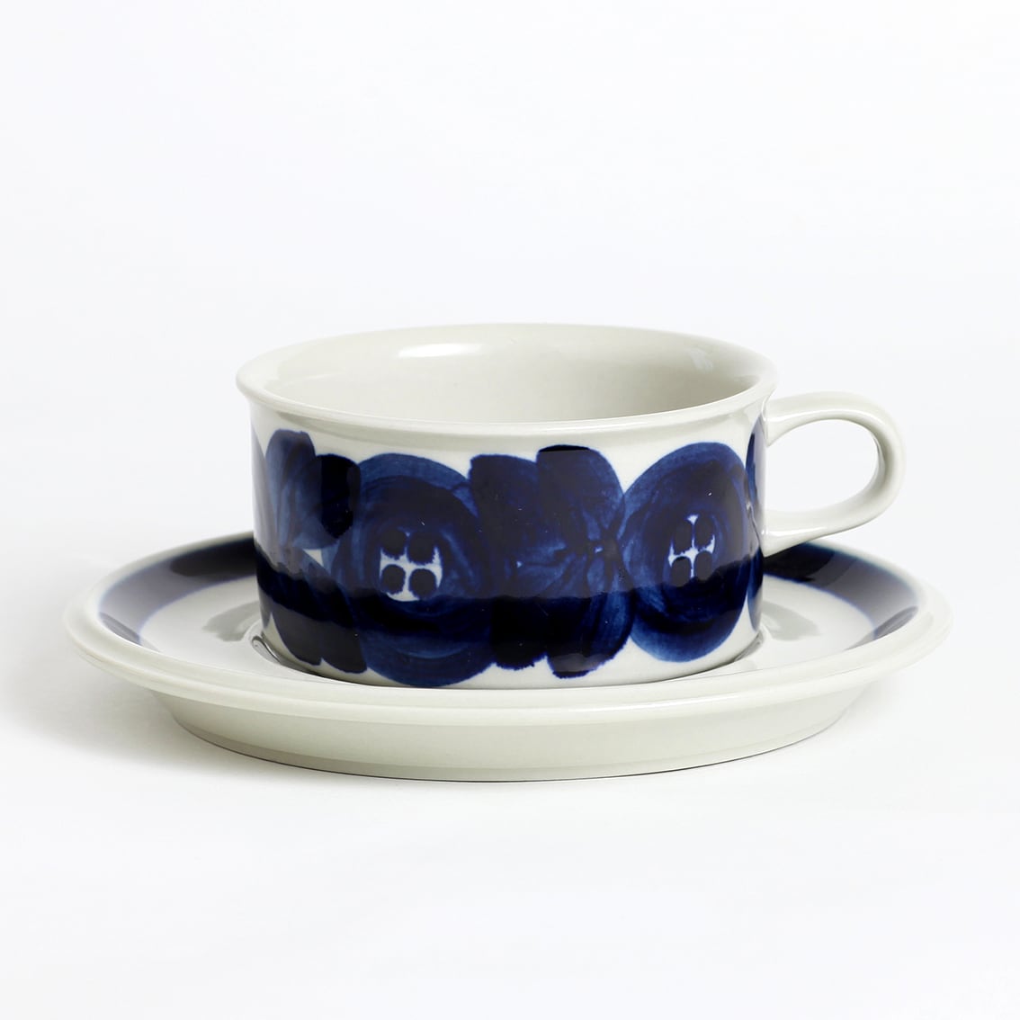 アラビアの代表的なデザイナーUlla Procope(ウラ・プロコペ)がデザインしたAnemone(アネモネ)シリーズのティーカップ&ソーサーです。ブルーベリーのような深みのある青が大変美しく、一点一点手描きされた丸い花柄は大胆で伸びやか。絵筆の余韻を感じさせるやわらかな絵柄をソーサーの太いストライプがきりりと引き締めています。スープやデザートにも活躍してくれそうなフォルムです。