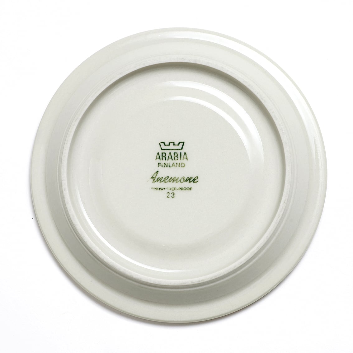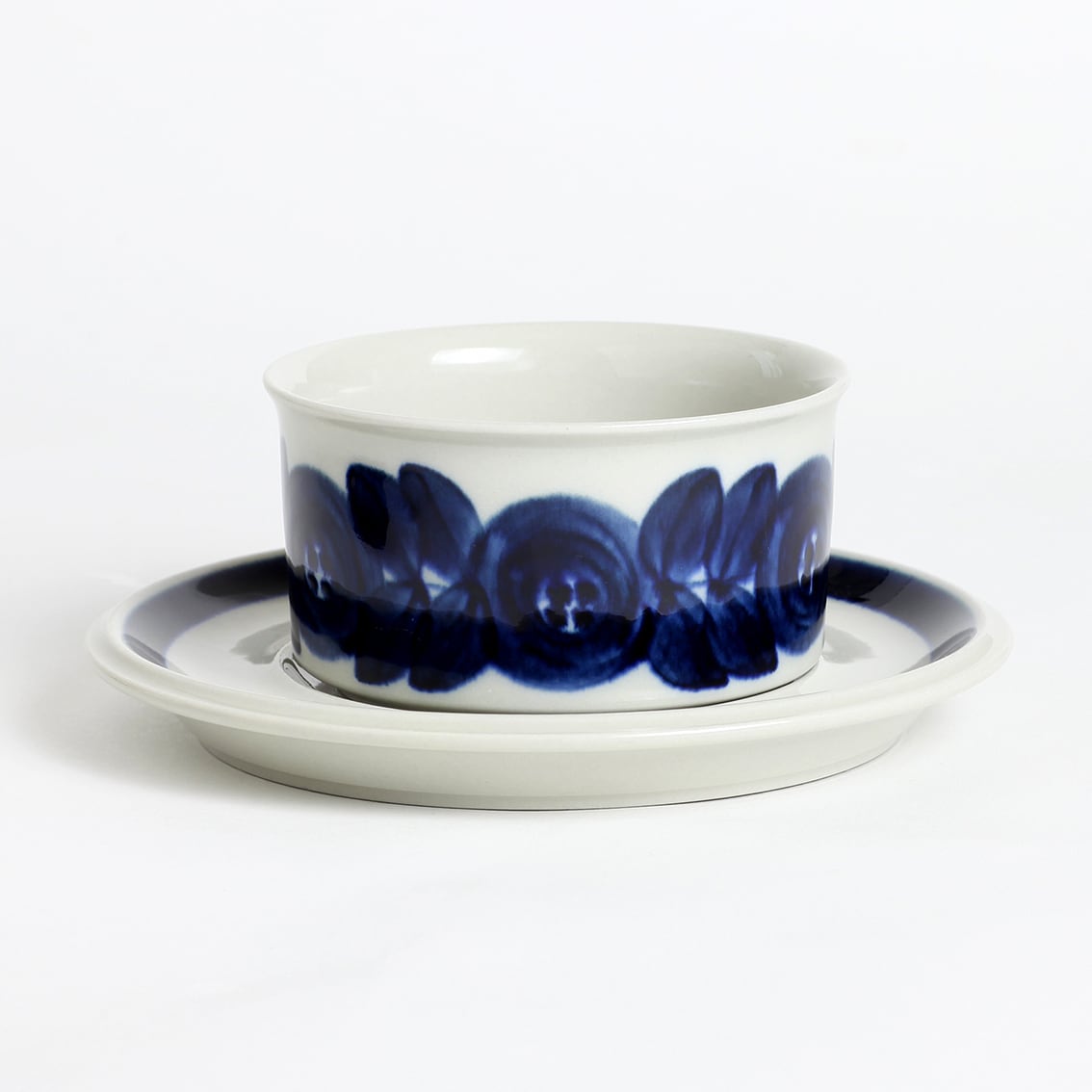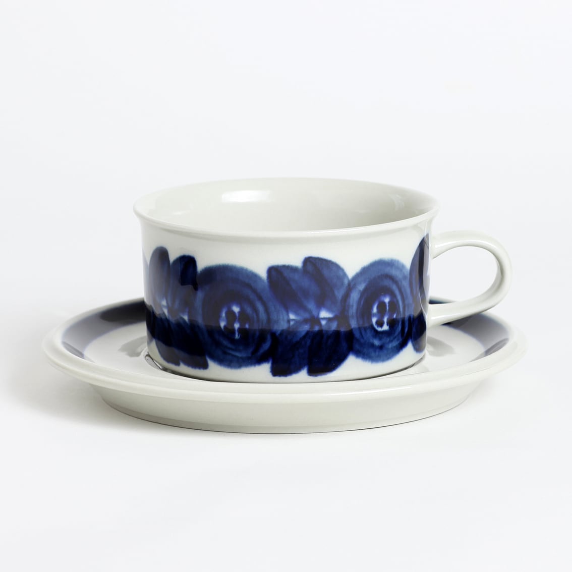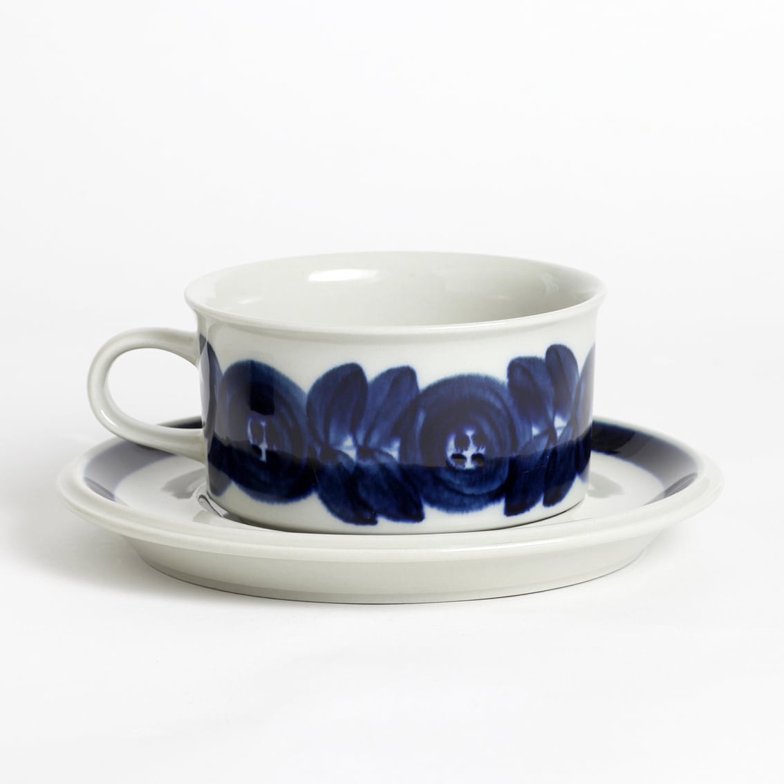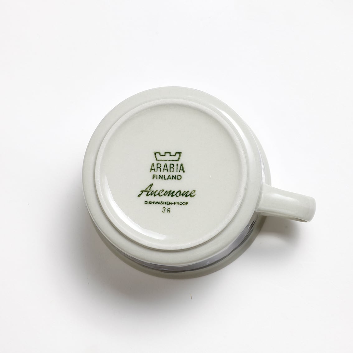 アラビアの代表的なデザイナーUlla Procope(ウラ・プロコペ)がデザインしたAnemone(アネモネ)シリーズのティーカップ&ソーサーです。ブルーベリーのような深みのある青が大変美しく、一点一点手描きされた丸い花柄は大胆で伸びやか。絵筆の余韻を感じさせるやわらかな絵柄をソーサーの太いストライプがきりりと引き締めています。スープやデザートにも活躍してくれそうなフォルムです。