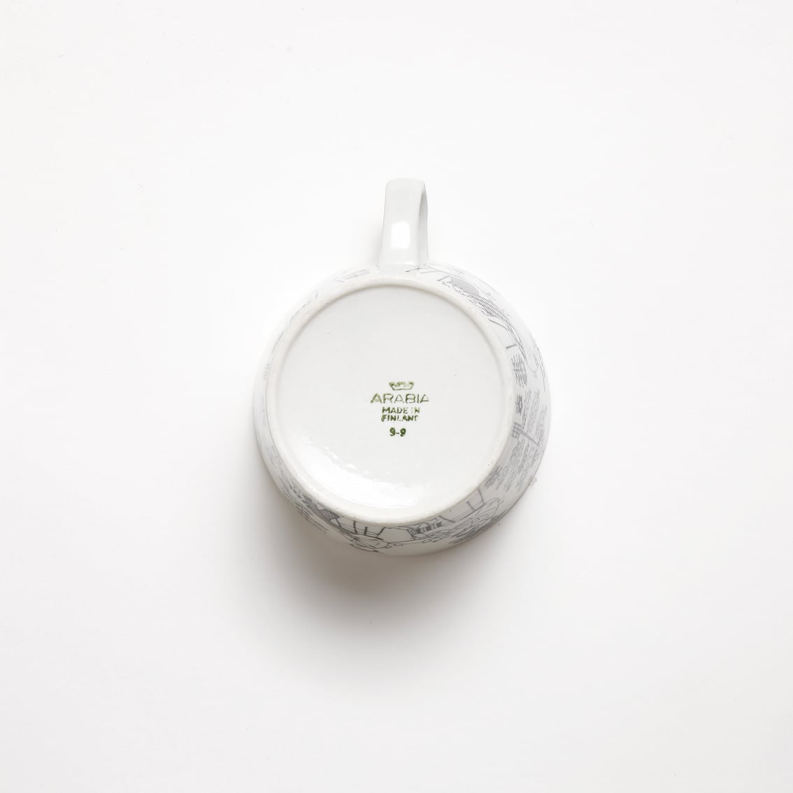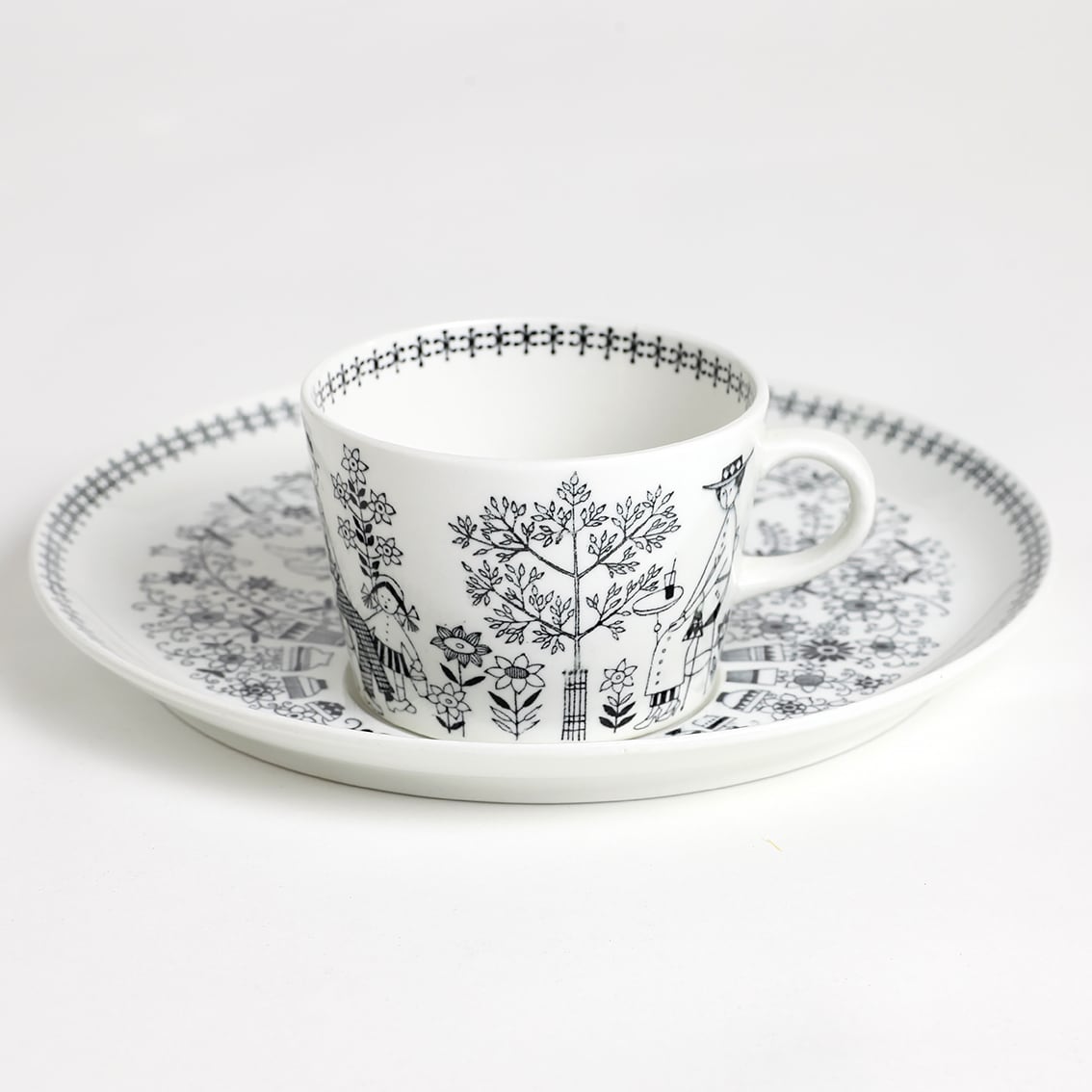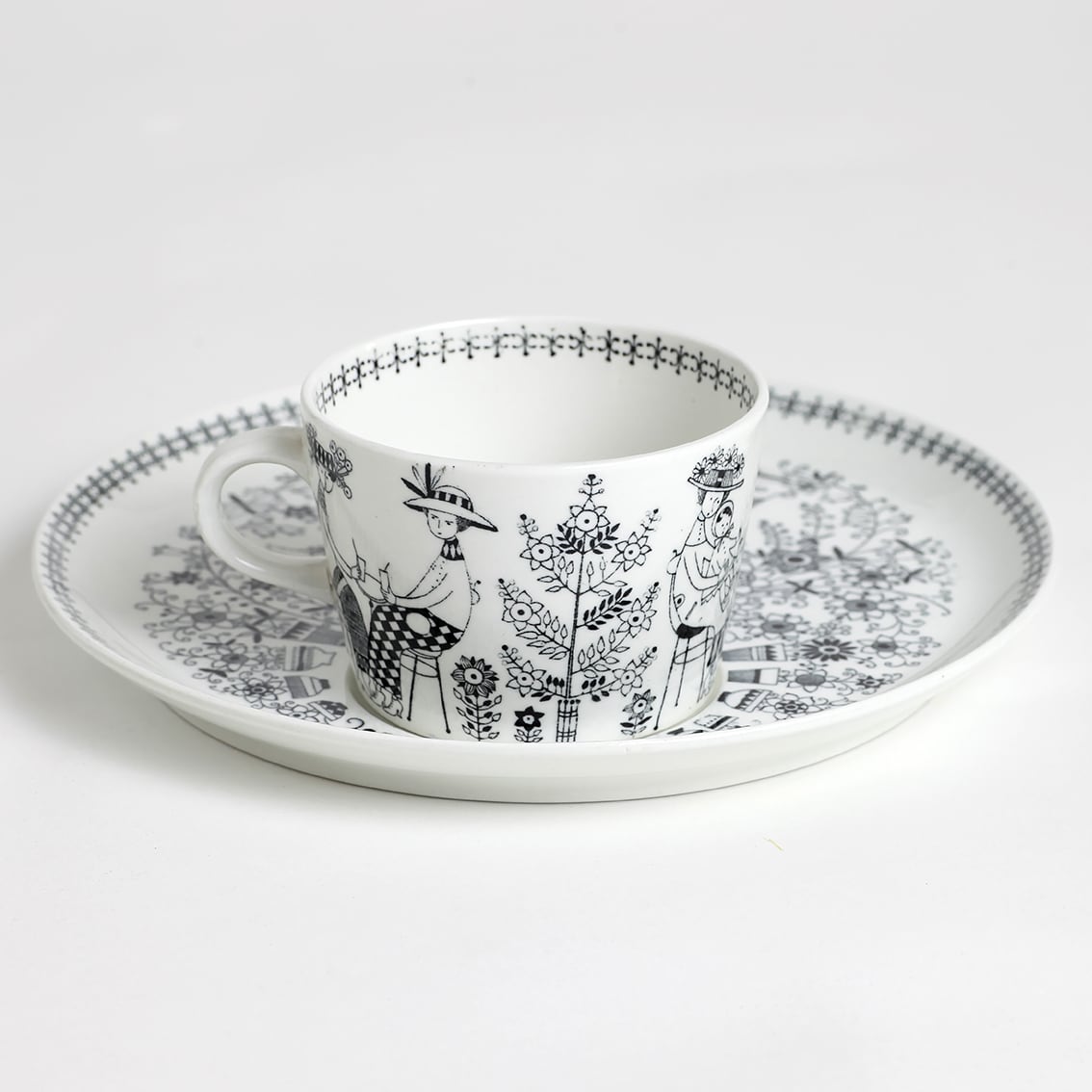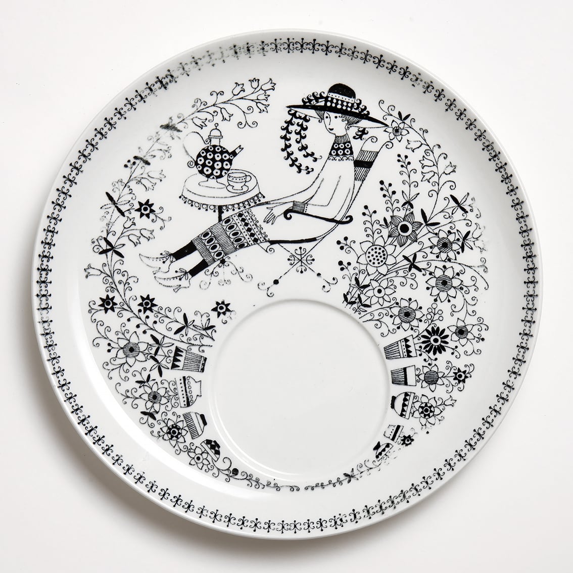 Kaj Franck(カイ・フランク)がデザインしたつややかな白地のフォルムにRaija Uosikkinen(ライヤ・ウオシッキネン)が繊細な黒い線でデコレート。モノクロと思えない華やぎの感じられる作品です。庭の長椅子に足を投げ出してお茶のひとときを楽しむ女性。カップを載せる凹みの周りには丹精して咲かせた鉢花がずらり。そのカップにはオープンカフェの陽だまりで過ごす家族連れや女性たちが描かれています。みんなおめかしして楽しそう。
