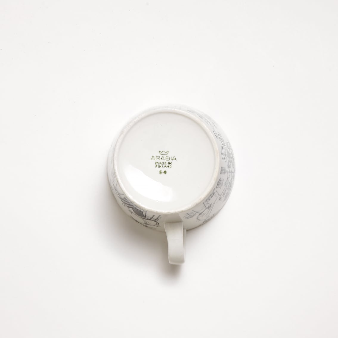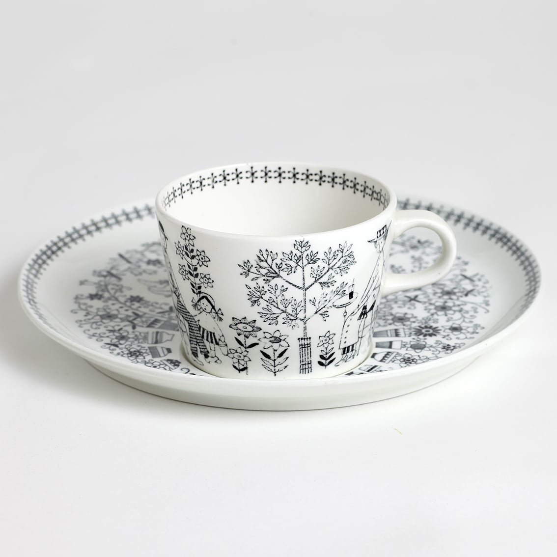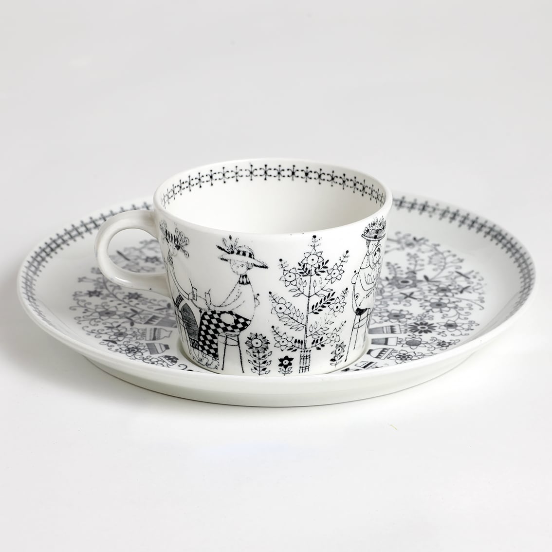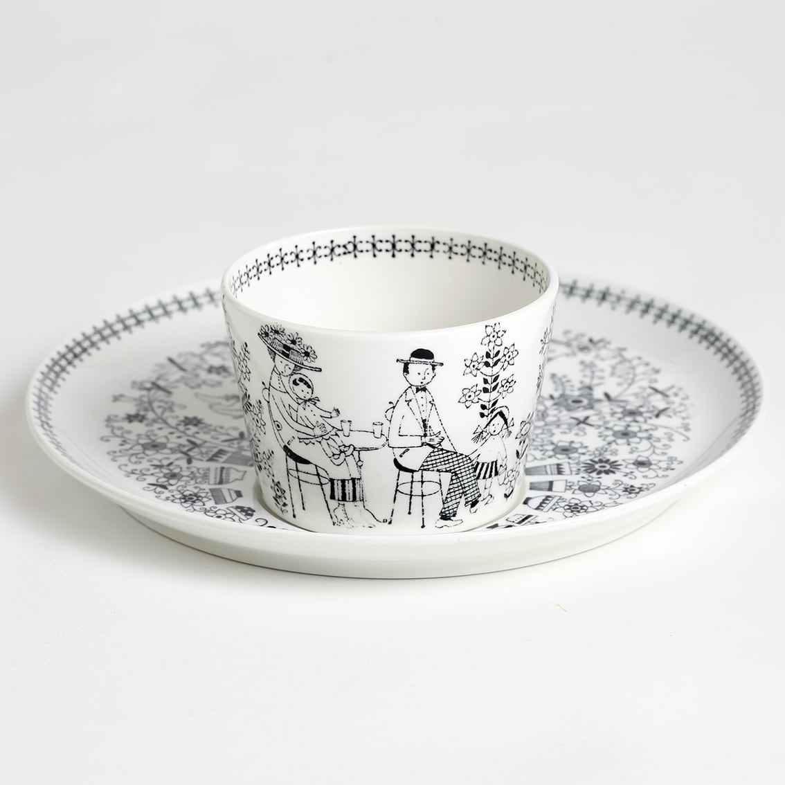 Kaj Franck(カイ・フランク)がデザインしたつややかな白地のフォルムにRaija Uosikkinen(ライヤ・ウオシッキネン)が繊細な黒い線でデコレート。モノクロと思えない華やぎの感じられる作品です。庭の長椅子に足を投げ出してお茶のひとときを楽しむ女性。カップを載せる凹みの周りには丹精して咲かせた鉢花がずらり。そのカップにはオープンカフェの陽だまりで過ごす家族連れや女性たちが描かれています。みんなおめかしして楽しそう。