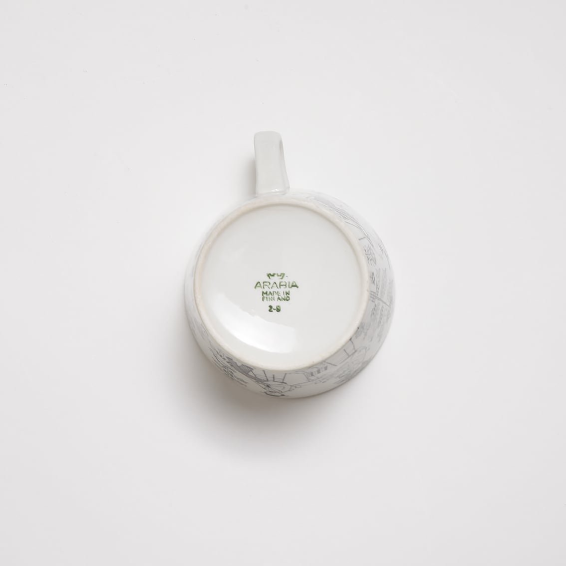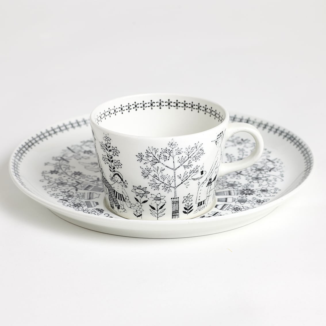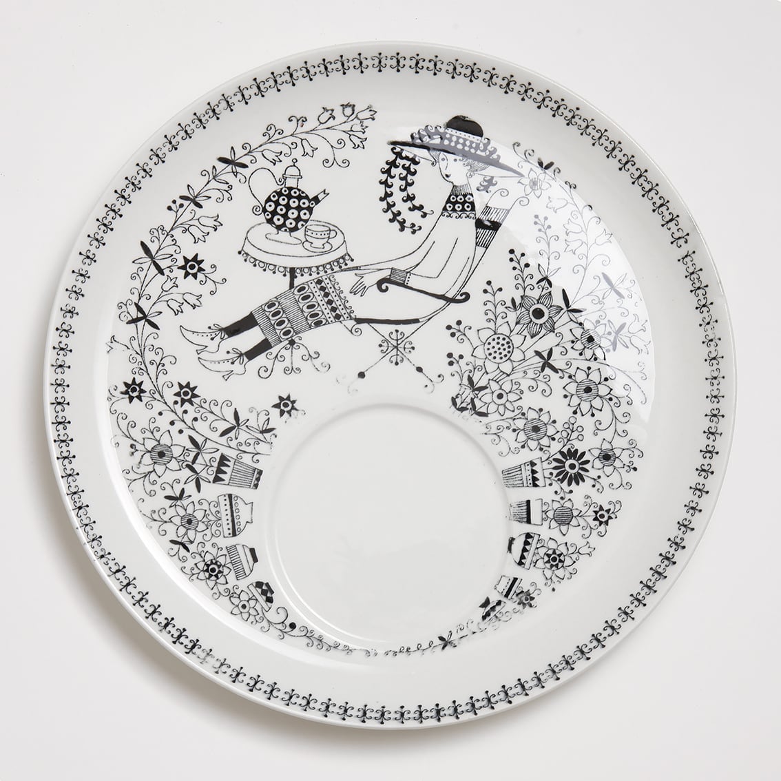 Kaj Franck(カイ・フランク)がデザインしたつややかな白地のフォルムにRaija Uosikkinen(ライヤ・ウオシッキネン)が繊細な黒い線でデコレート。モノクロと思えない華やぎの感じられる作品です。庭の長椅子に足を投げ出してお茶のひとときを楽しむ女性。カップを載せる凹みの周りには丹精して咲かせた鉢花がずらり。そのカップにはオープンカフェの陽だまりで過ごす家族連れや女性たちが描かれています。みんなおめかしして楽しそう。