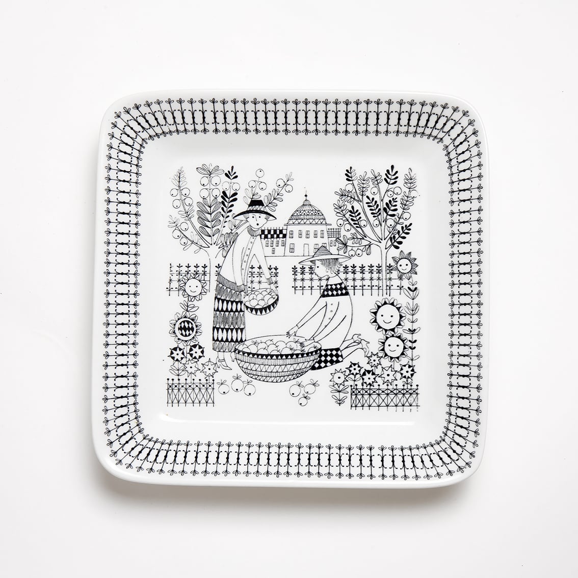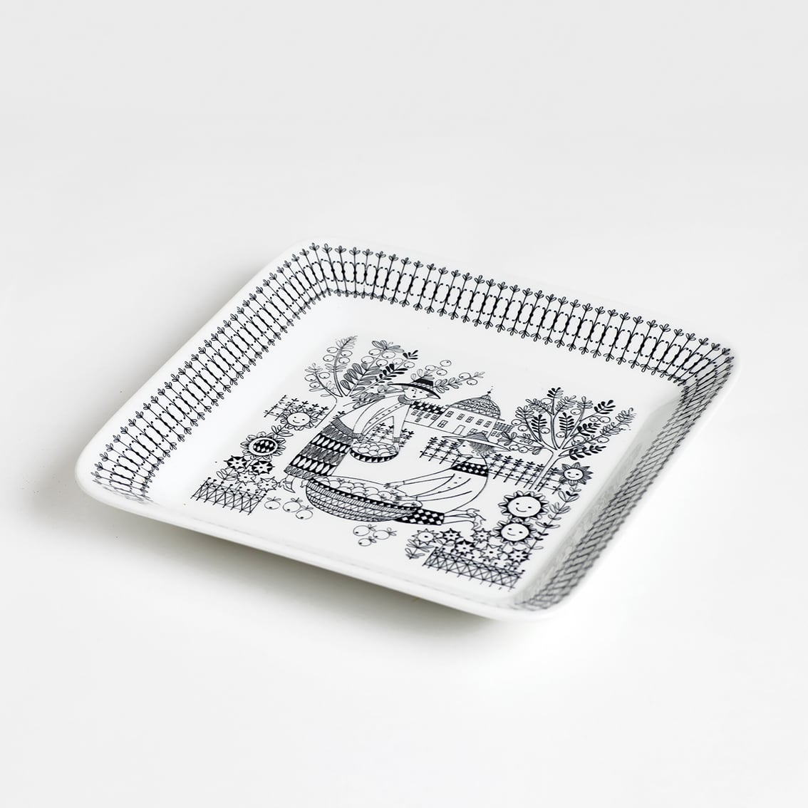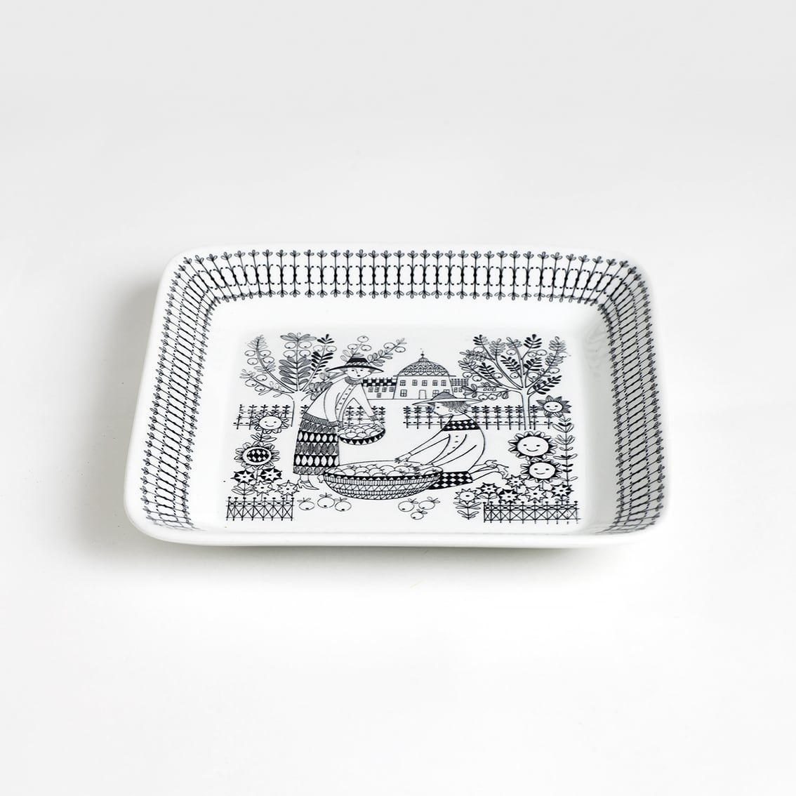 Kaj Franck(カイ・フランク)がデザインしたつややかな白地のフォルムにRaija Uosikkinen(ライヤ・ウオシッキネン)が繊細な黒い線でデコレート。モノクロとは思えない華やぎが感じられる作品です。ひざに乗せたボウルをかき混ぜる女性は、他のエミリアのように着飾ってはいませんが、肩にひらひらのついたエプロンがさりげなくおしゃれです。