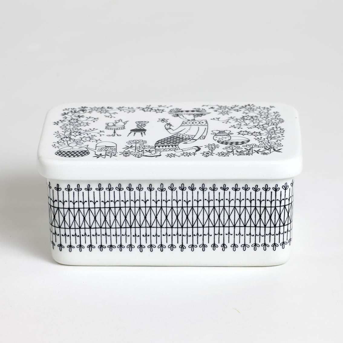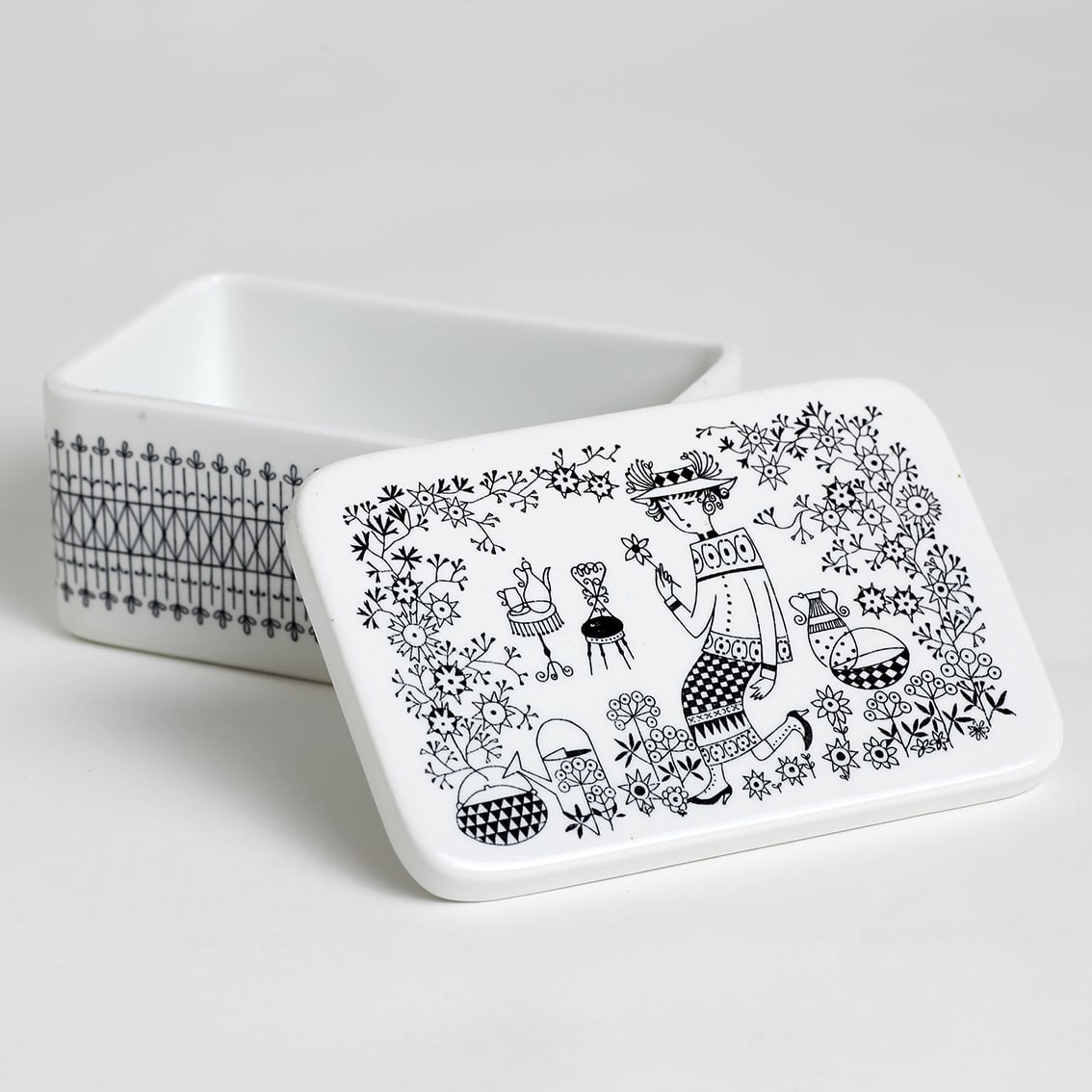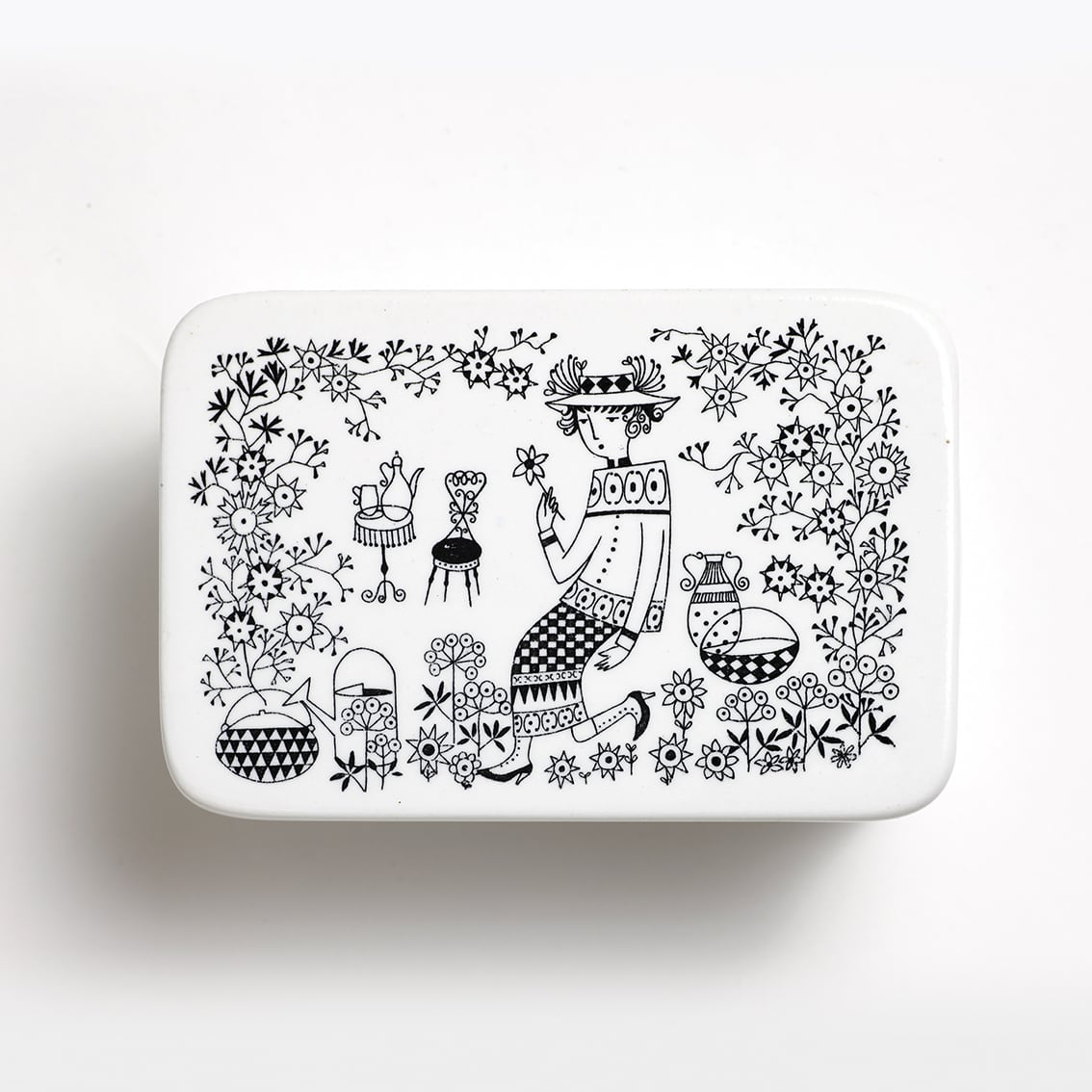 Kaj Franck(カイ・フランク)がデザインしたつややかな白地のフォルムにRaija Uosikkinen(ライヤ・ウオシッキネン)が繊細な黒い線でデコレート。モノクロとは思えない華やぎが感じられる作品です。描かれているのは帽子から靴まで全身おしゃれな女性。花を一輪、手にとって見つめるさまは、まるで物語のひとコマのようです。