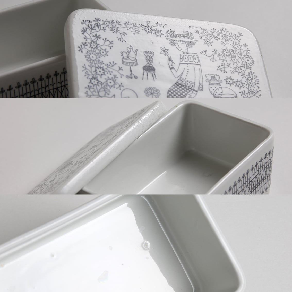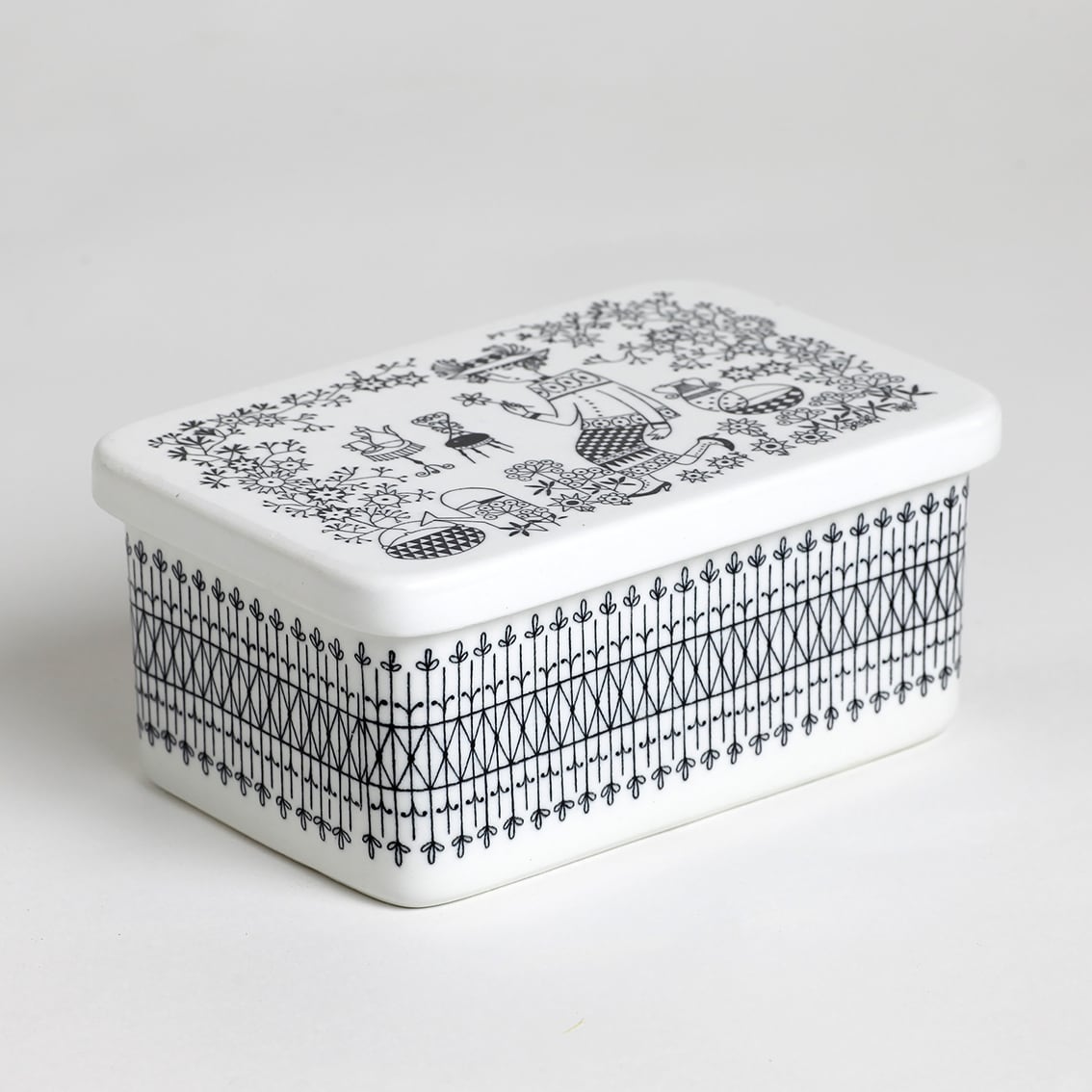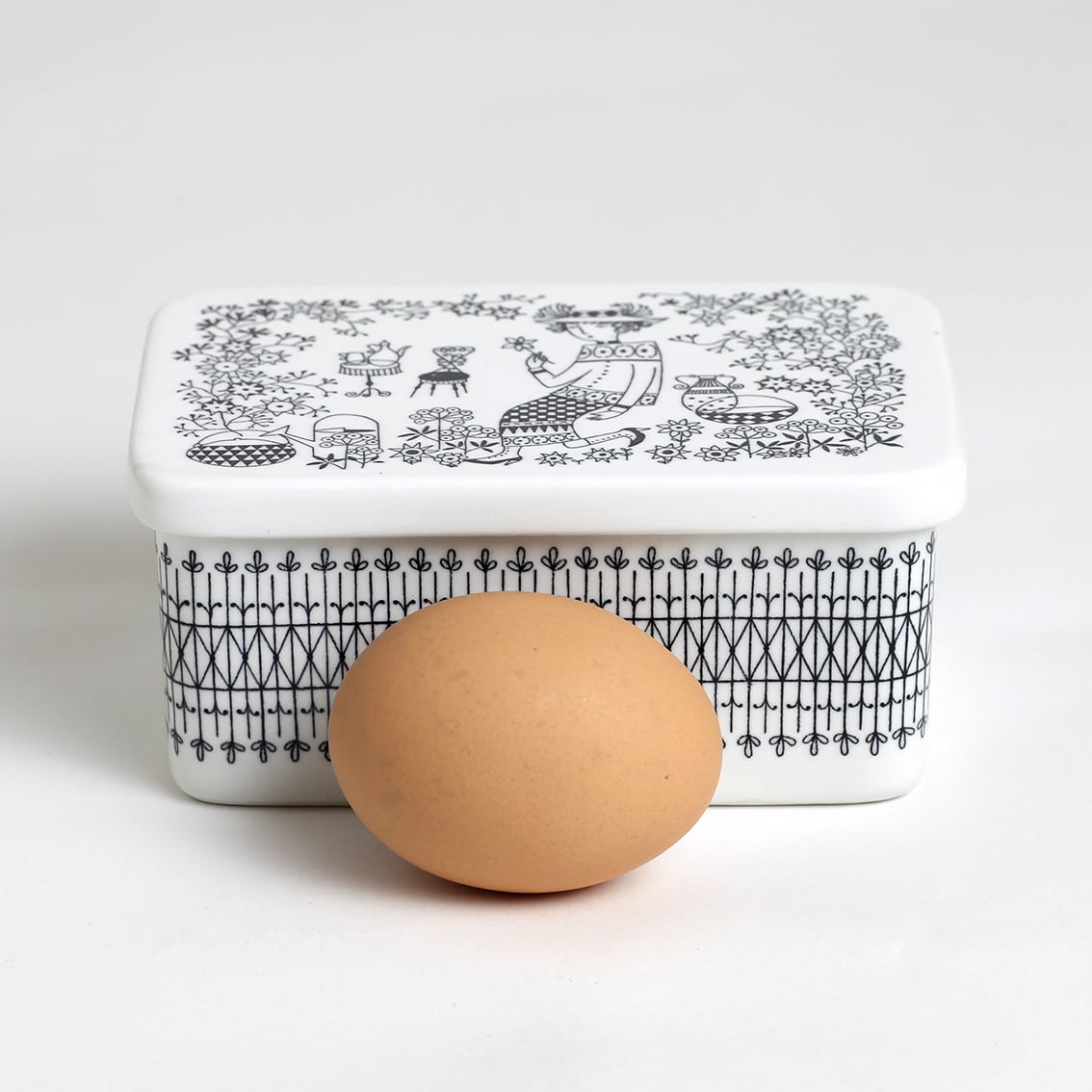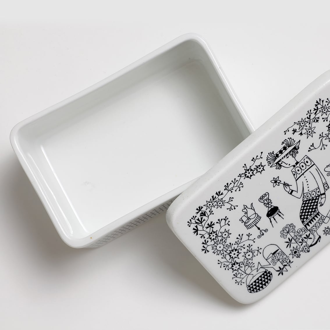 Kaj Franck(カイ・フランク)がデザインしたつややかな白地のフォルムにRaija Uosikkinen(ライヤ・ウオシッキネン)が繊細な黒い線でデコレート。モノクロとは思えない華やぎが感じられる作品です。描かれているのは帽子から靴まで全身おしゃれな女性。花を一輪、手にとって見つめるさまは、まるで物語のひとコマのようです。