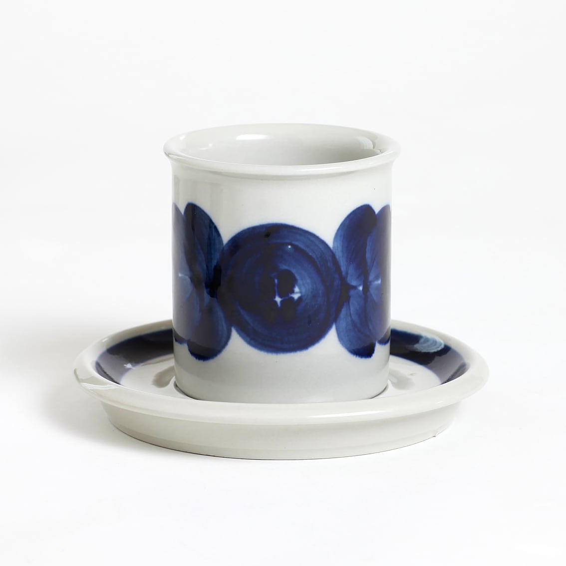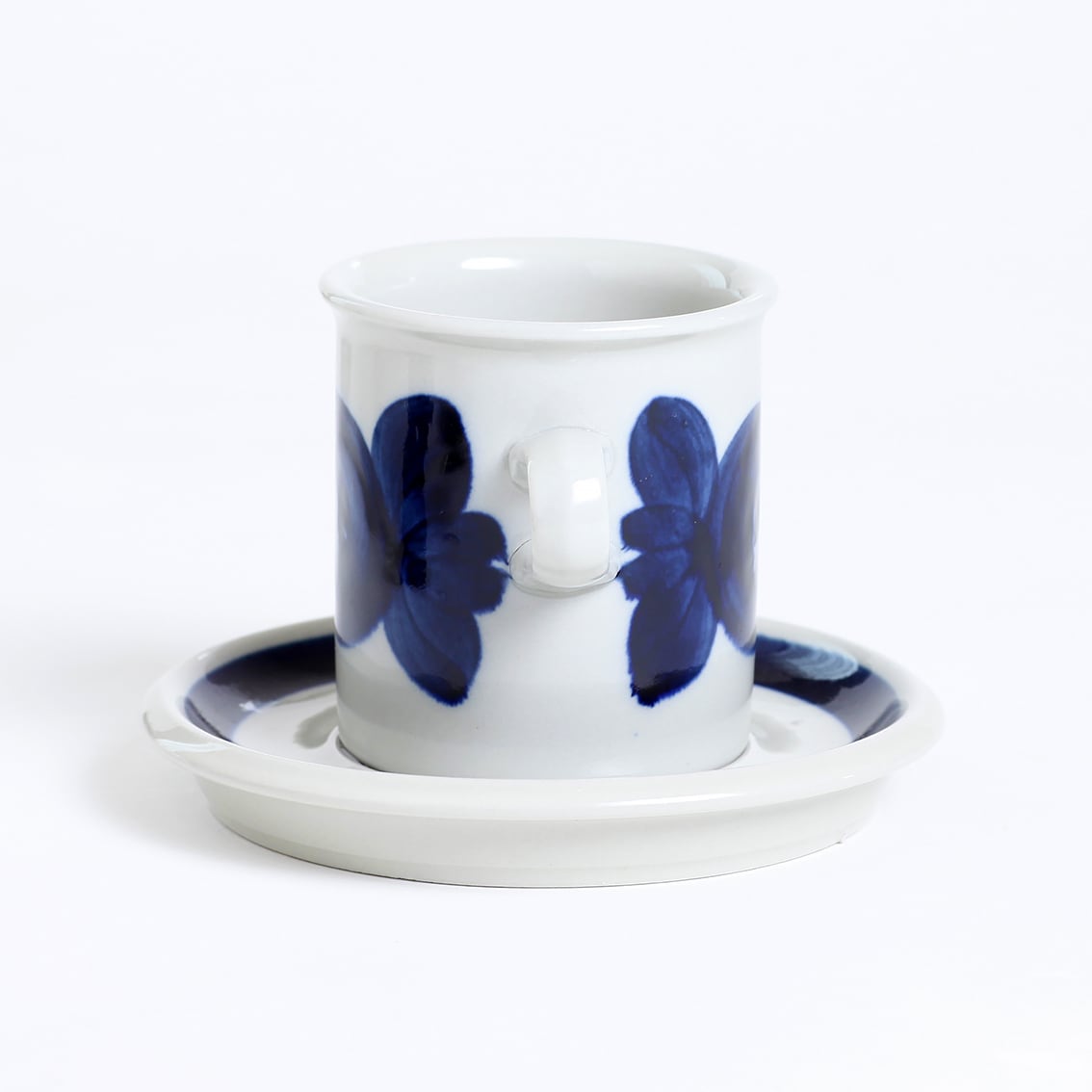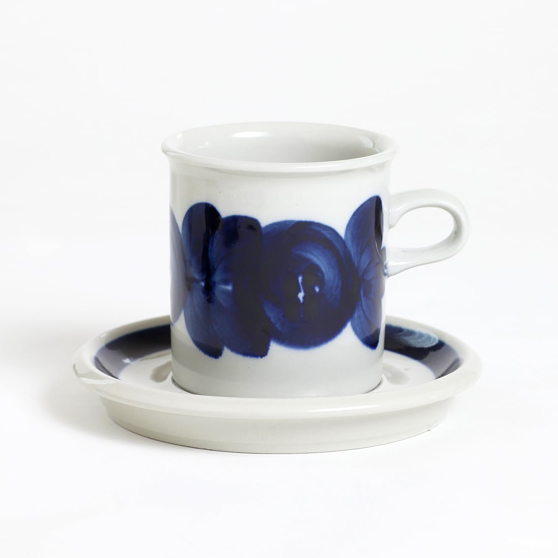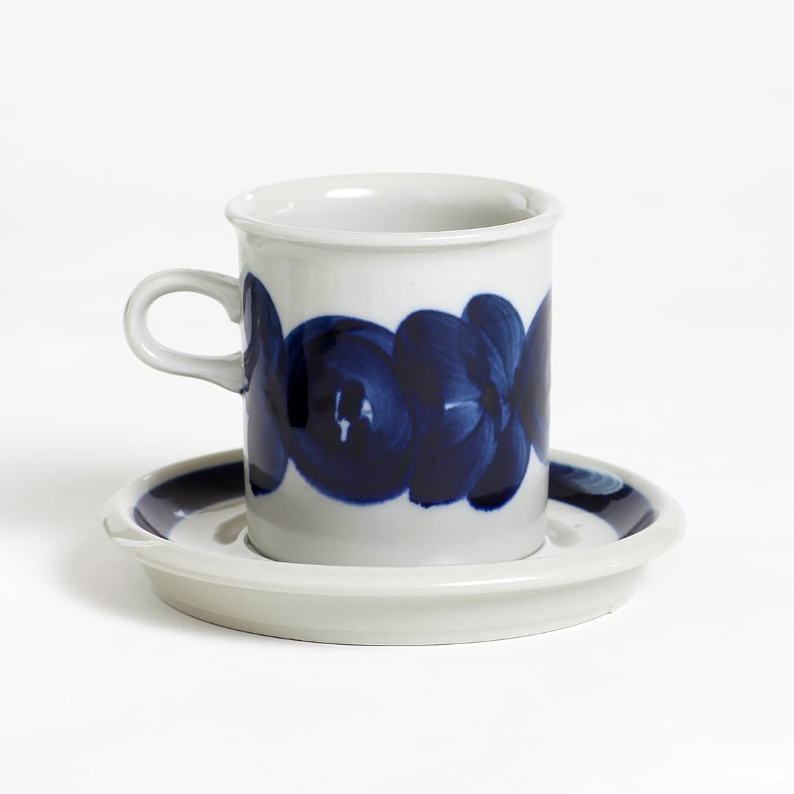 アラビアの代表的なデザイナーUlla Procope(ウラ・プロコペ)がデザインしたAnemone(アネモネ)シリーズの70mm コーヒー カップ&ソーサーです。ブルーベリーのような深みのある青が大変美しく、一点一点手描きされた丸い花柄は大胆で伸びやか。絵筆の余韻を感じさせるやわらかな絵柄をソーサーの太いストライプがきりりと引き締めています。