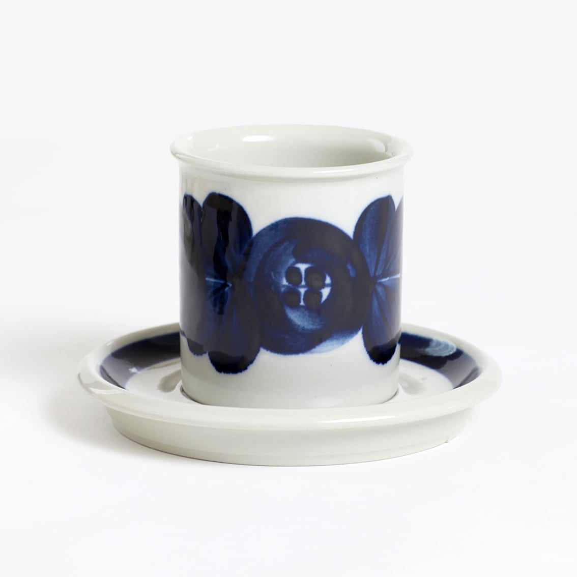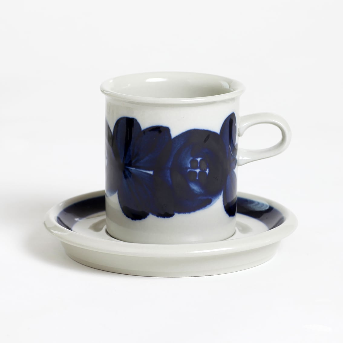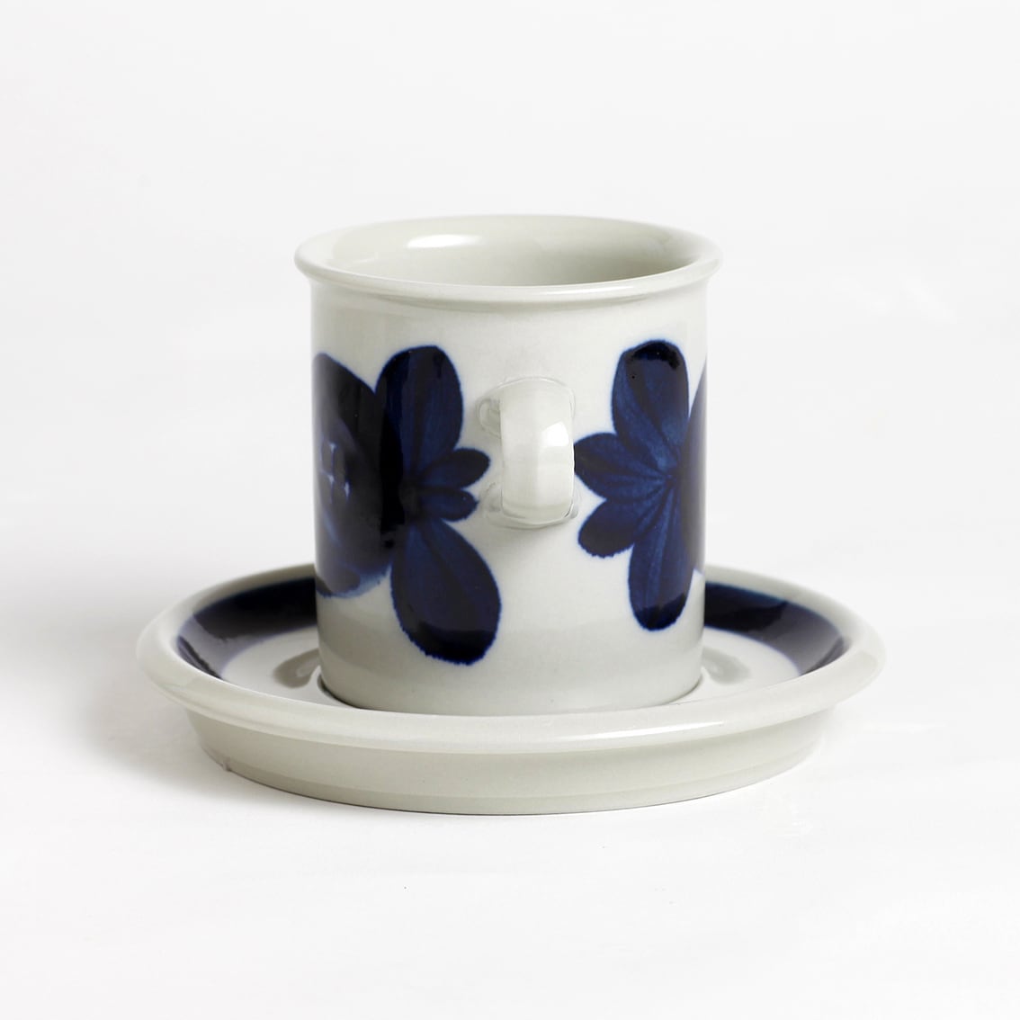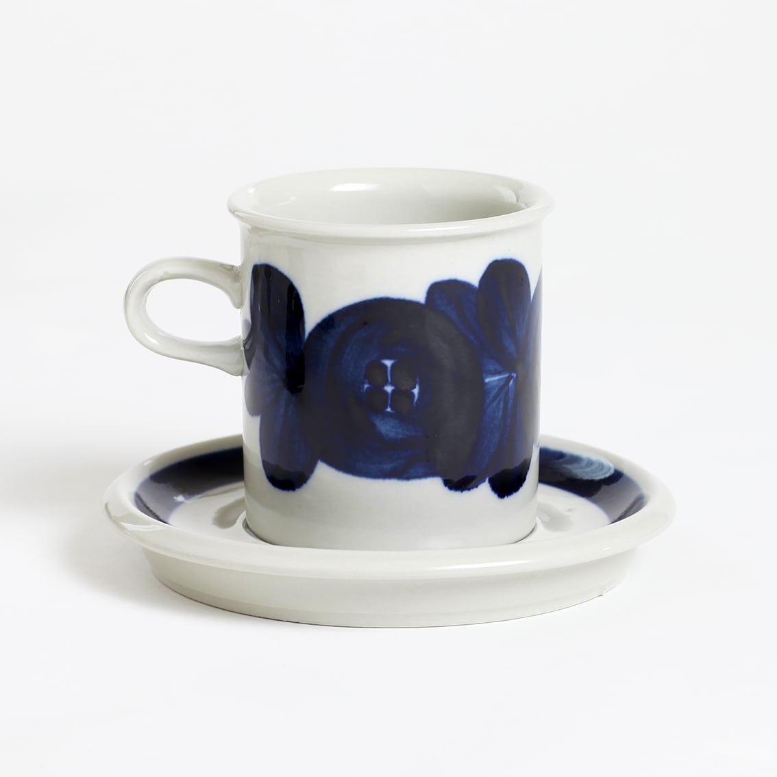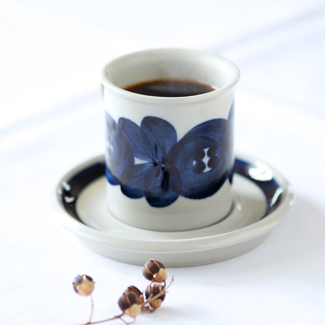 アラビアの代表的なデザイナーUlla Procope(ウラ・プロコペ)がデザインしたAnemone(アネモネ)シリーズの70mm コーヒー カップ&ソーサーです。ブルーベリーのような深みのある青が大変美しく、一点一点手描きされた丸い花柄は大胆で伸びやか。絵筆の余韻を感じさせるやわらかな絵柄をソーサーの太いストライプがきりりと引き締めています。