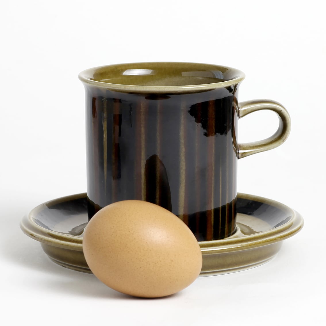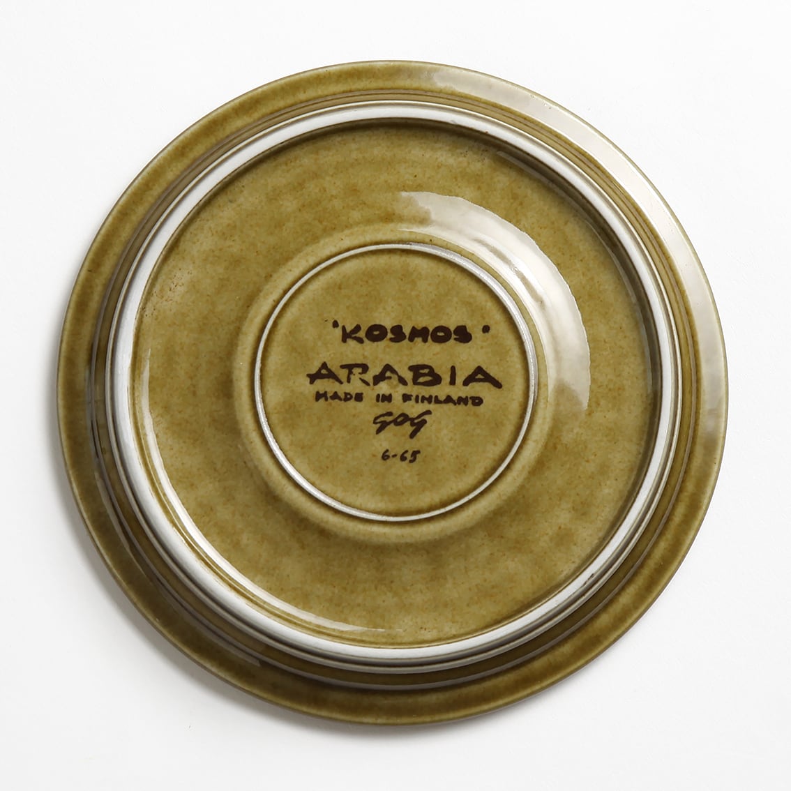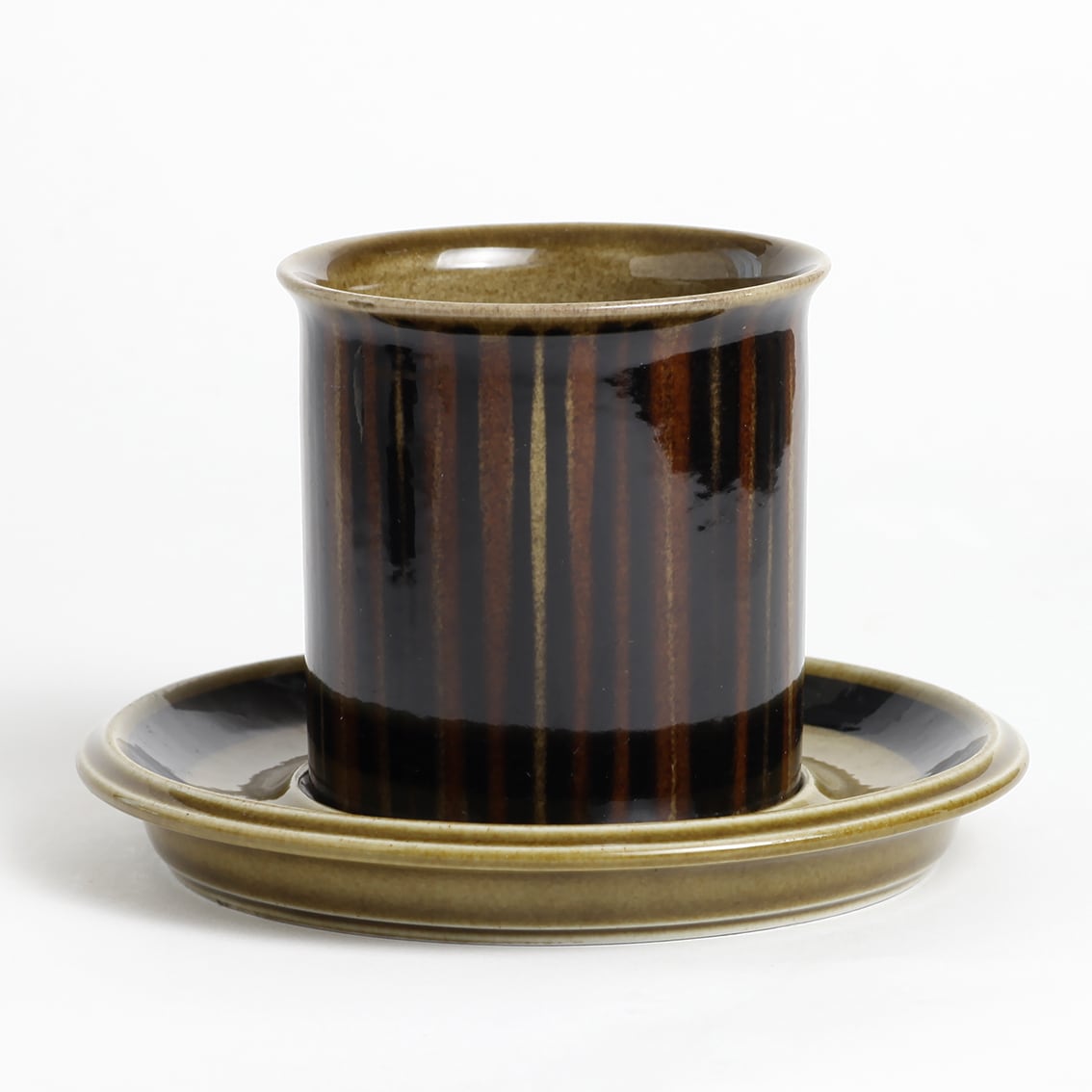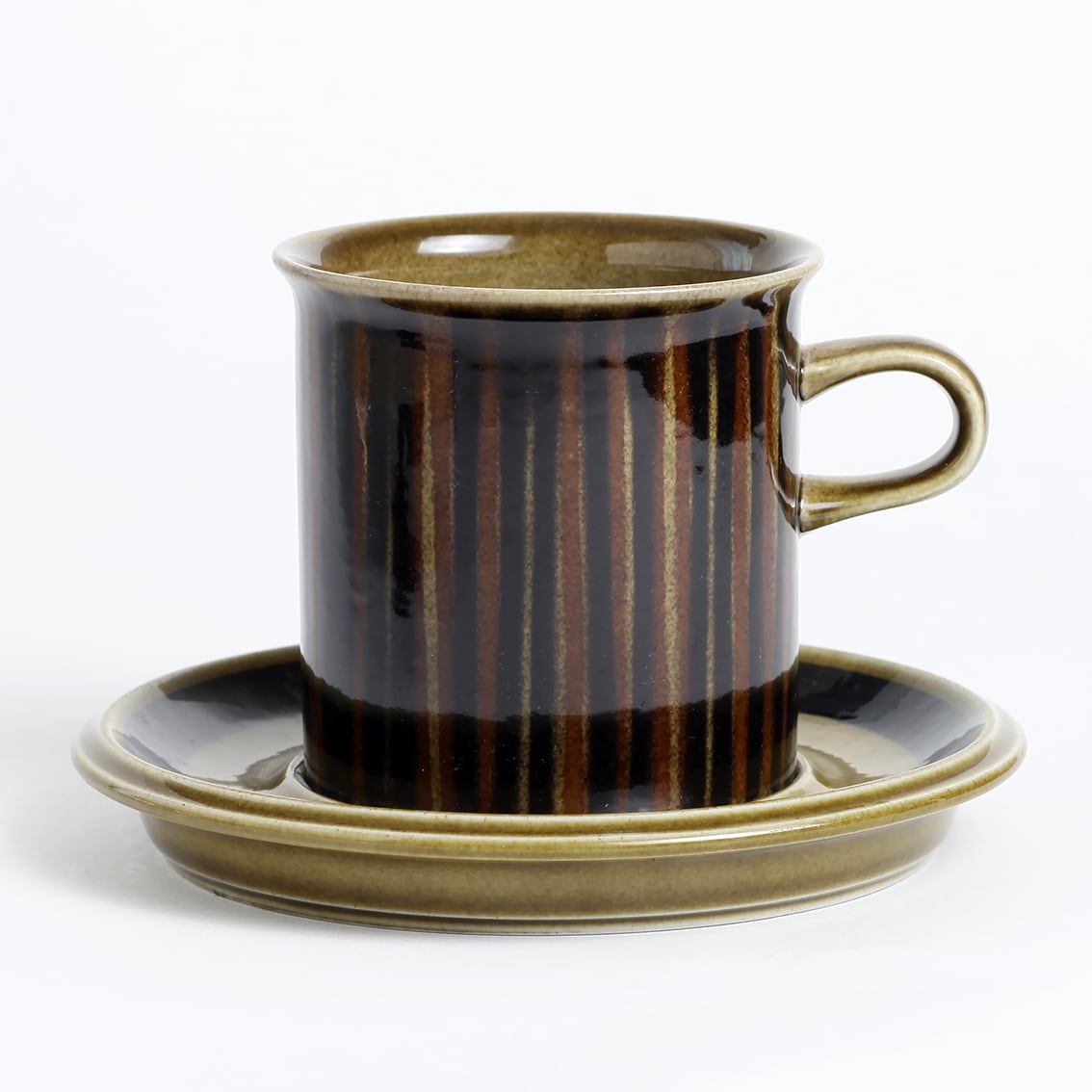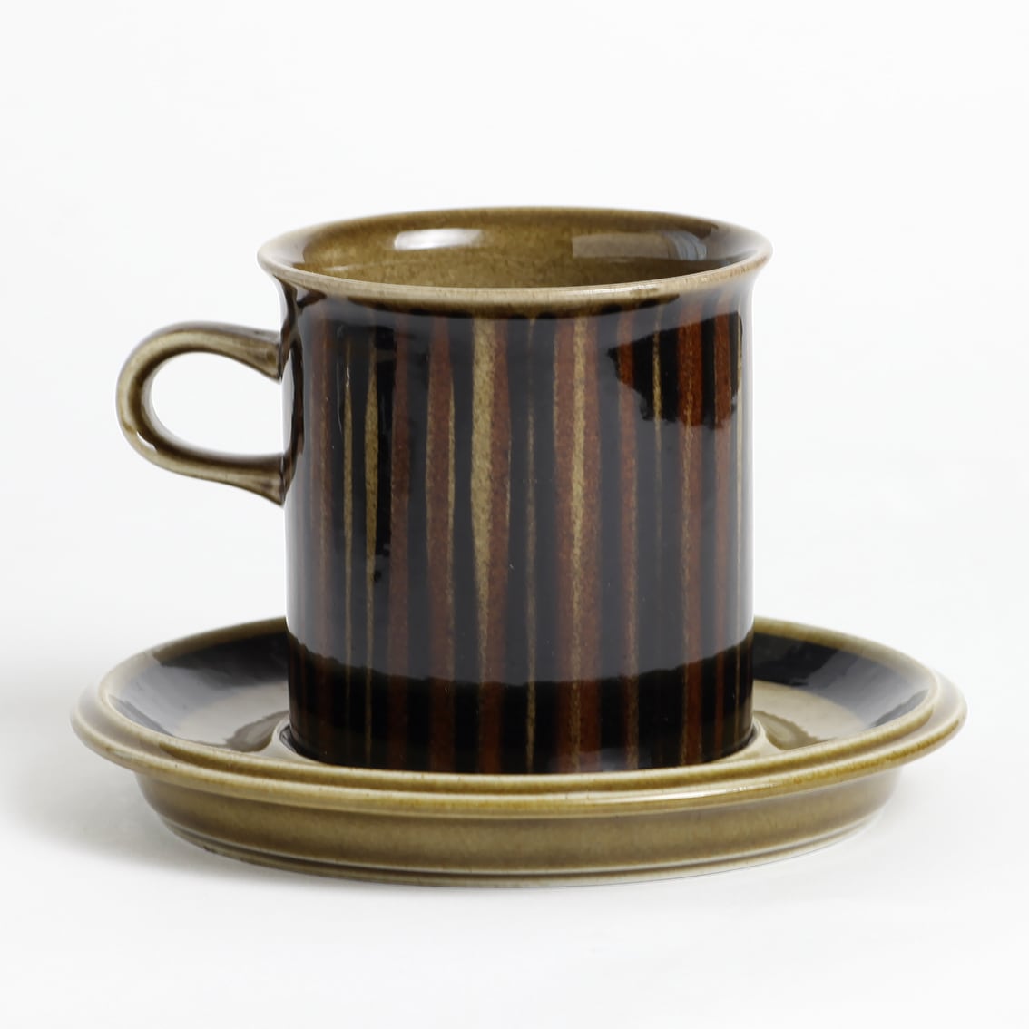 デザインはグンヴァル・オリン・グラングヴィスト。オリーブブラウンの地にランダムな縦のストライプが手描きされており、ソーサーは花のように見えます。フォルムデザインはウラ・プロコペ。コスモスシリーズは2色展開で青も作られました。こちらは落ち着いた色調で温かみのあるブラウン系です。