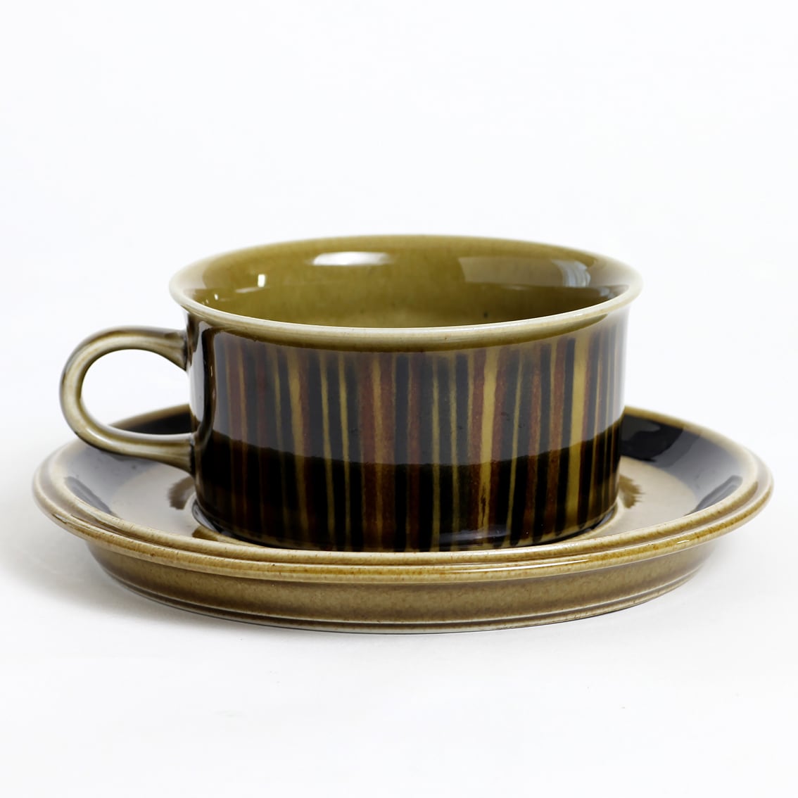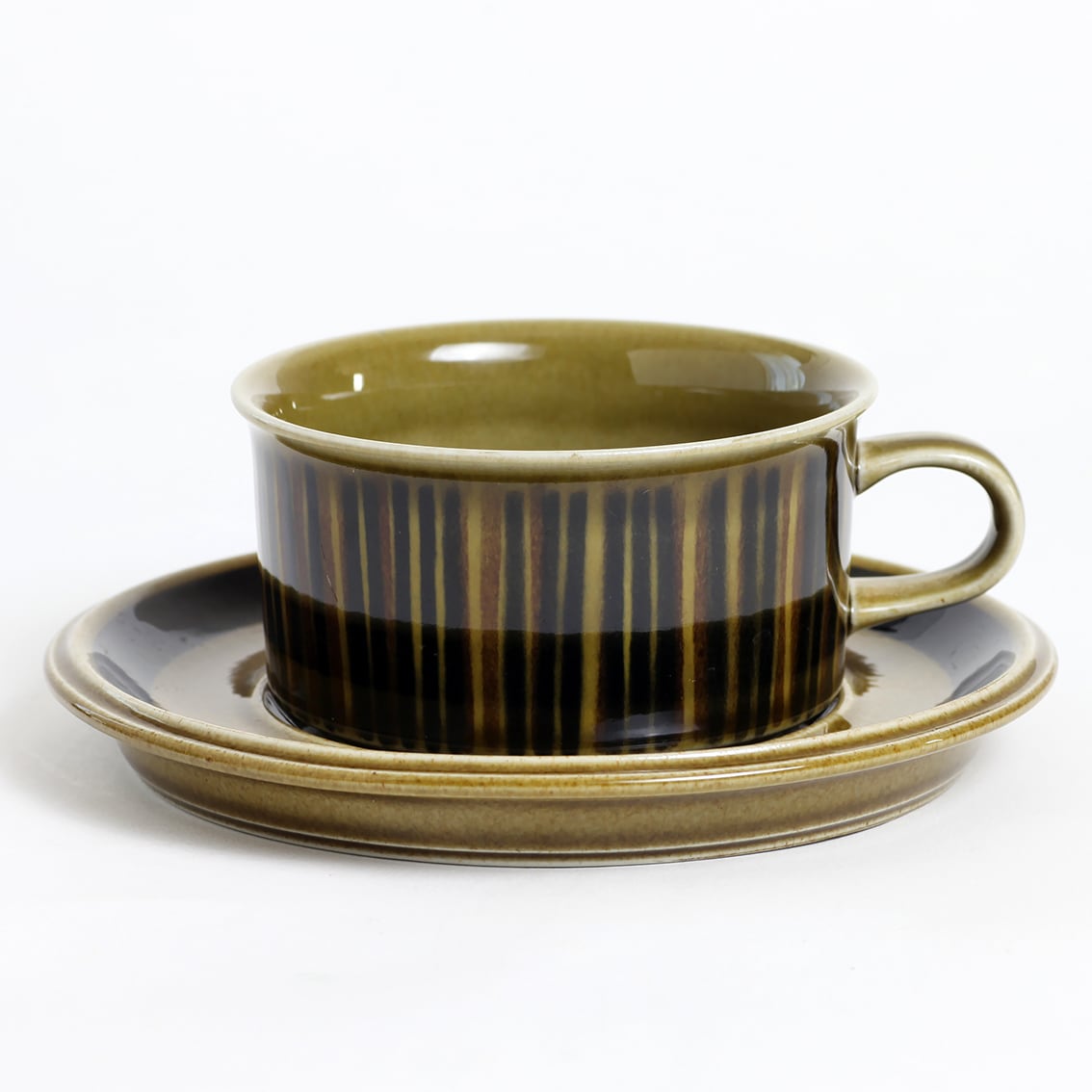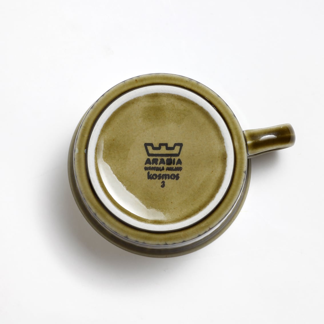 デザインはグンヴァル・オリン・グラングヴィスト。オリーブブラウンの地にランダムな縦のストライプが手描きされており、ソーサーは花のように見えます。フォルムデザインはウラ・プロコペ。コスモスシリーズは2色展開で青も作られました。こちらは落ち着いた色調で温かみのあるブラウン系です。