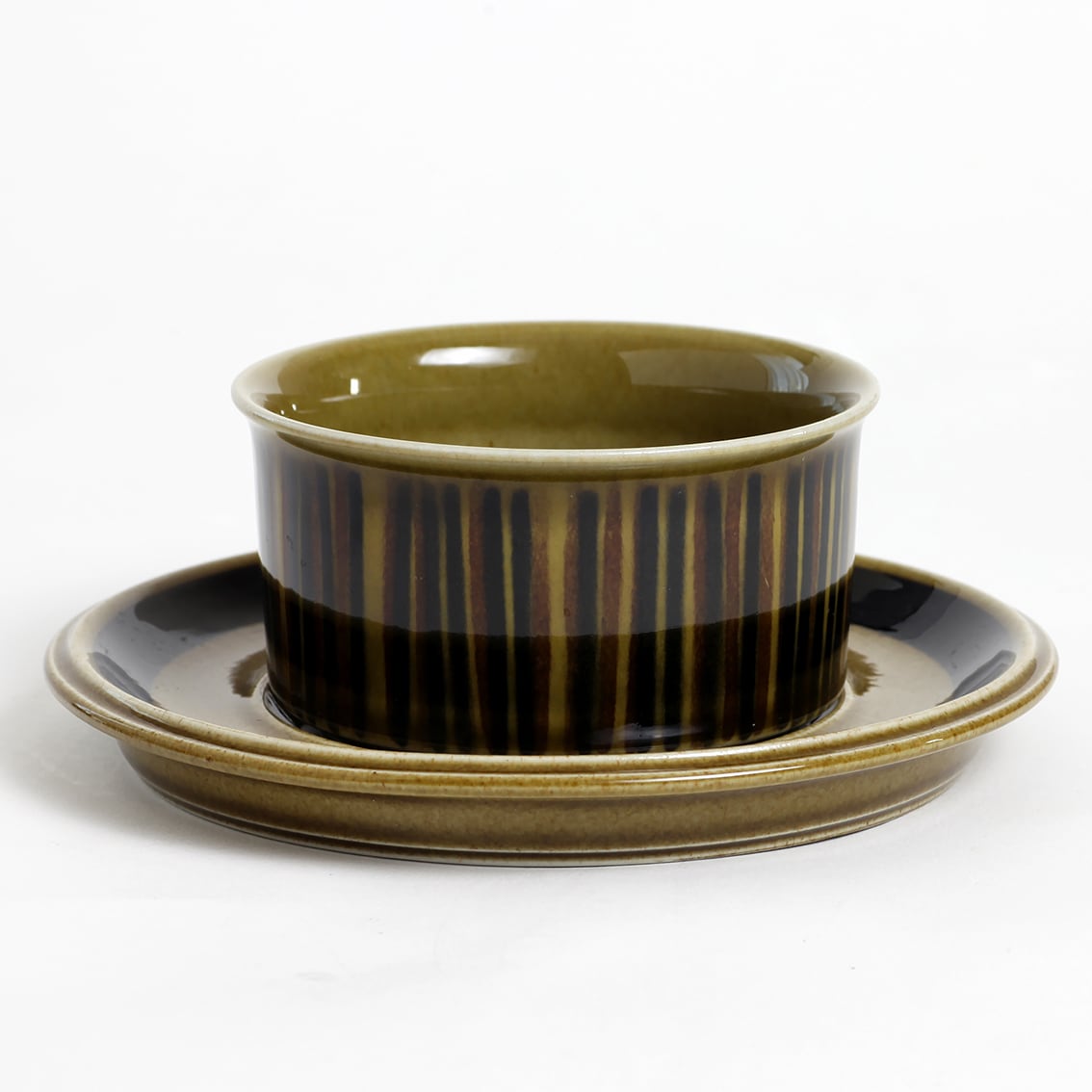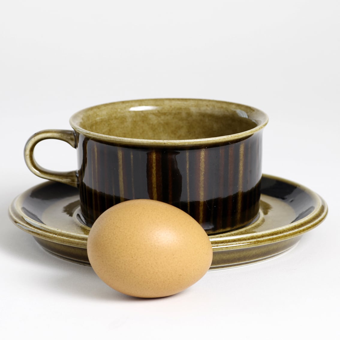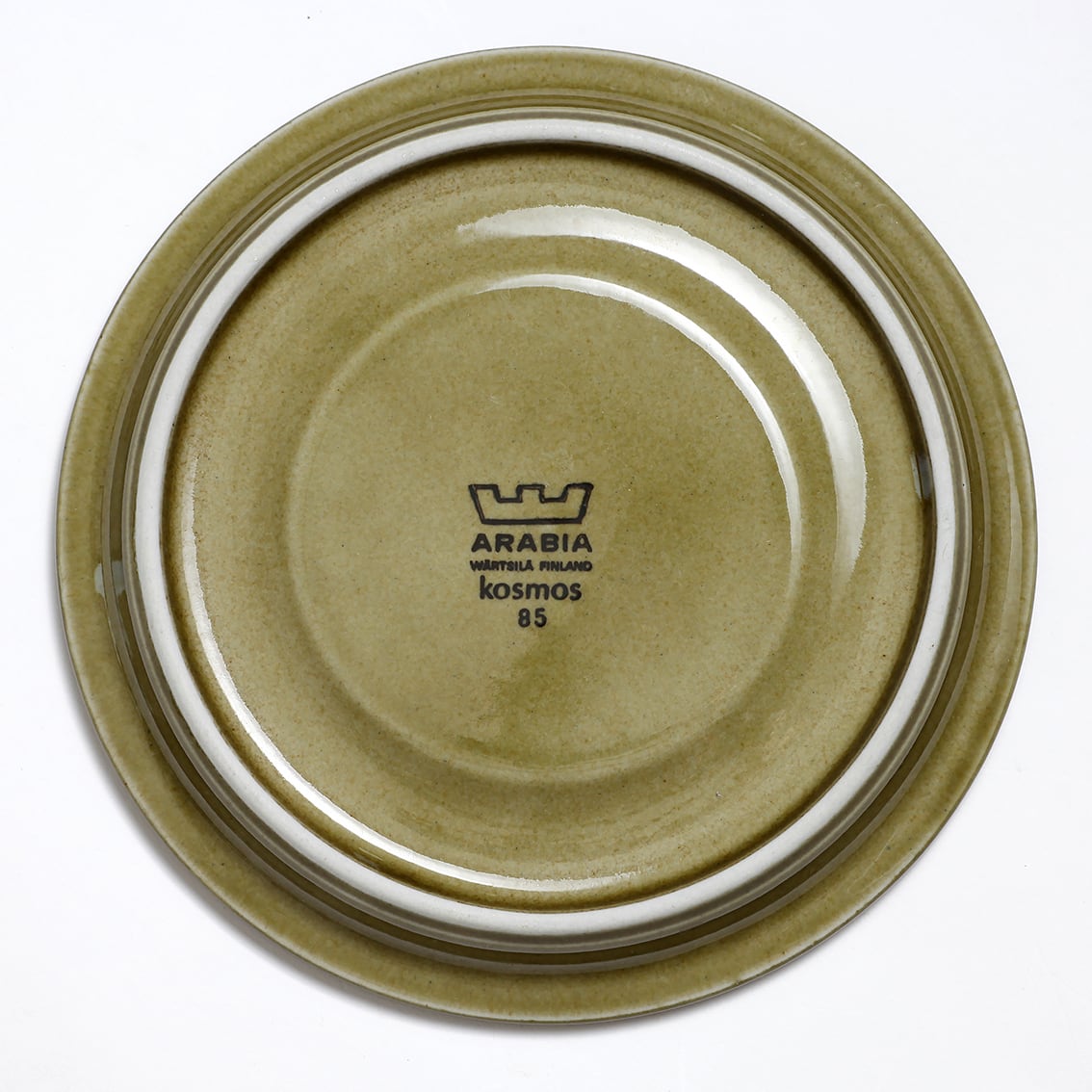 デザインはグンヴァル・オリン・グラングヴィスト。オリーブブラウンの地にランダムな縦のストライプが手描きされており、ソーサーは花のように見えます。フォルムデザインはウラ・プロコペ。コスモスシリーズは2色展開で青も作られました。こちらは落ち着いた色調で温かみのあるブラウン系です。